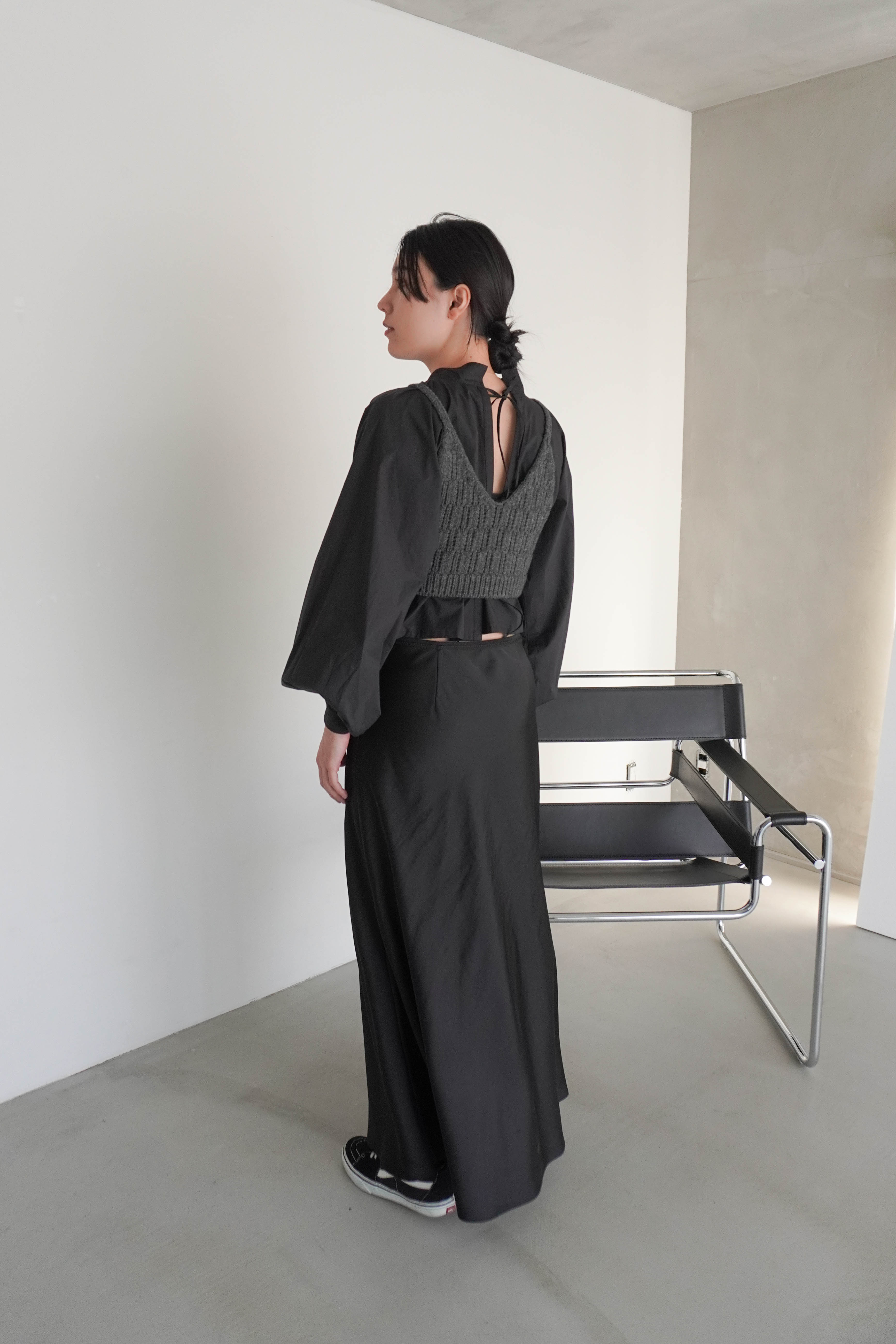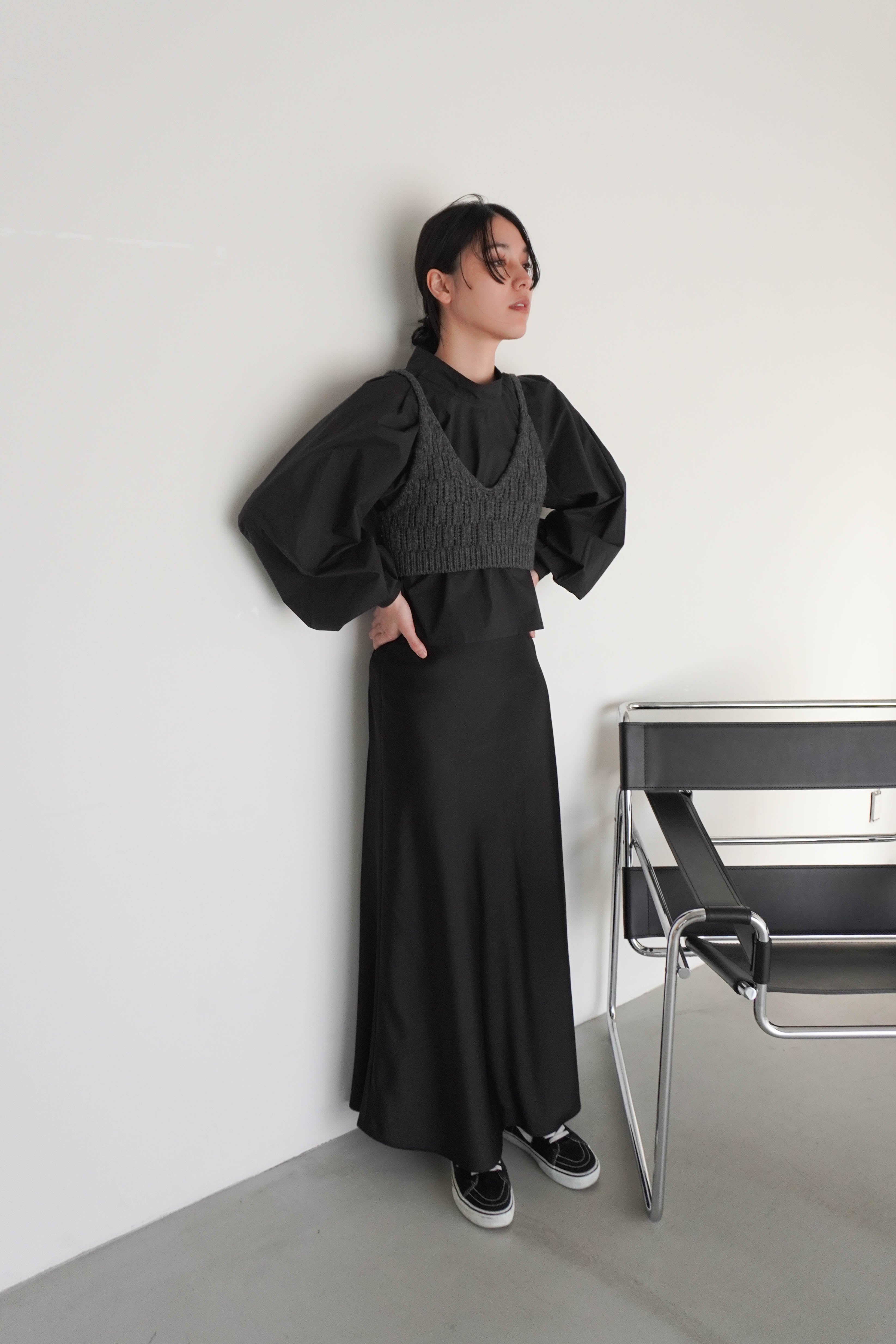 オールブラックスタイル。ワントーンでも異素材を使いつつ、ニットベストのレイヤードがポイント。