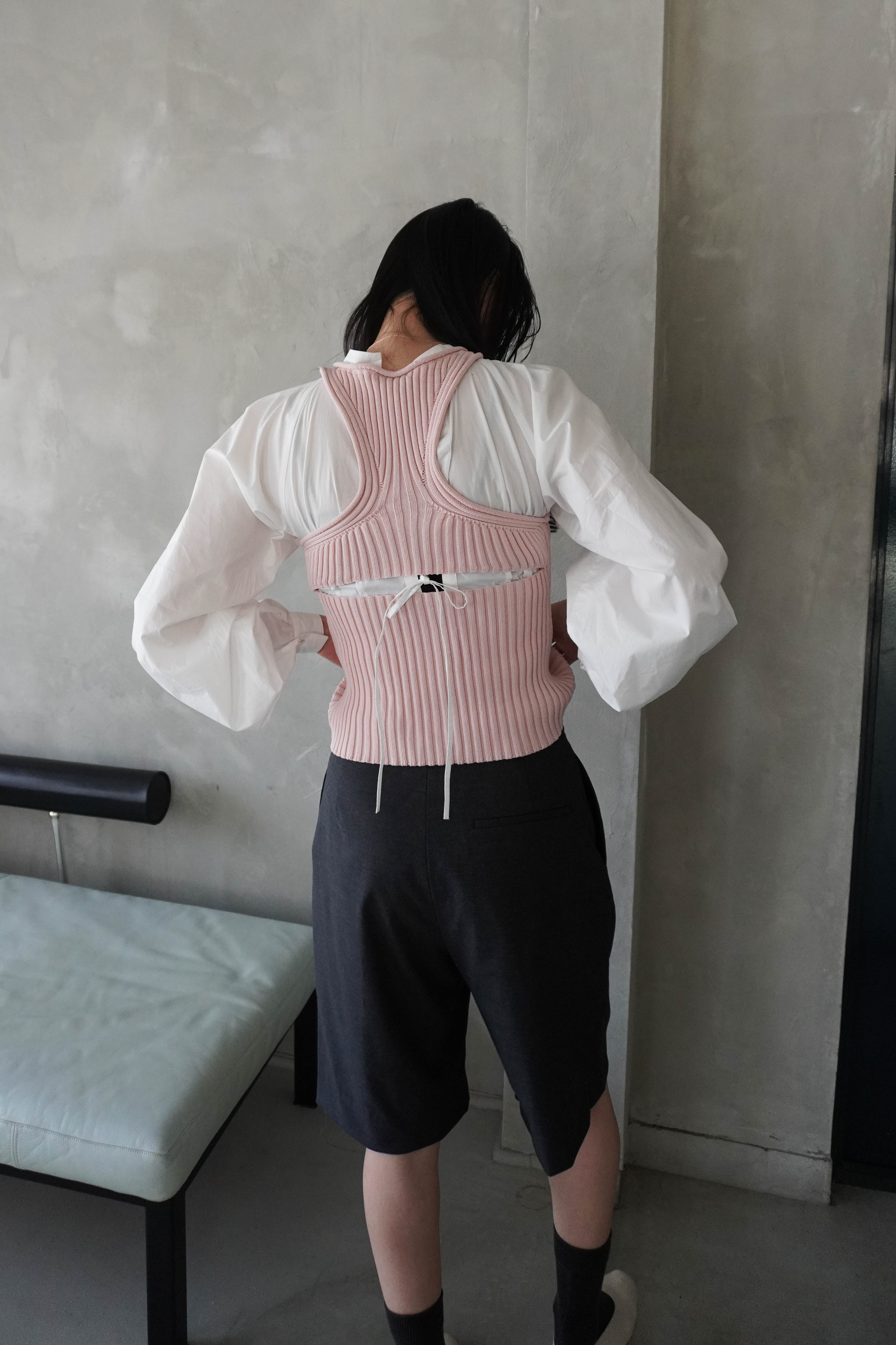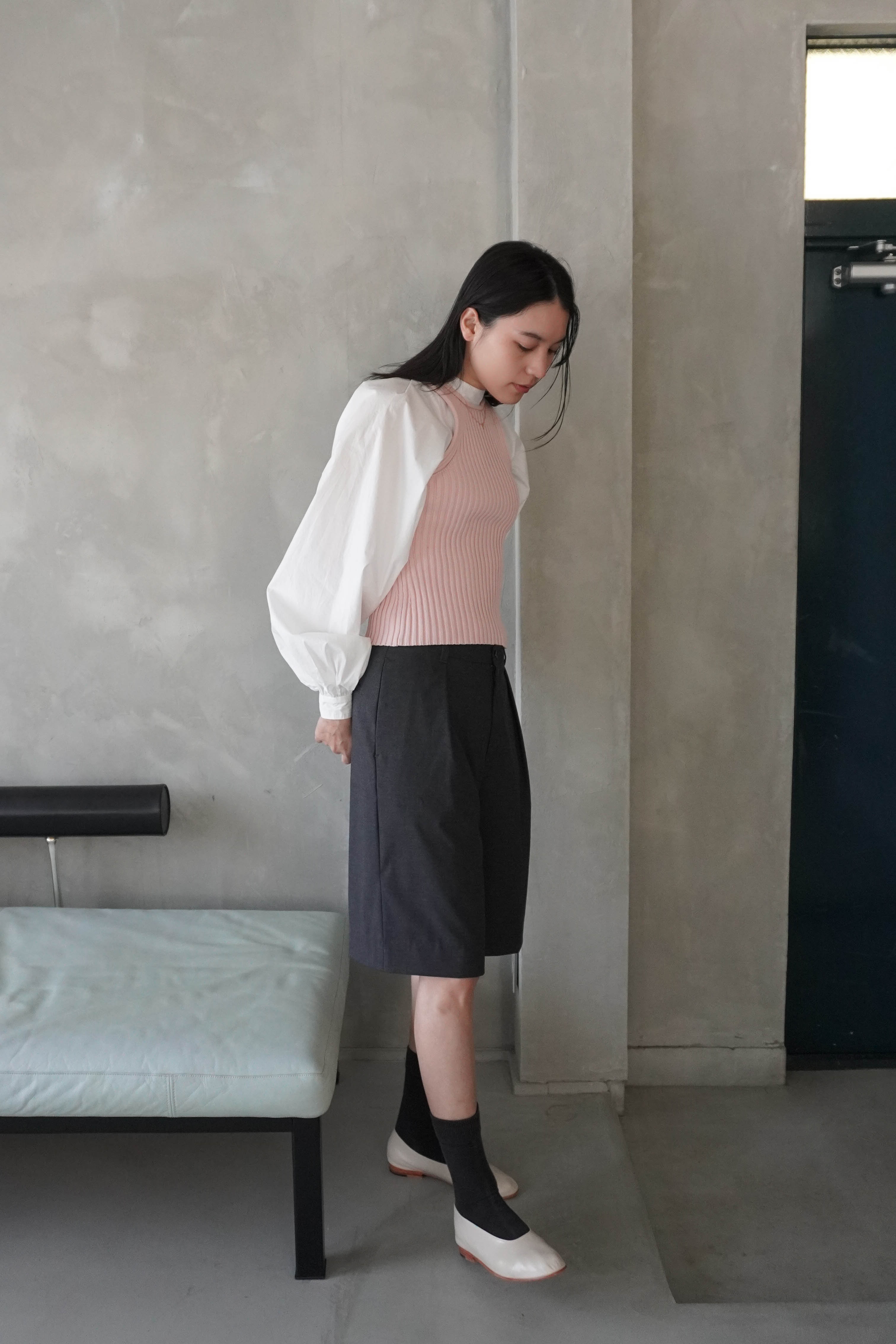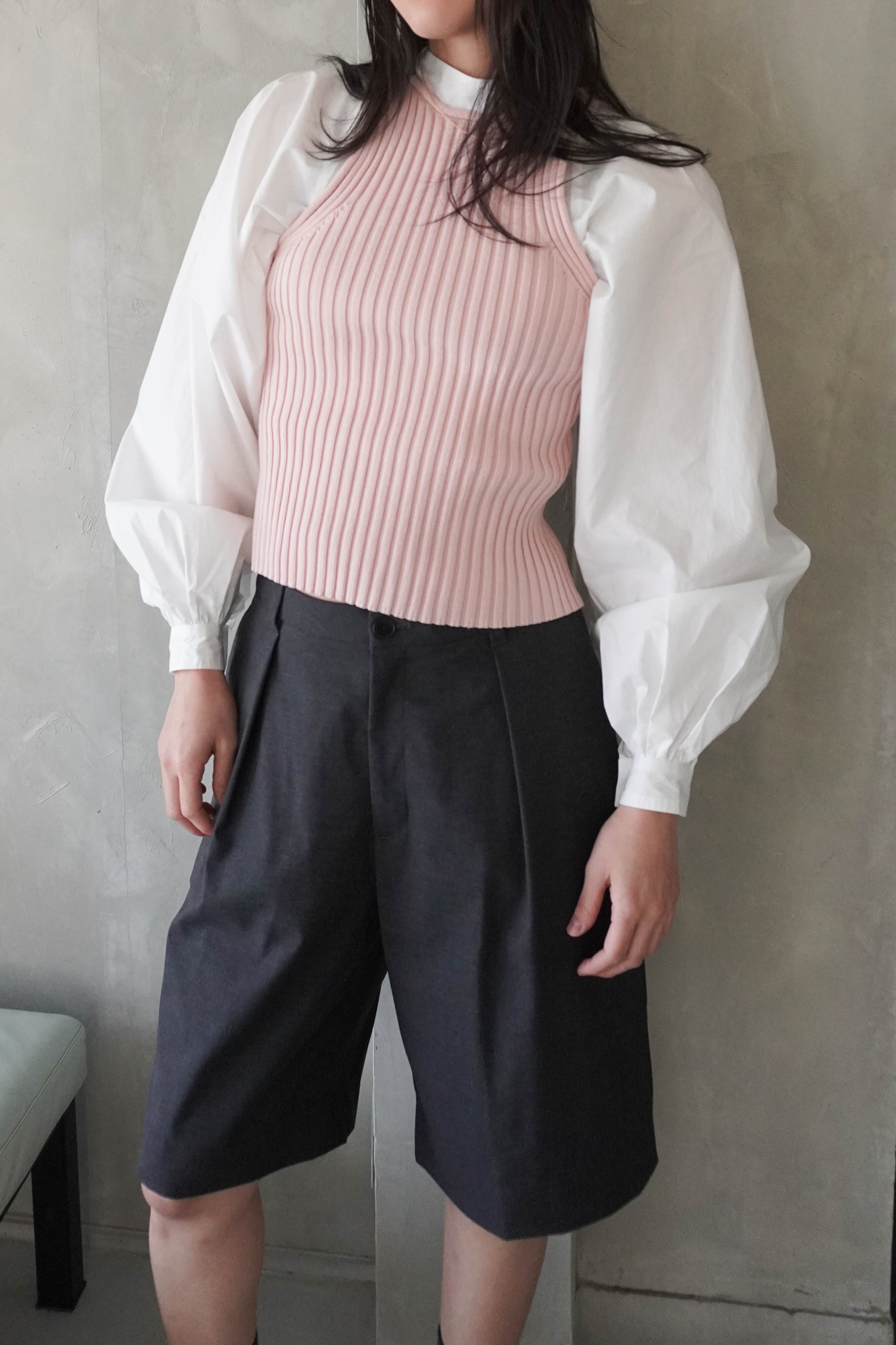 シャツとハーフパンツで上品スタイル。ピンクのトップスをレイヤードし、爽やかな印象に。