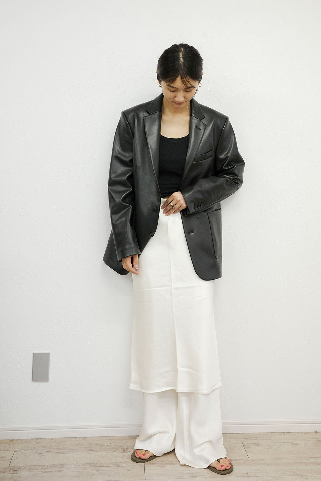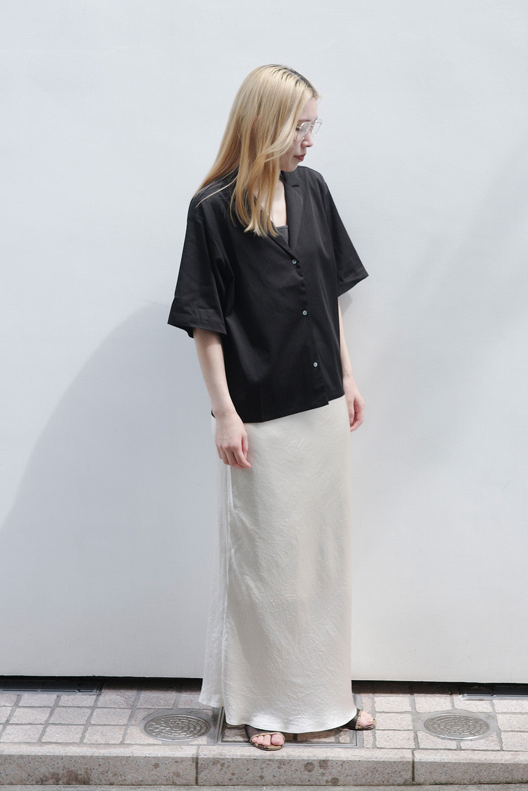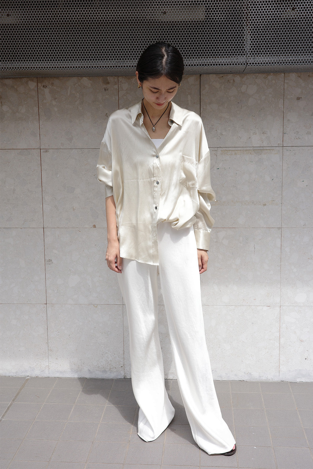 サテンならではの薄すぎない肉感と、とろみのある質感が心地良い1枚。 落ち感のあるシルエットはエレガントな抜け感を演出します。