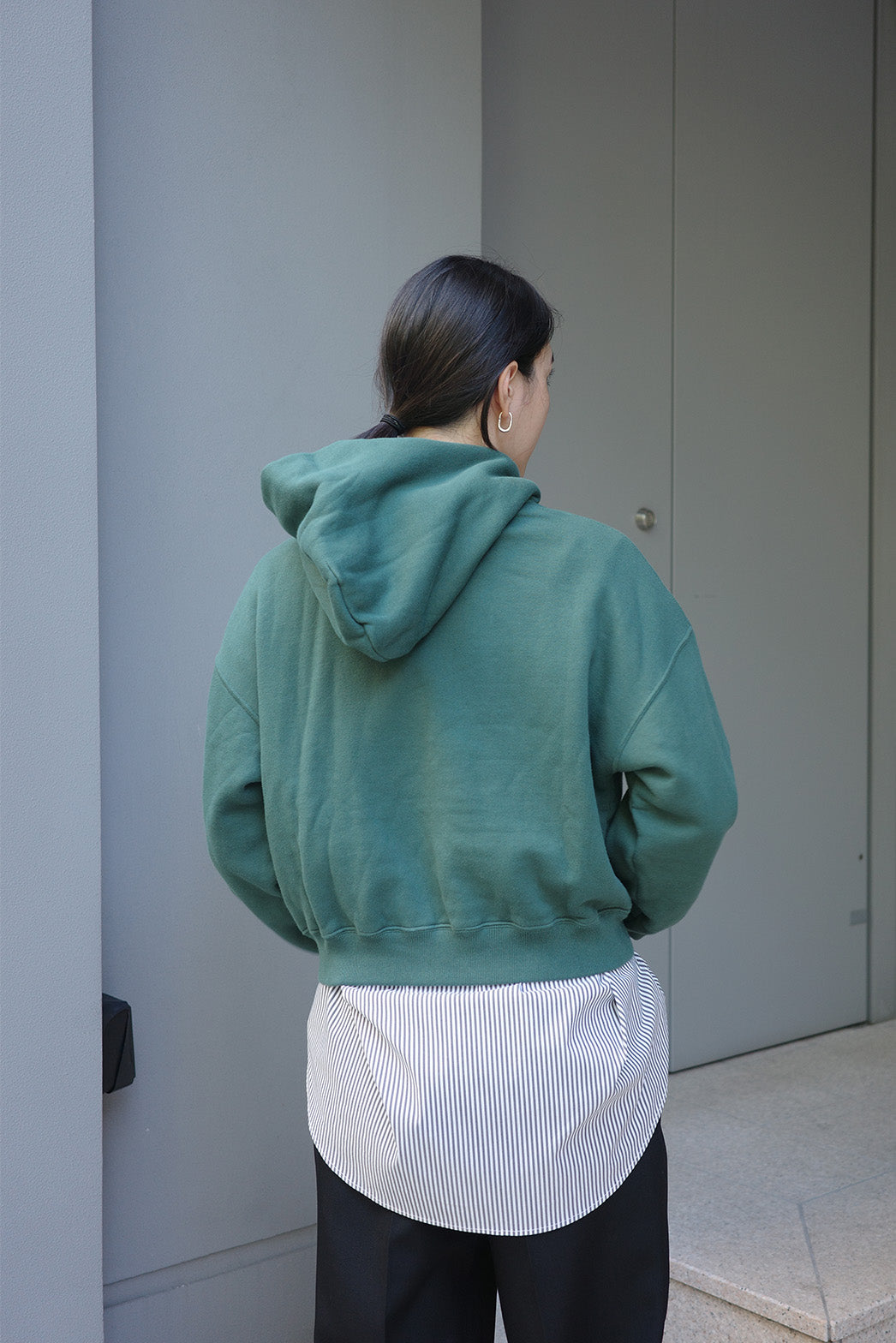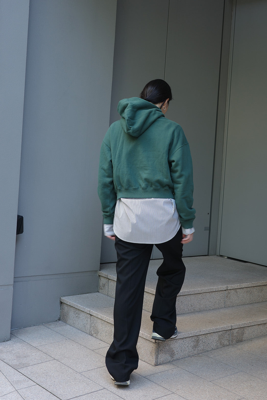 ストライプシャツとグリーンの配色が秋らしい組み合わせ。 スウェットはシャツとレイヤードしてカジュアルになりすぎないように。