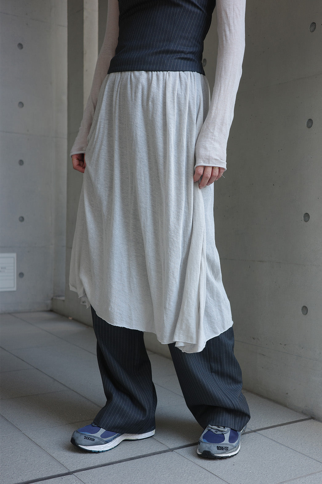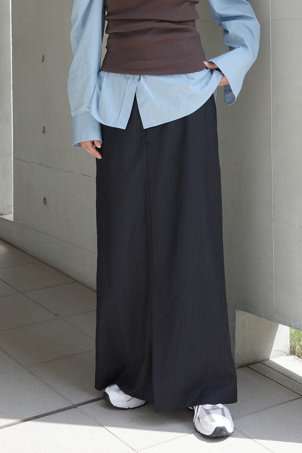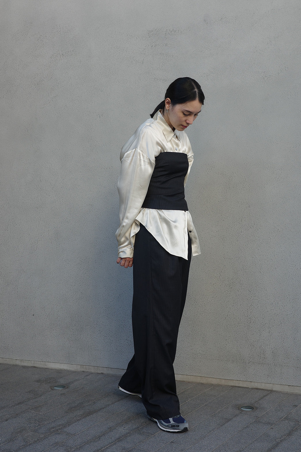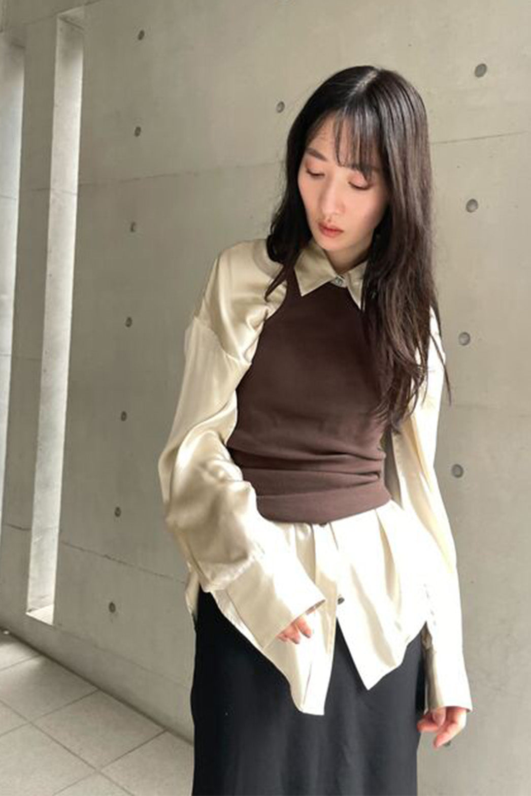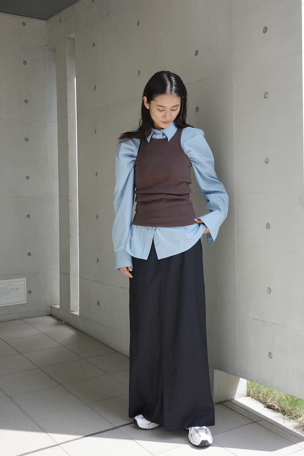 シャツ×スカートの定番の組み合わせに、ベスト風にタンクトップをレイヤード。 スリットスカートと相性抜群です。