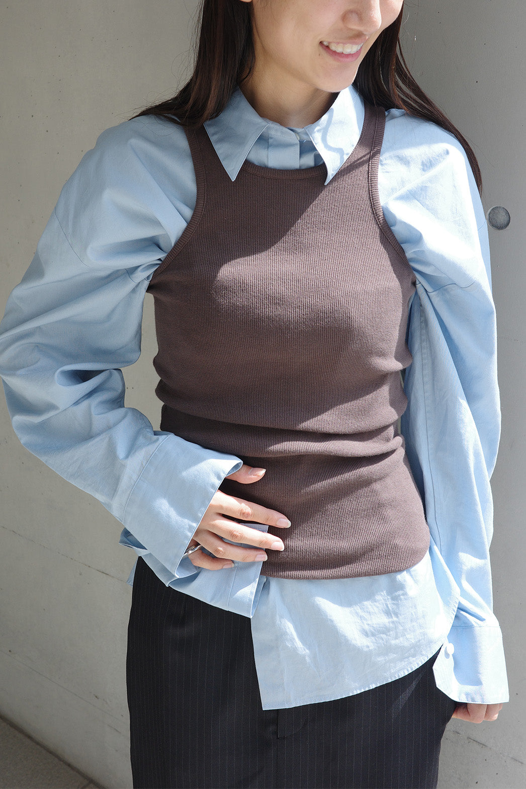 シャツにタンクトップをレイヤードする今年らしいスタイリング。 ブルーシャツも、ブラウンのタンクを合わせることで秋口にも着れます。