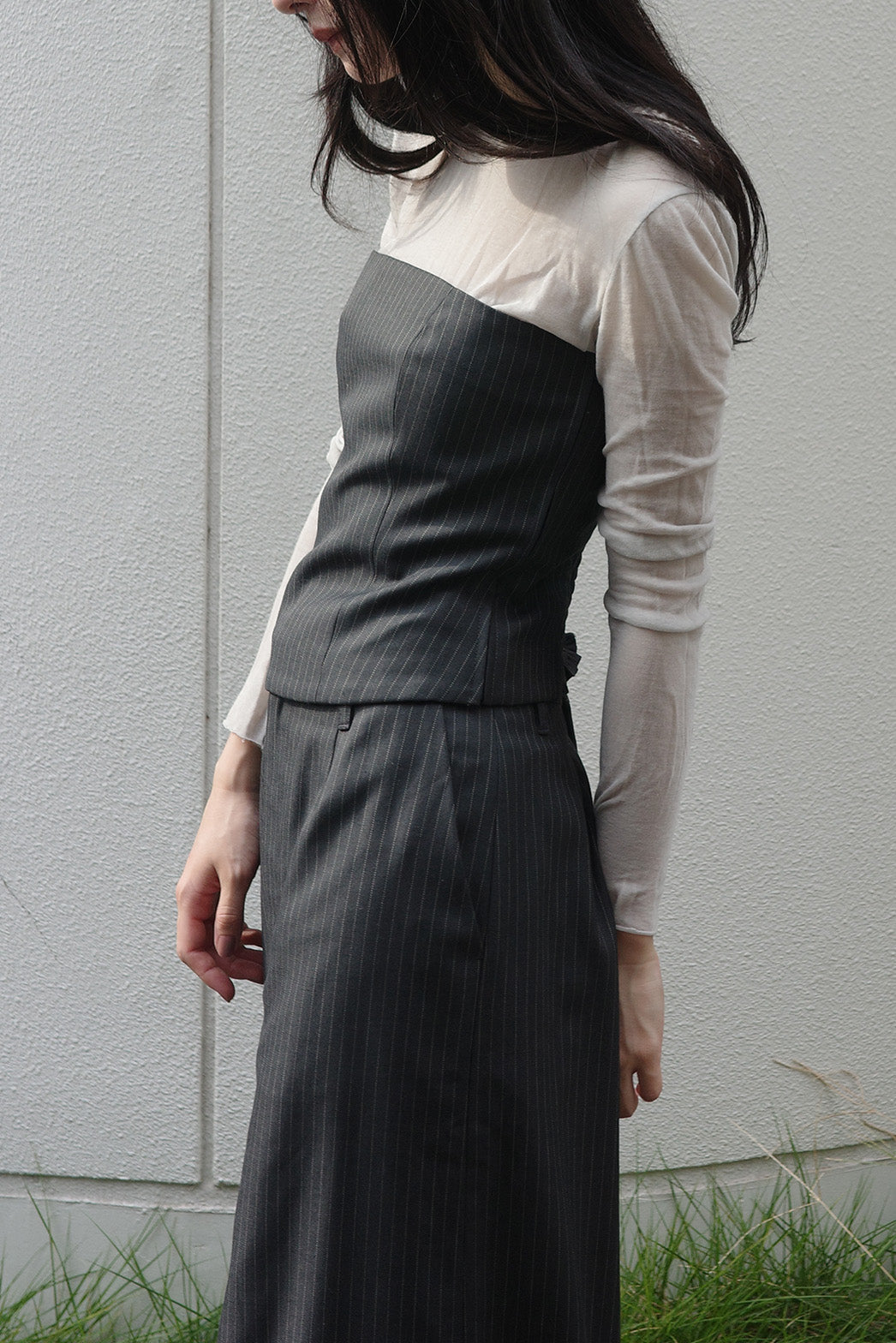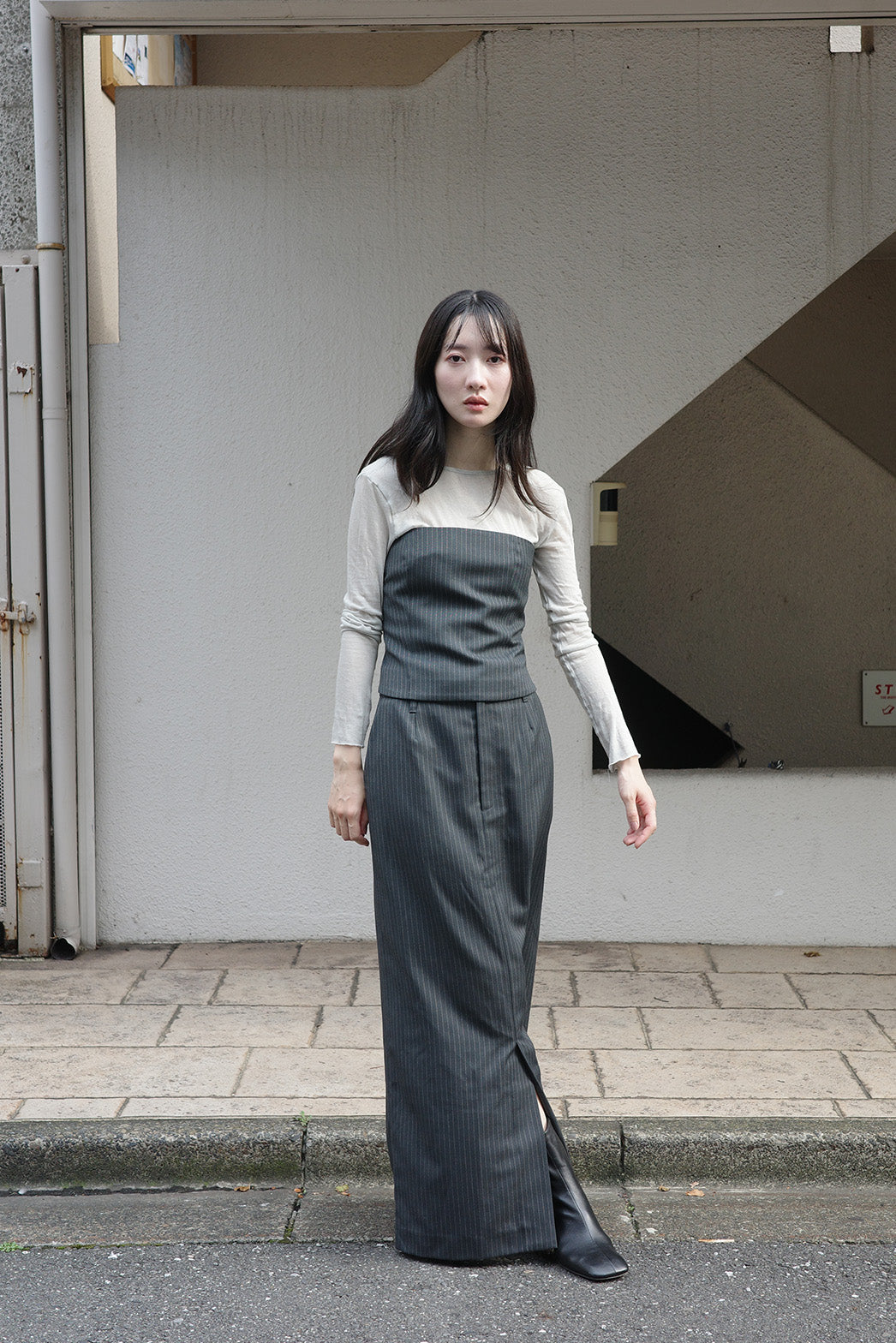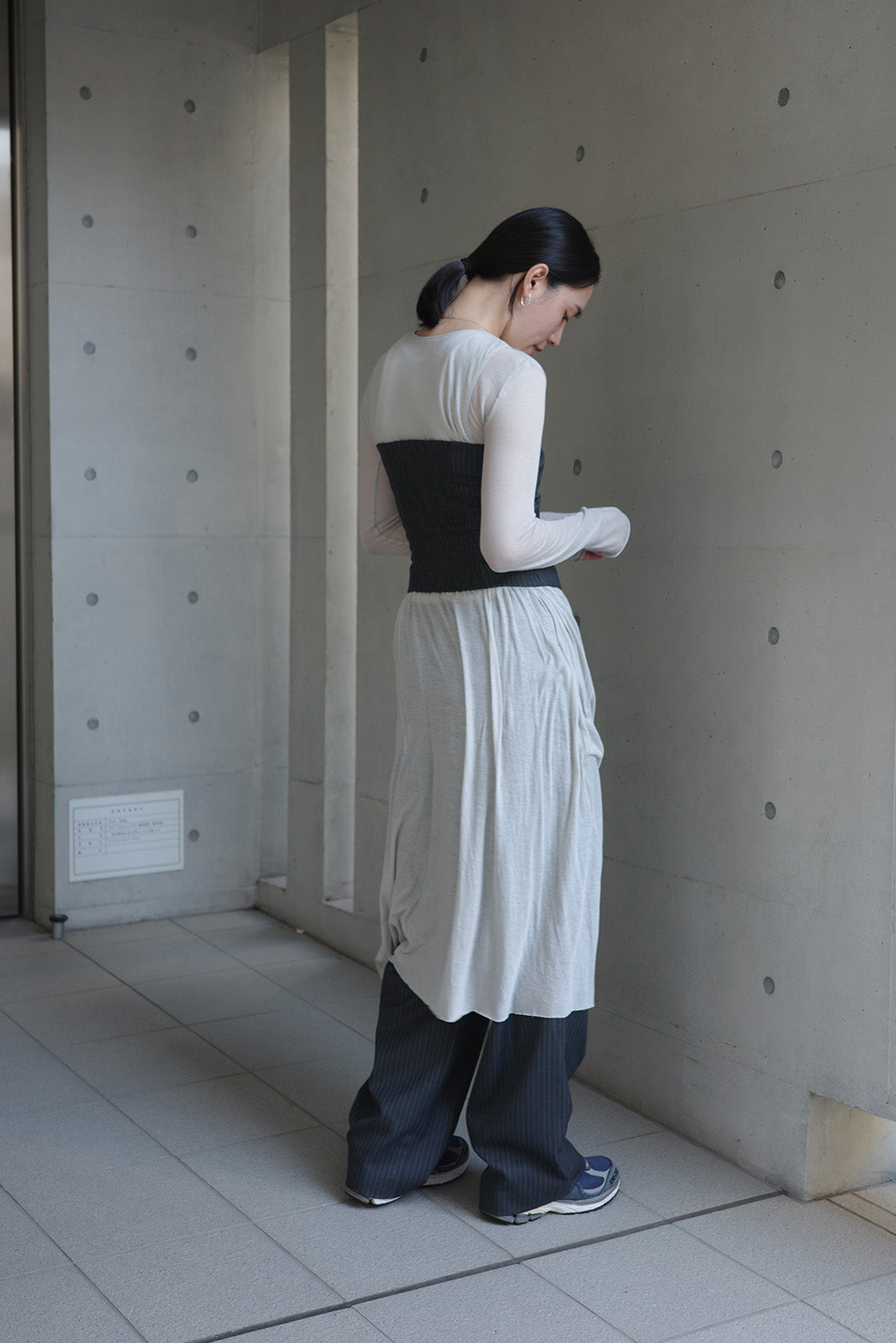 共生地のビスチェとスカートをセットアップでワンピース風に着ました。同系色のシアートップスでトーンを合わせました。