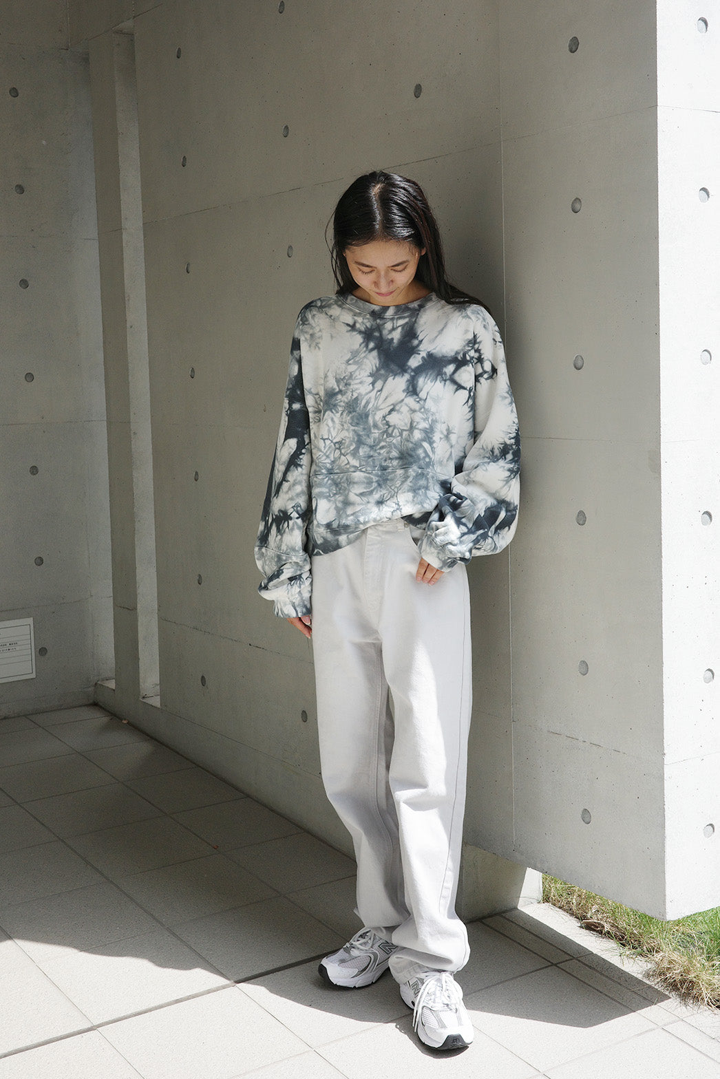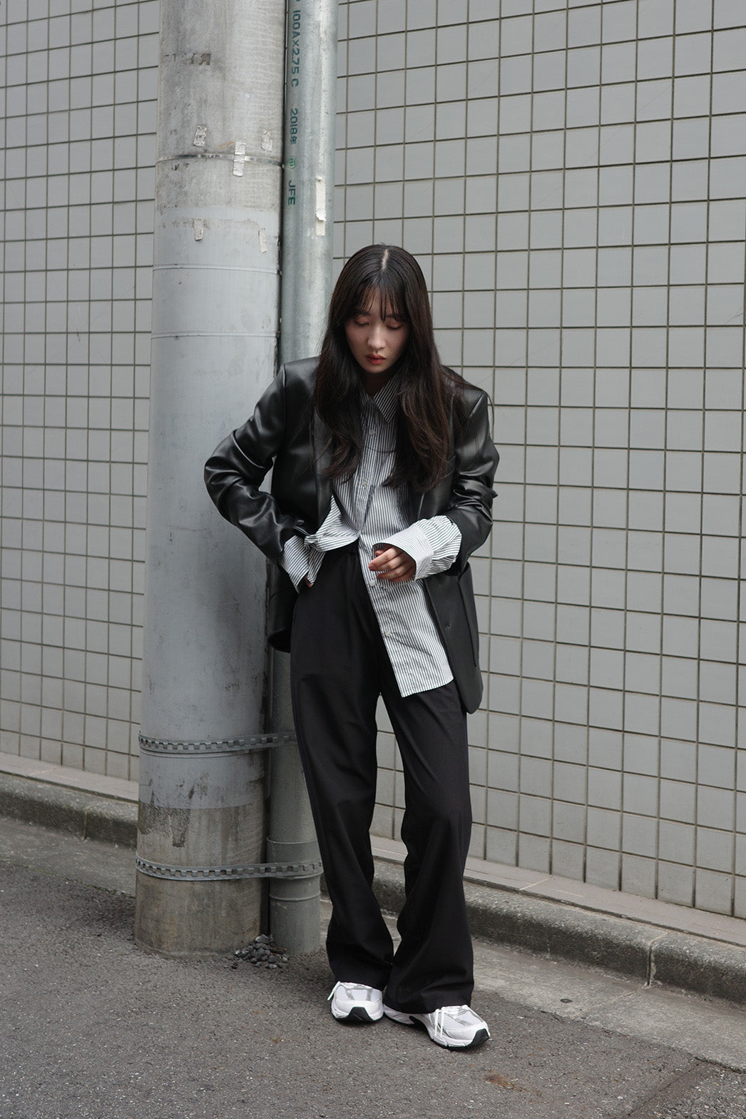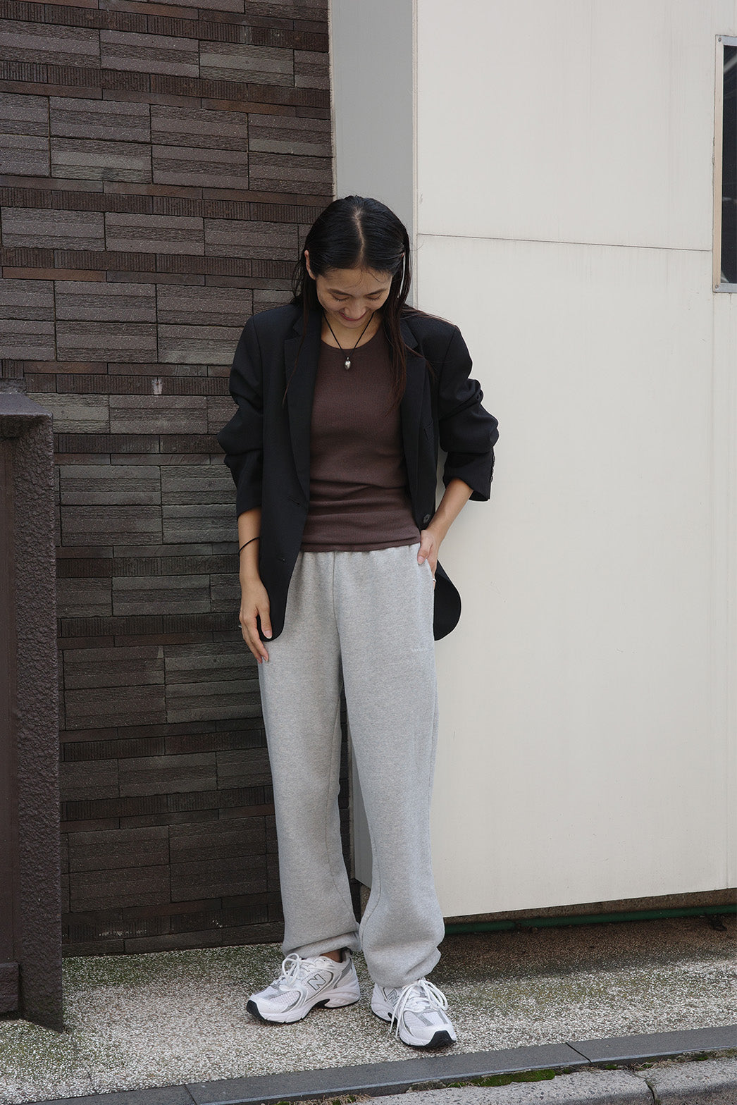 全体が暗いトーンになりすぎない様、インナーのタンクはブラウンを着用。 スウェットパンツと合わせてリラックス感のあるスタイリングに。