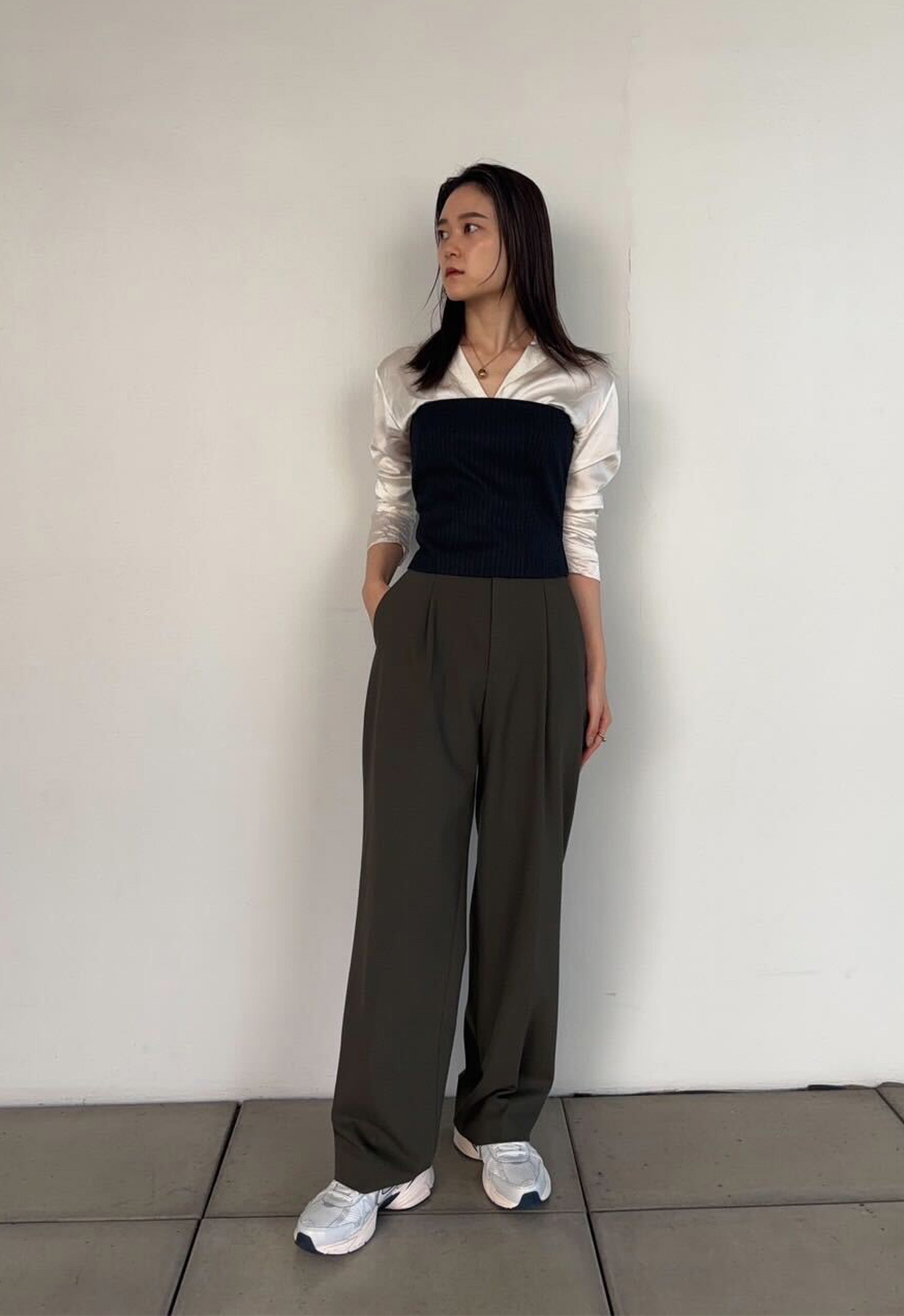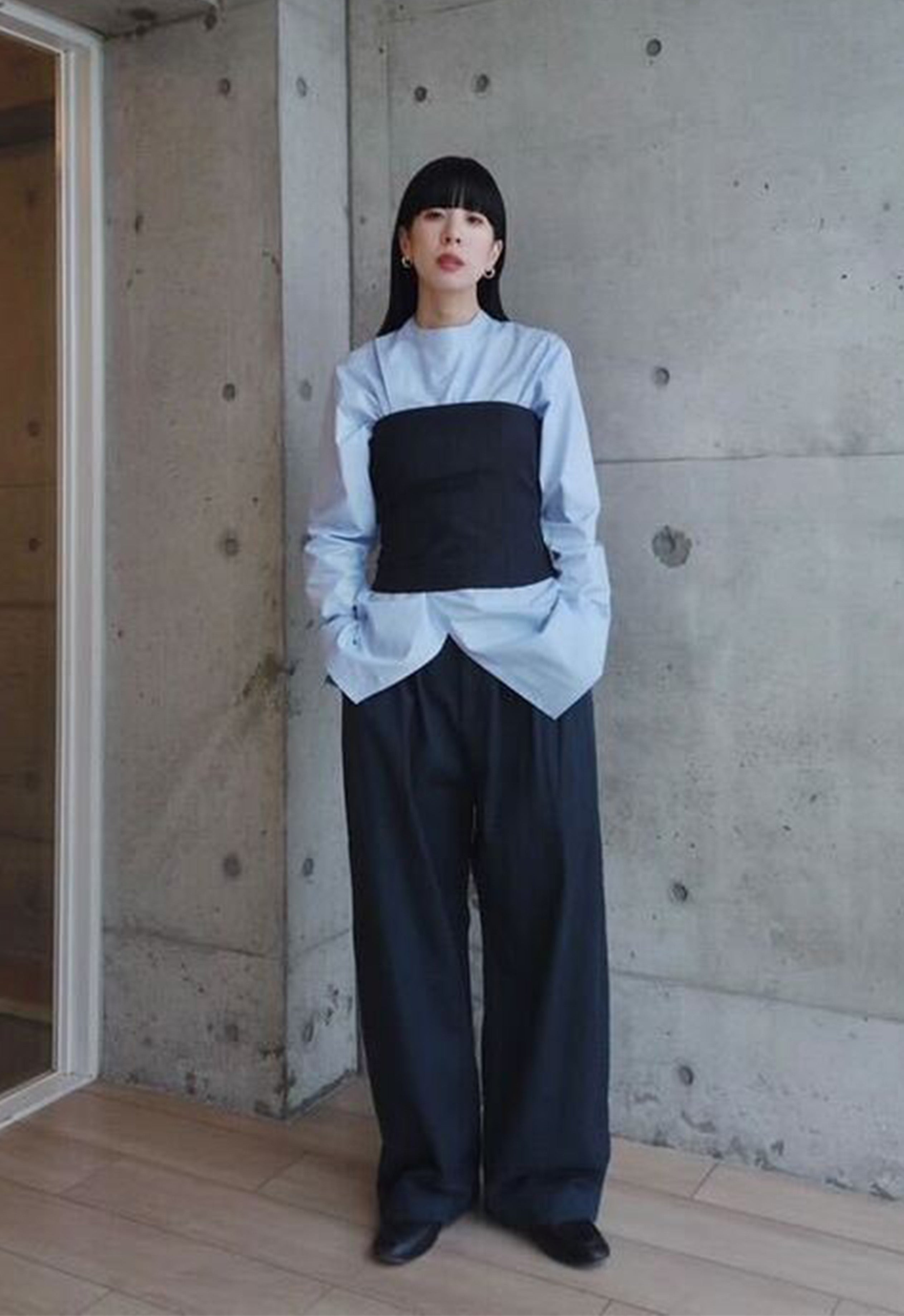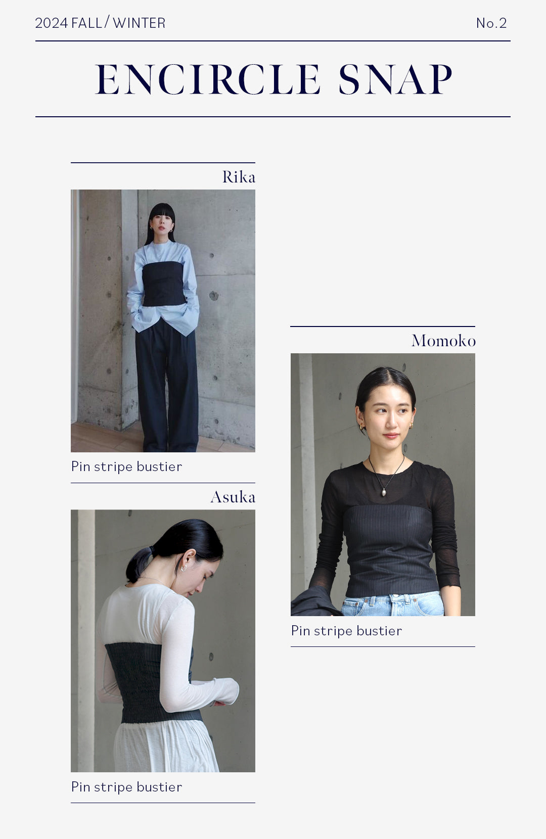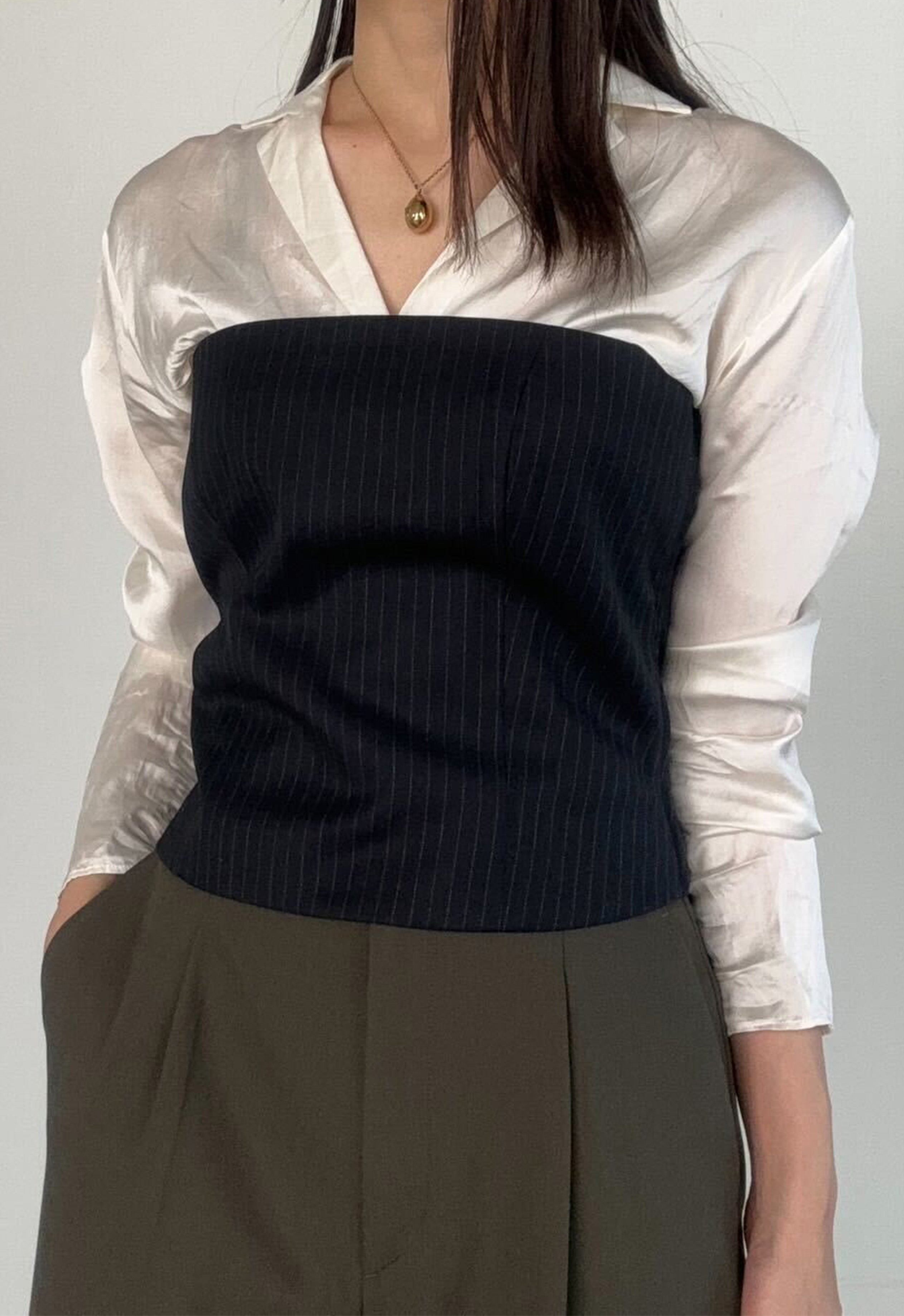 女性らしさを引き立てるビスチェが主役のコーディネート。柔らかいカラーリングで取り入れやすく。フェミニンさと上品さを兼ね備えた、洗練されたスタイルに仕上がります。