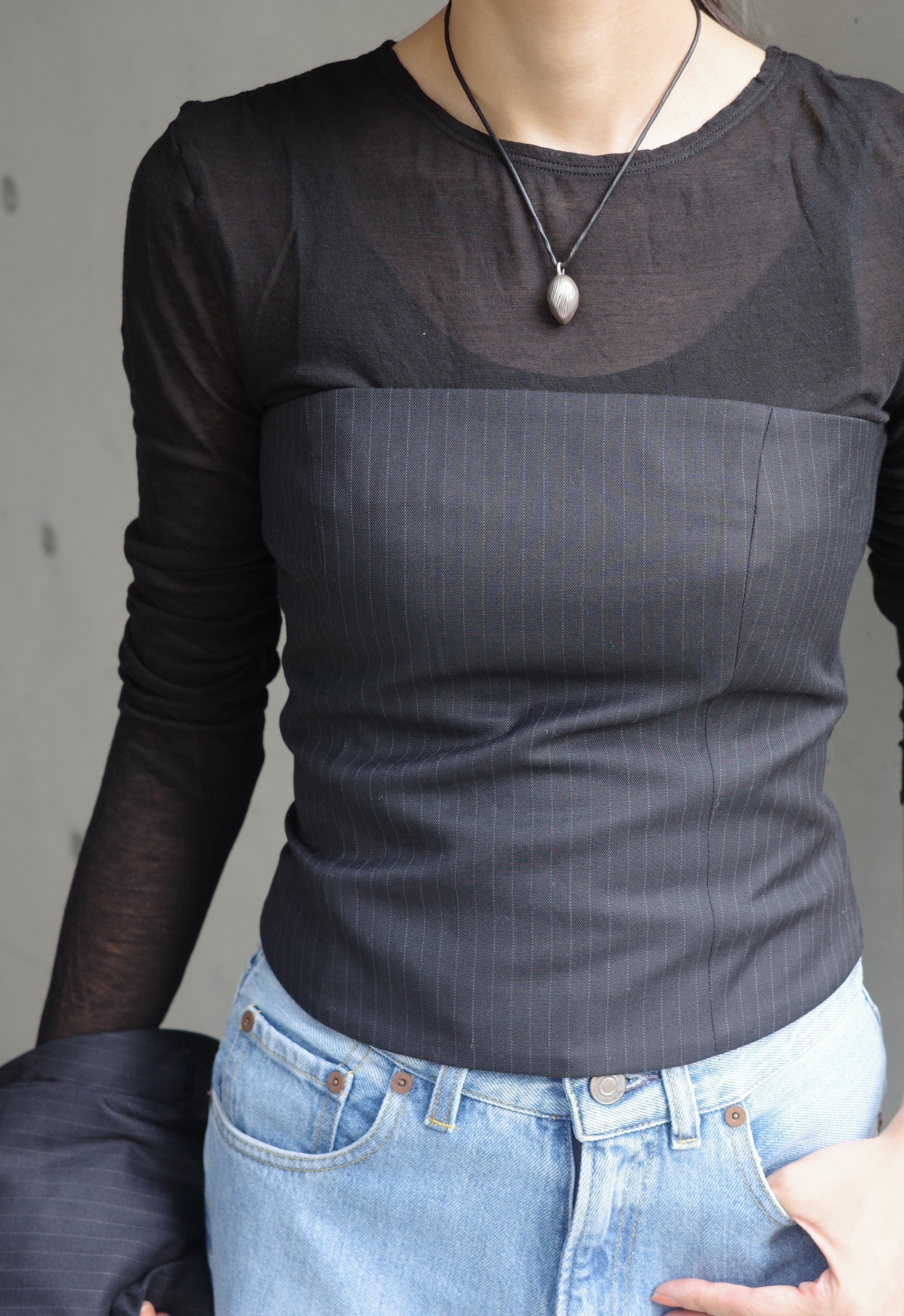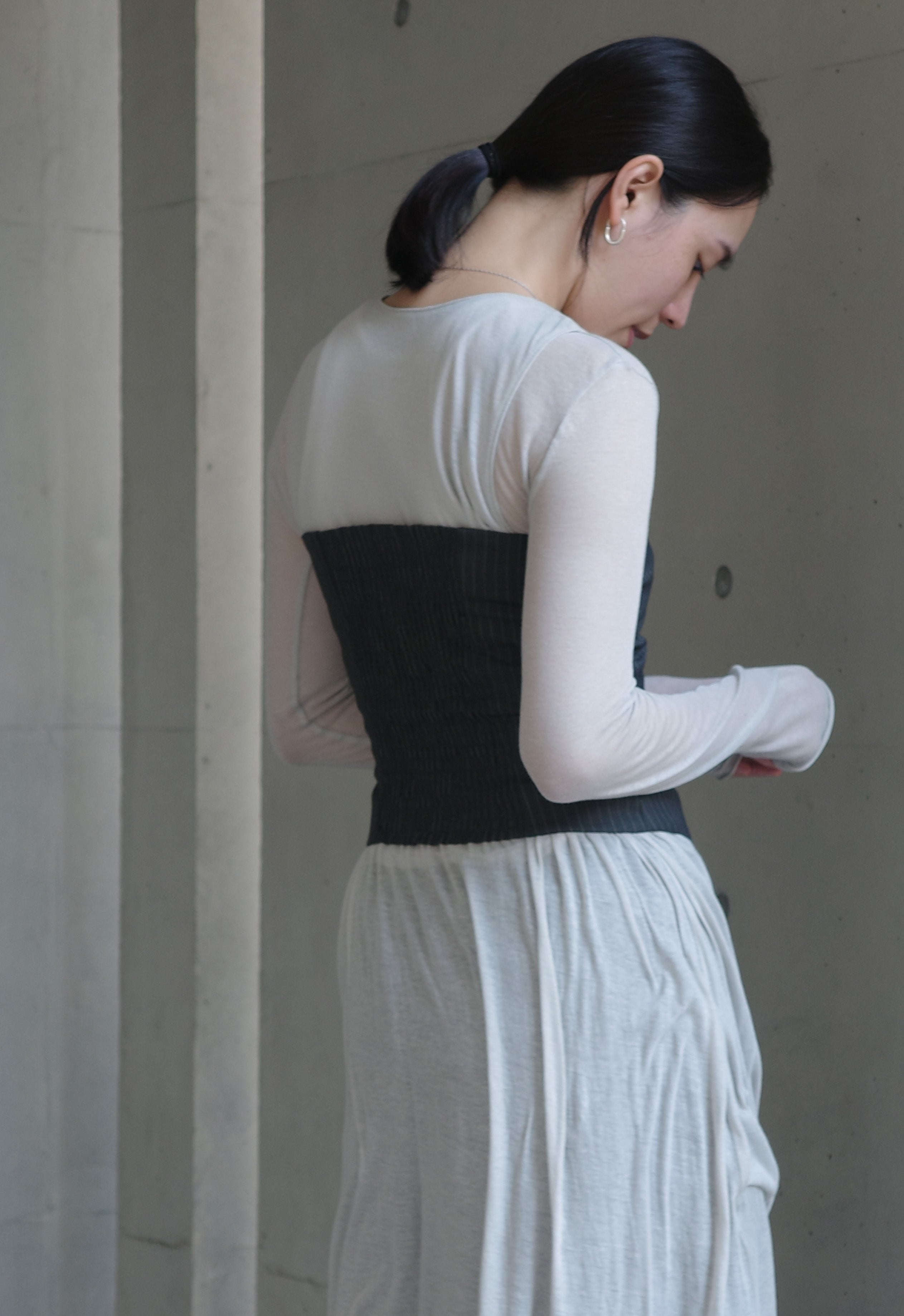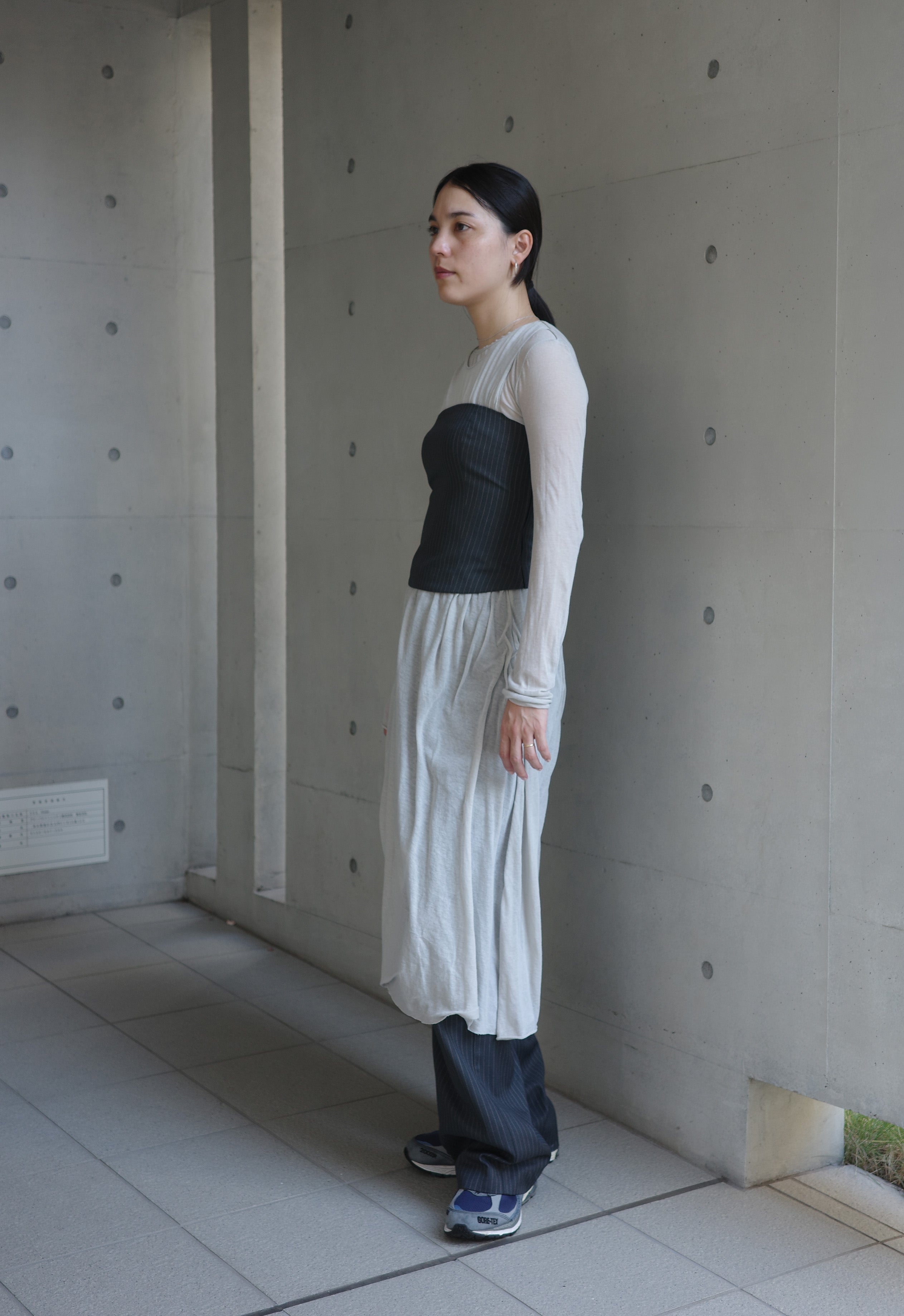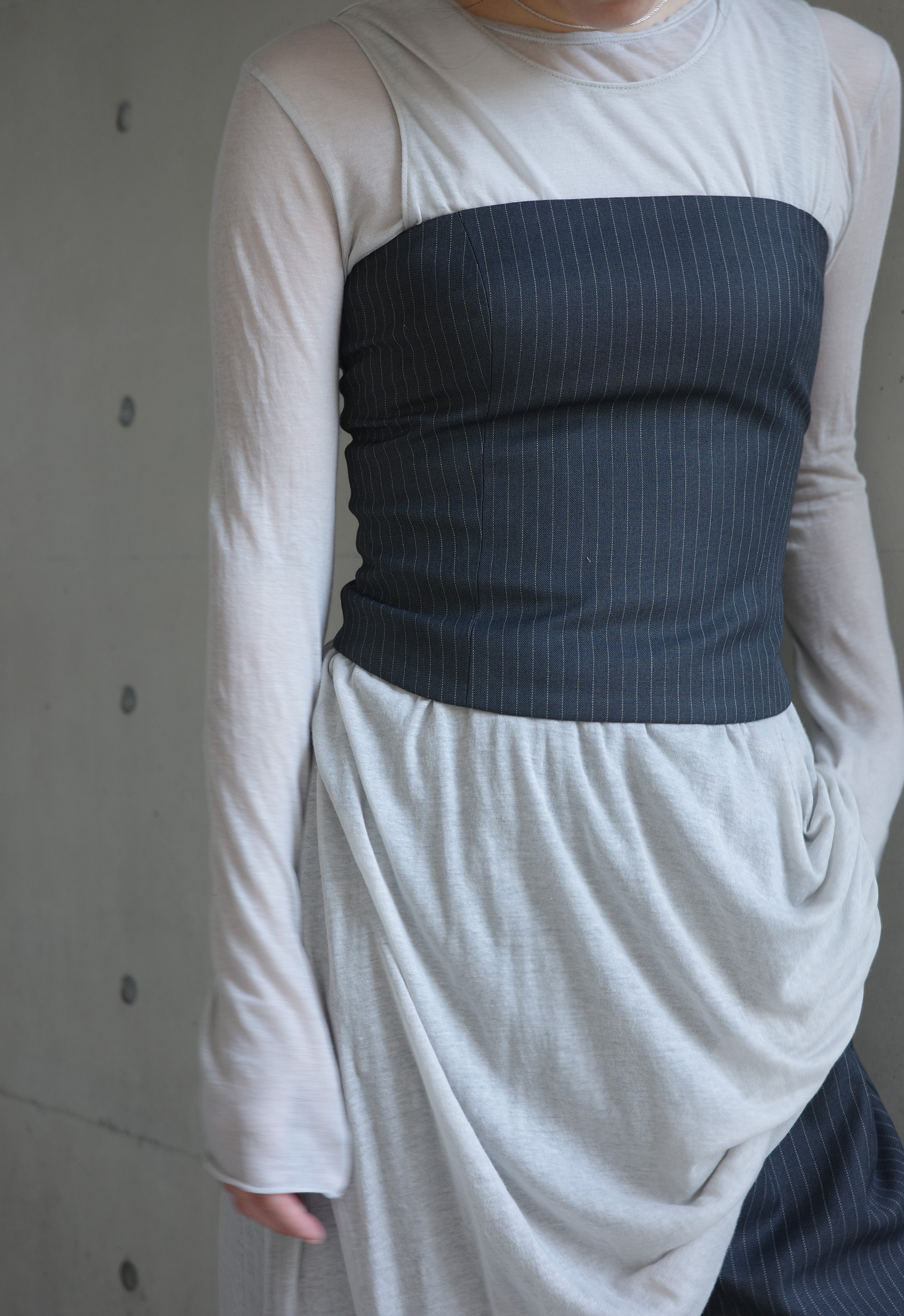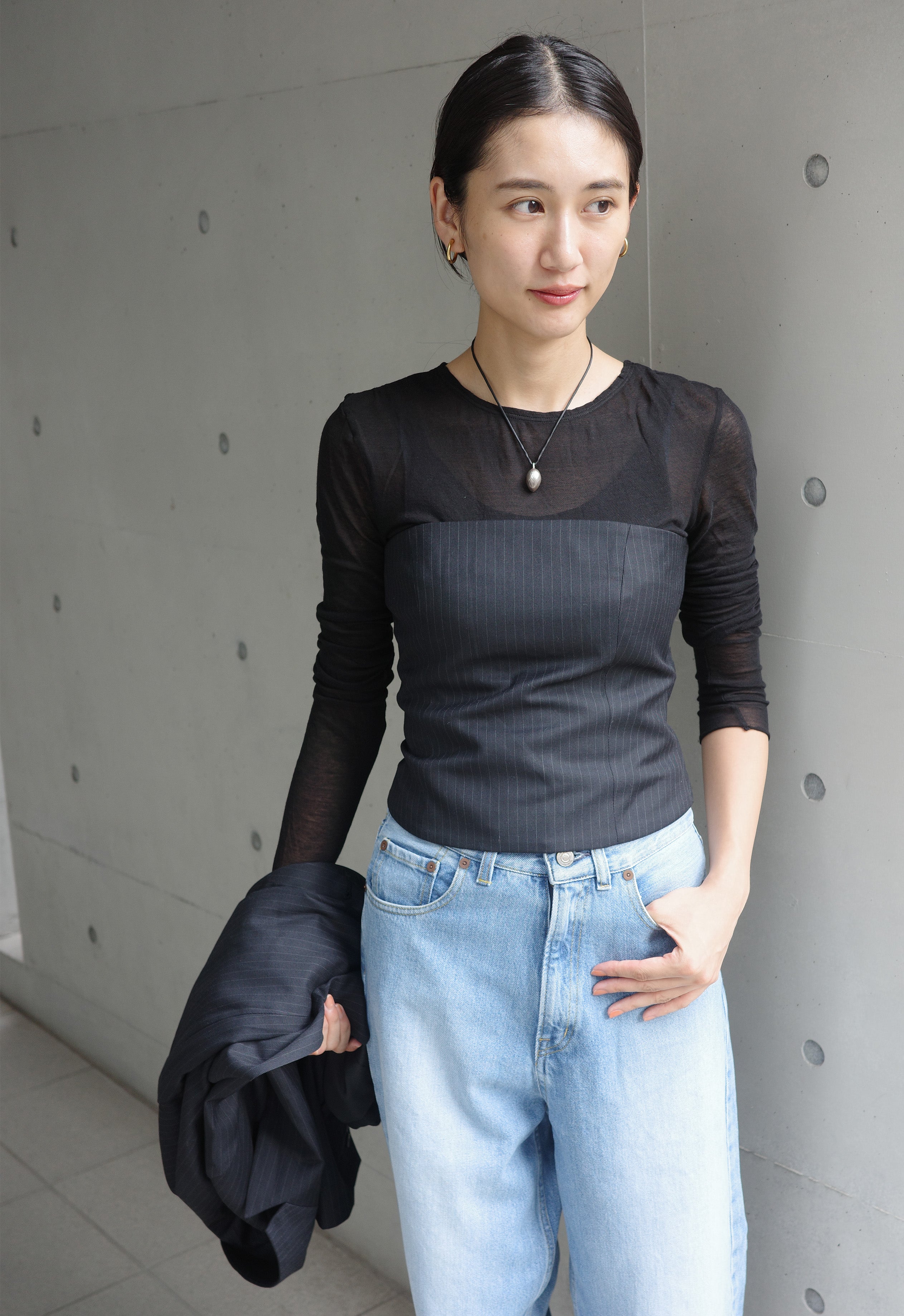 女性らしさを引き立てるビスチェが主役のコーディネート。柔らかいカラーリングで取り入れやすく。フェミニンさと上品さを兼ね備えた、洗練されたスタイルに仕上がります。