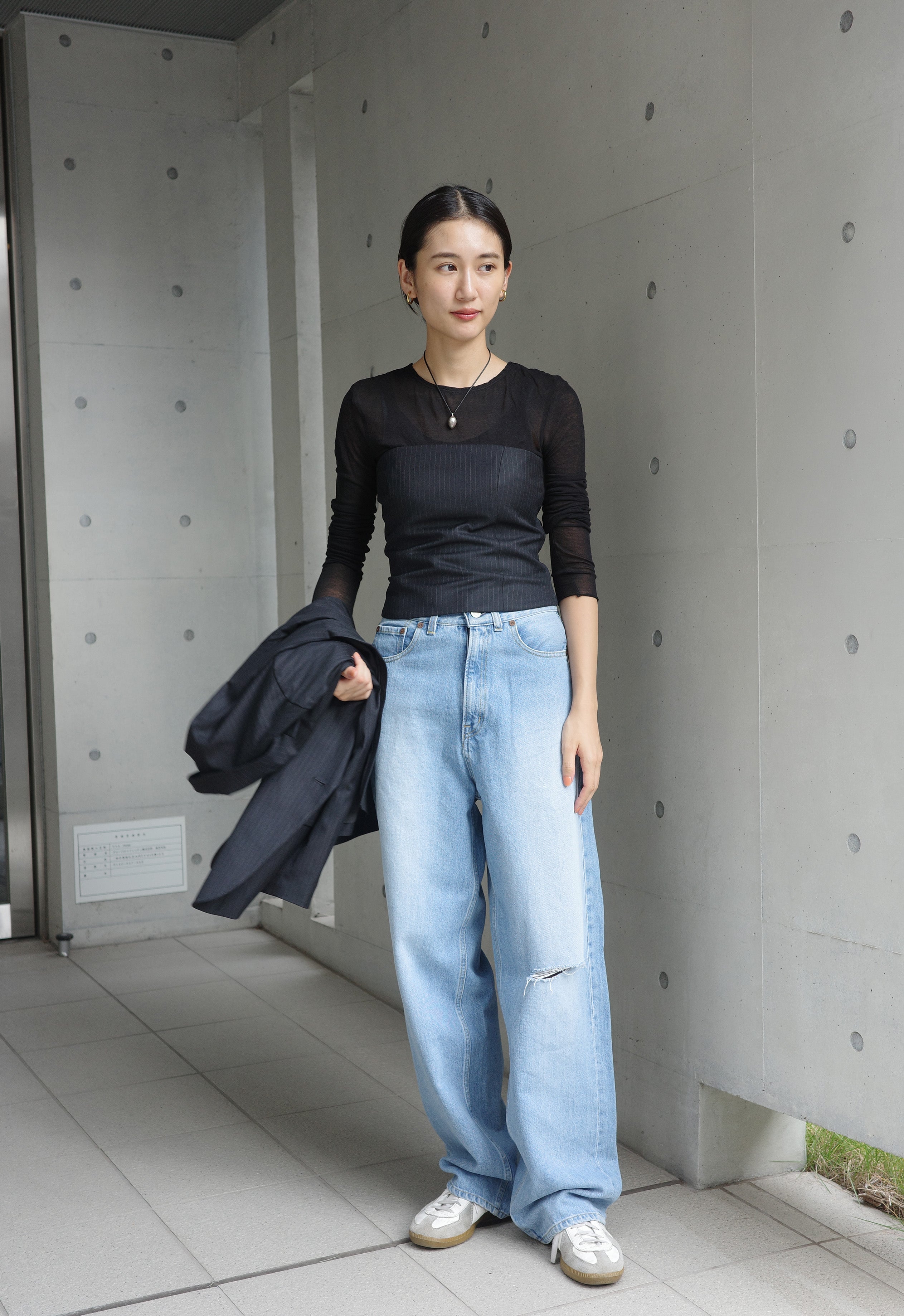 クールな印象を与えつつ、全体的にゆとりのあるサイズ感が女性らしさを引き立てます。洗練されたカラーリングとシルエットで、上品さとリラックス感を兼ね備えたスタイルに。