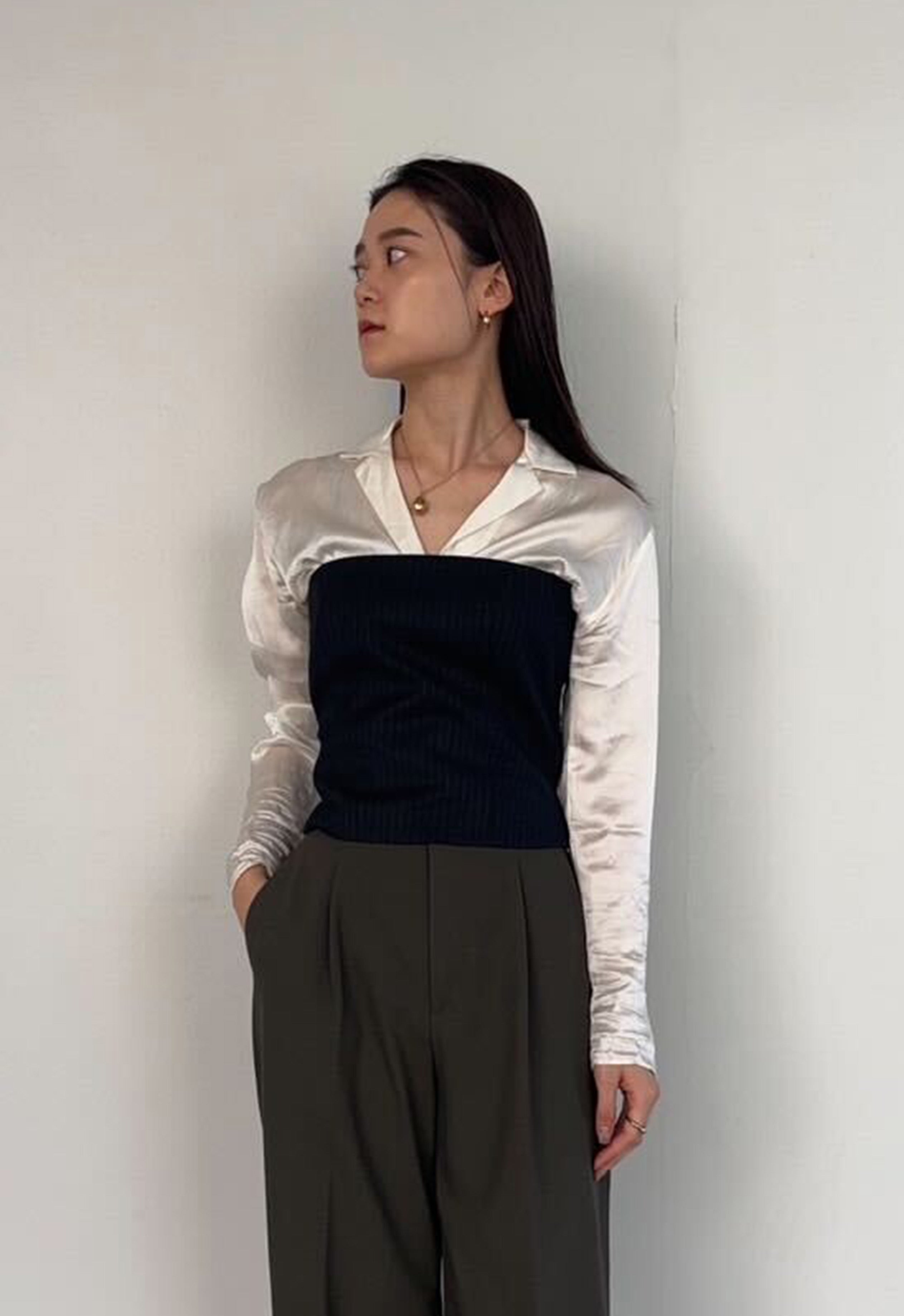 光沢感のあるシルクシャツでドレッシーに。ボトムスとスニーカーでカジュアルダウンし、トレンド感ある洗練コーデに。