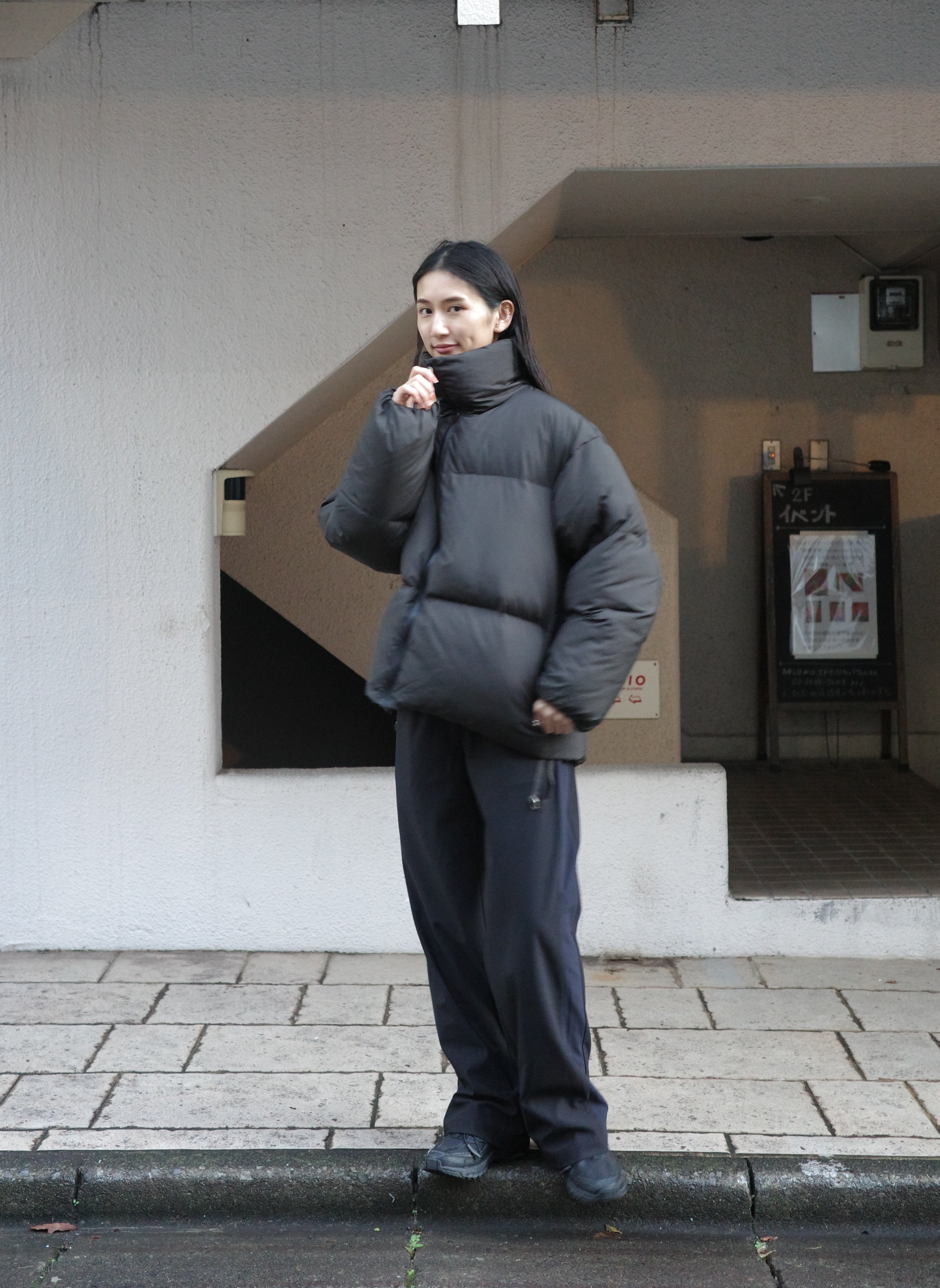 ハイネックが特徴的なKnit Zip BLは、ショート丈デザインがスタイルアップ効果を引き出す一枚。ブラックのスカートを合わせることで全体を引き締めつつ、スニーカーで抜け感をプラス。モードな雰囲気とカジュアルさが絶妙にマッチしたコーディネートに。