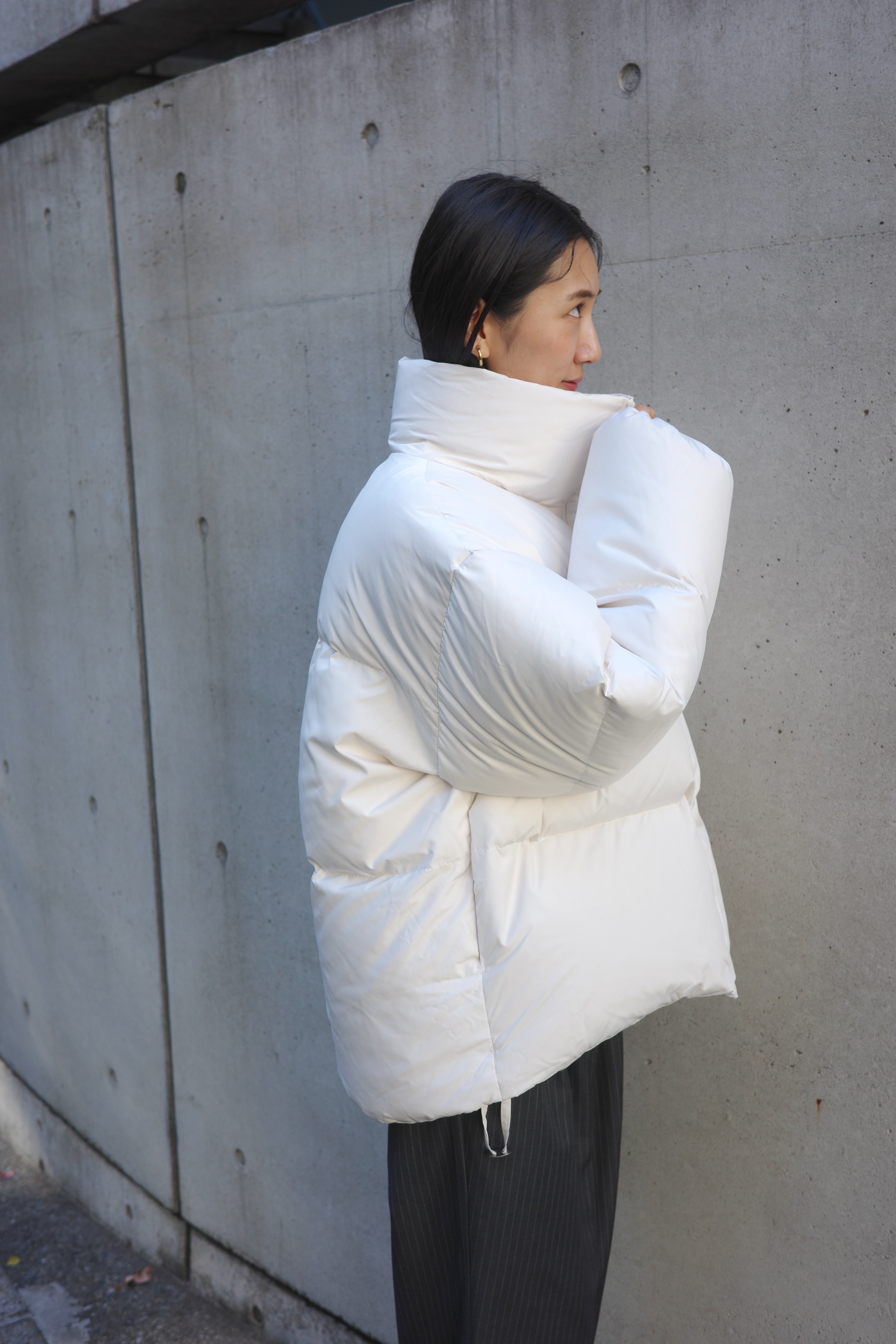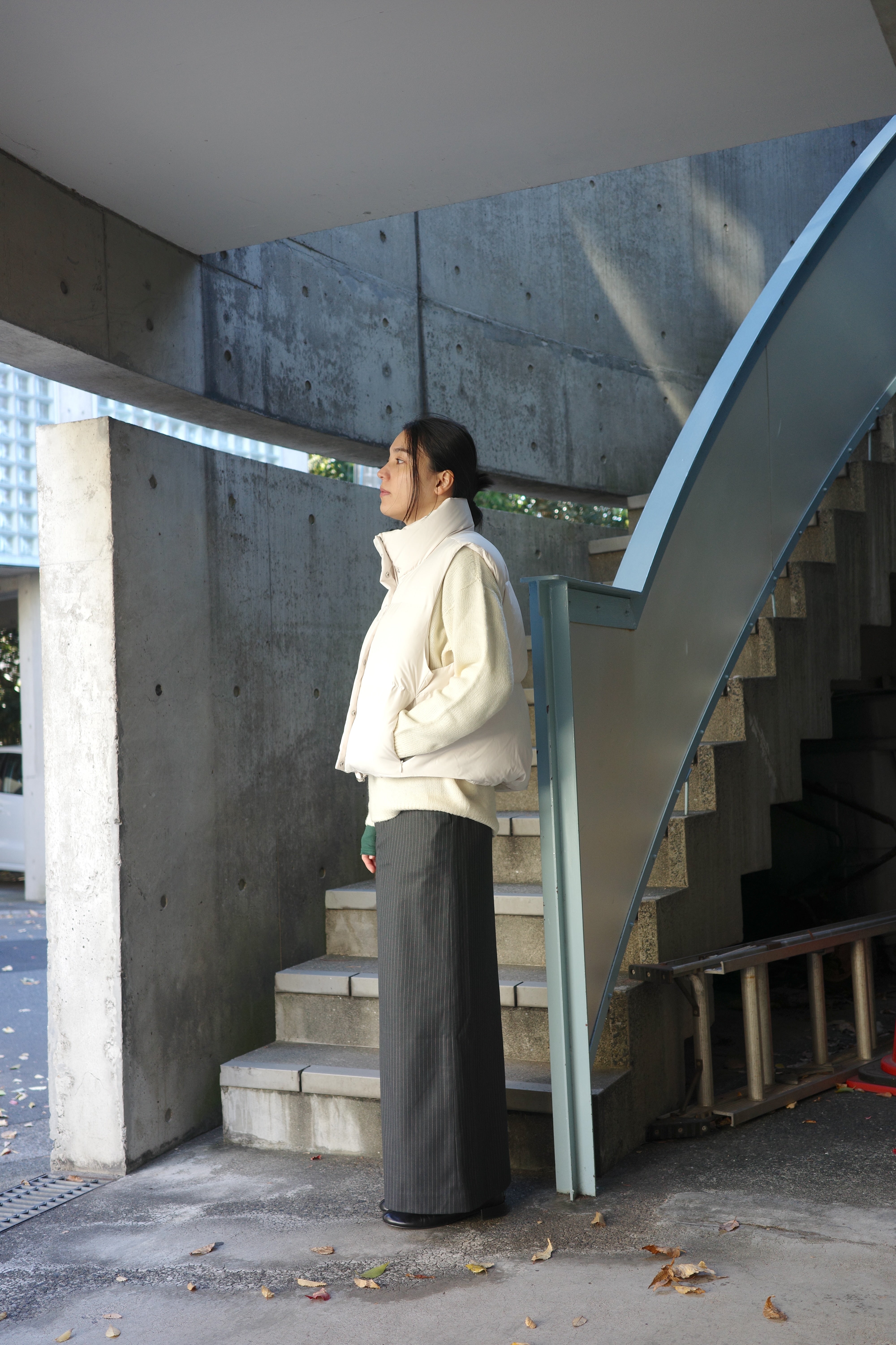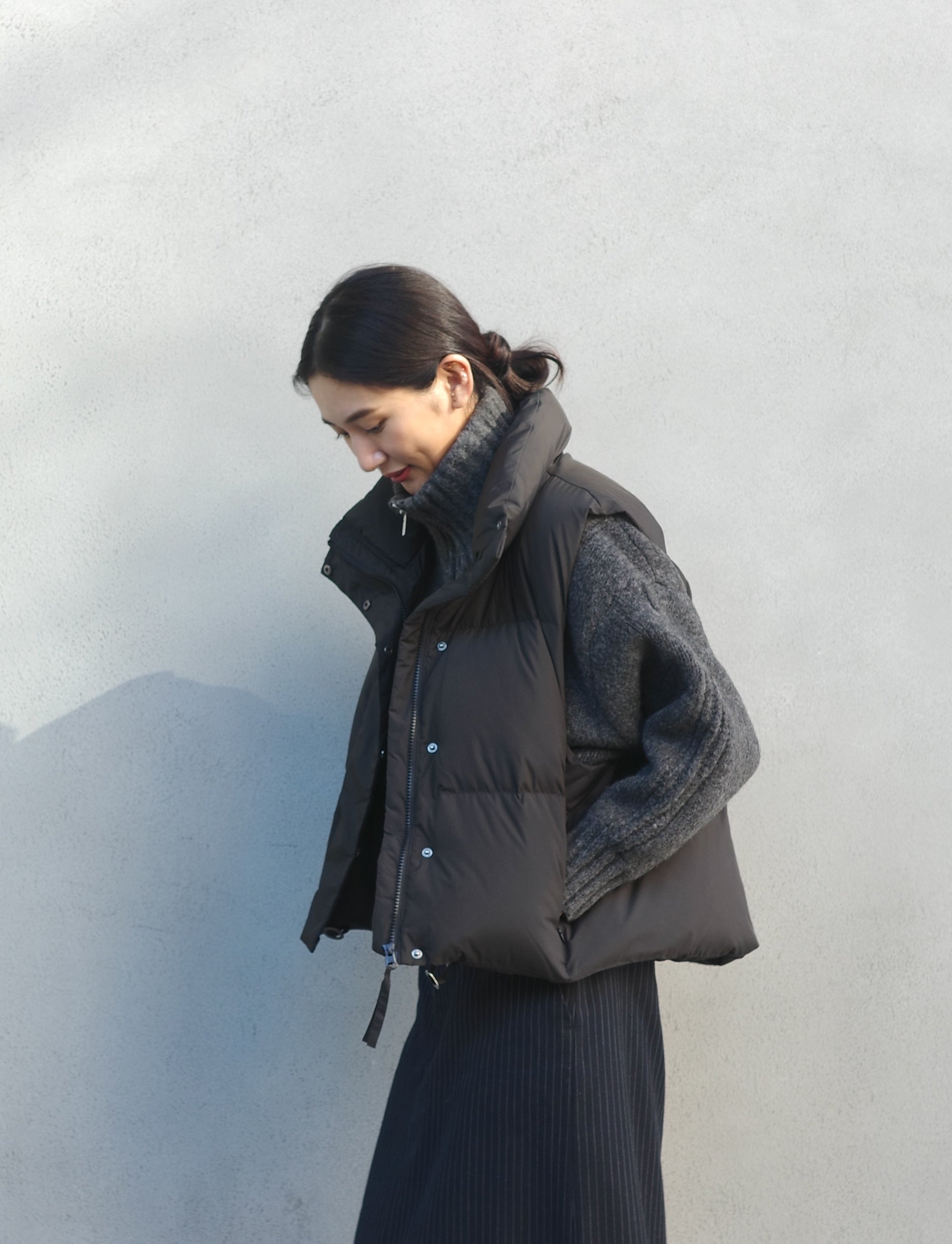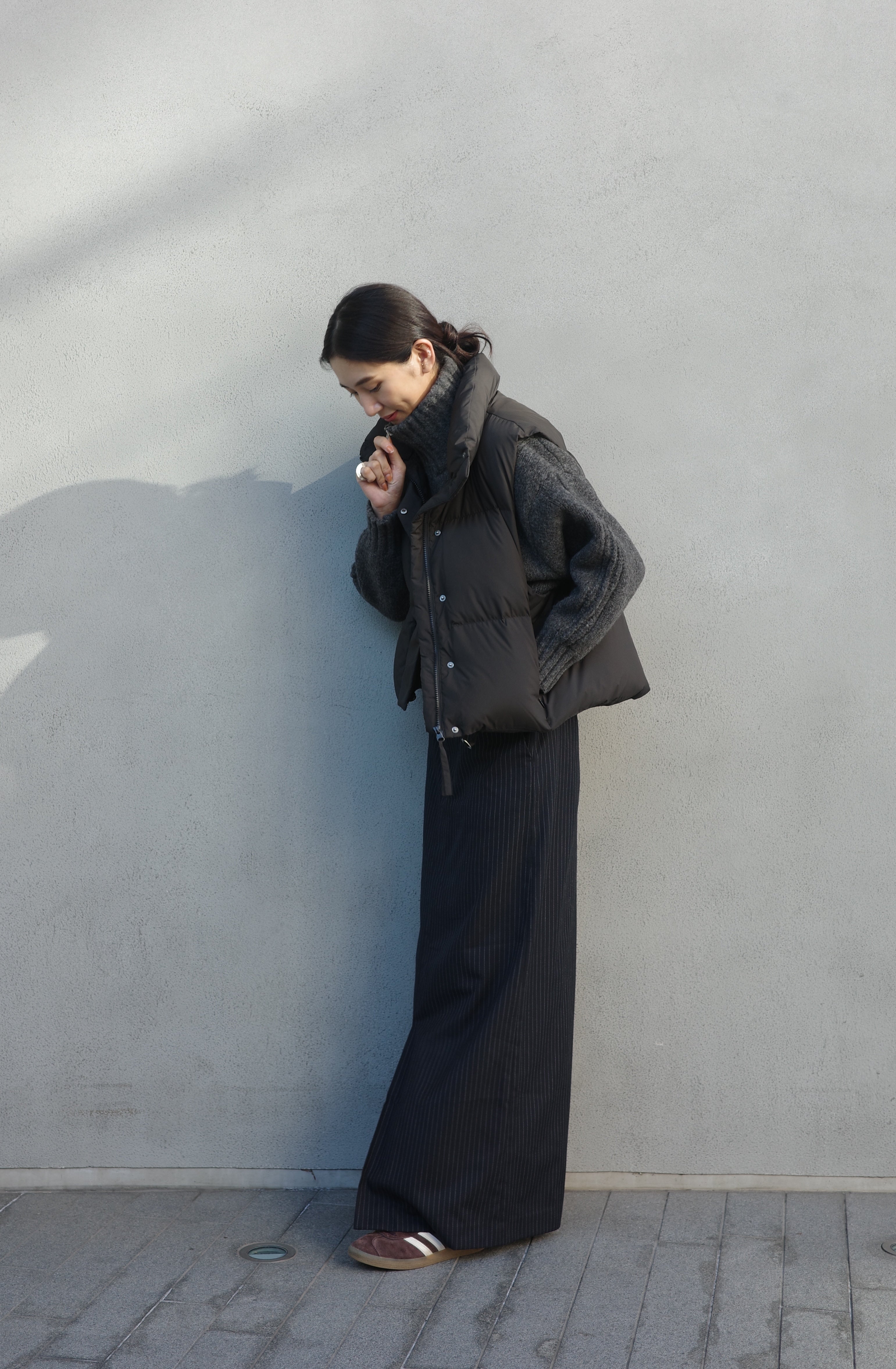 ダウンの中に合わせるトップスには、首元がすっきりとしたバランスを作るVネックのカーディガンが万能です。Moffy cardiganは、シンプルなデザインながら深めのVカットがデコルテを美しく見せ、大きめのフロントボタンが程よいアクセントに。ボトムスにはゆったり感がありながらも、細めのストライプが効いたパンツを選び、上品さを保ちつつリラックス感のあるコーディネートに仕上げました。