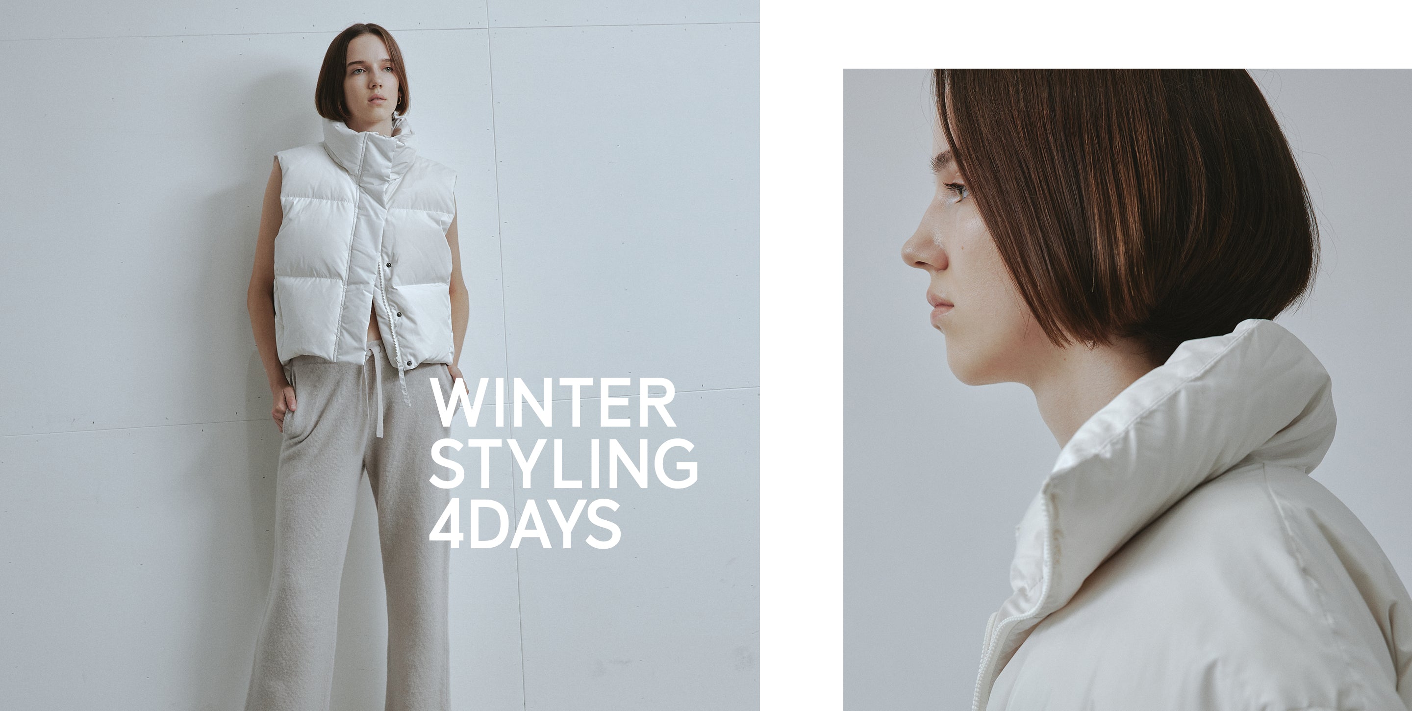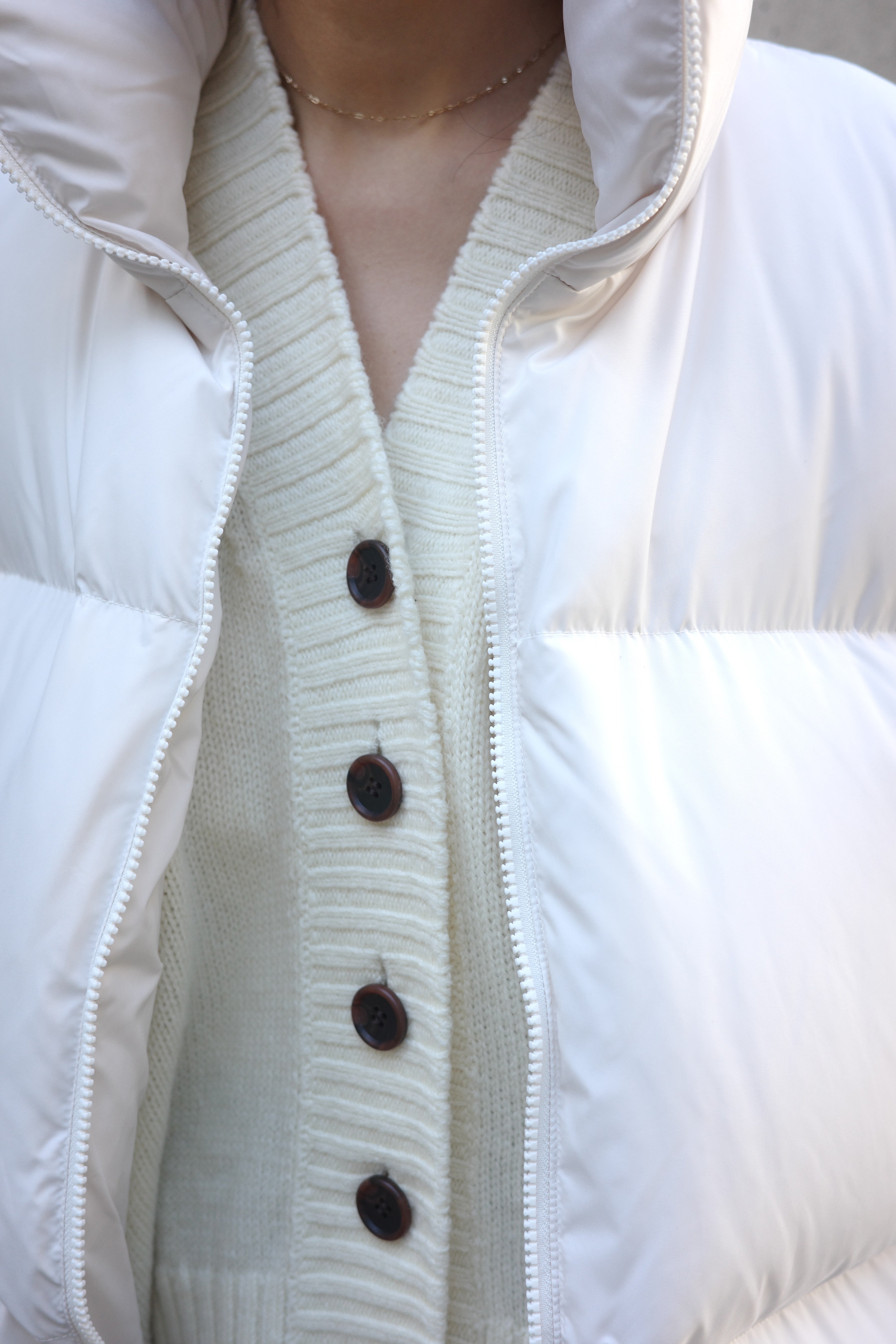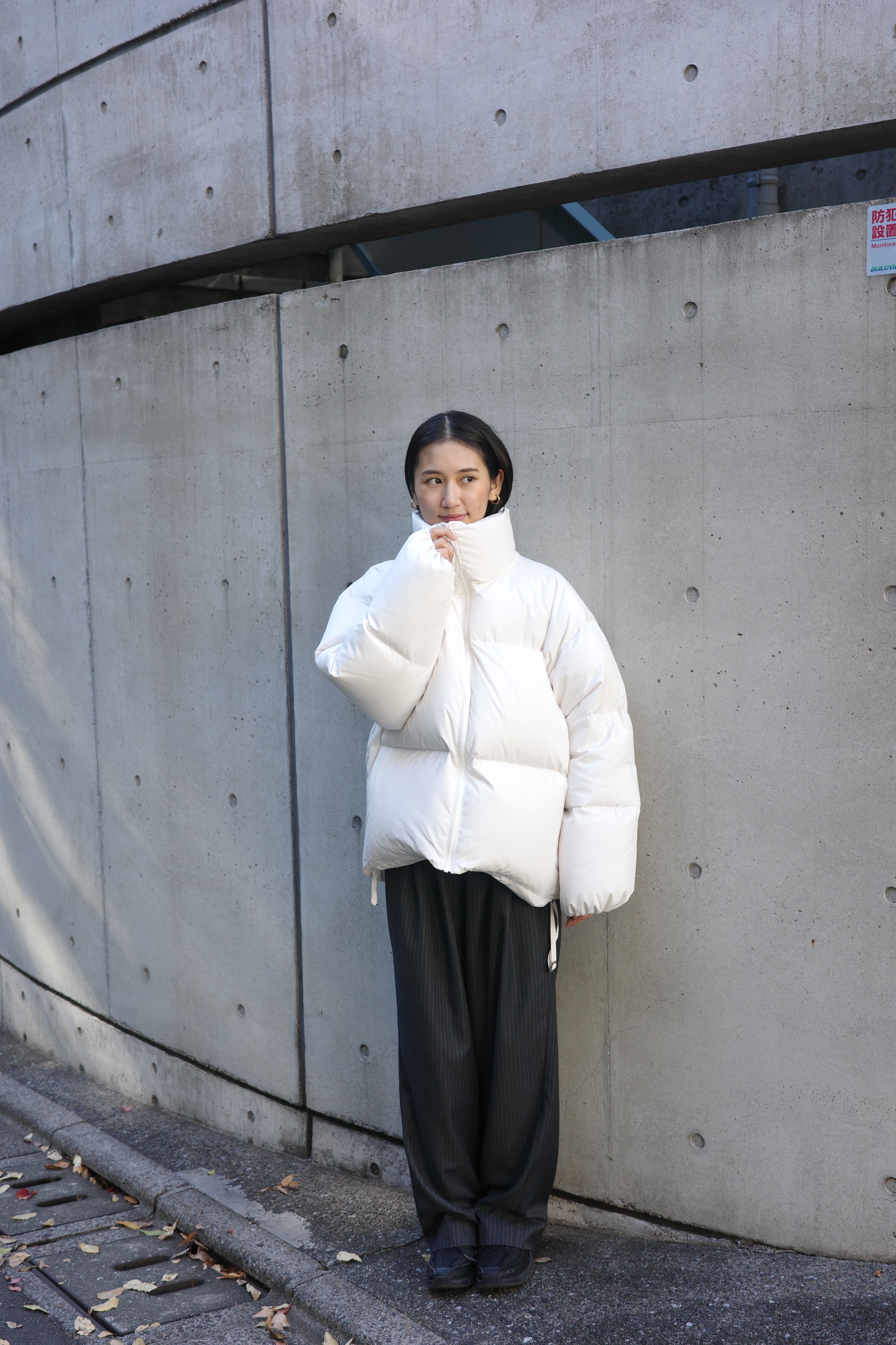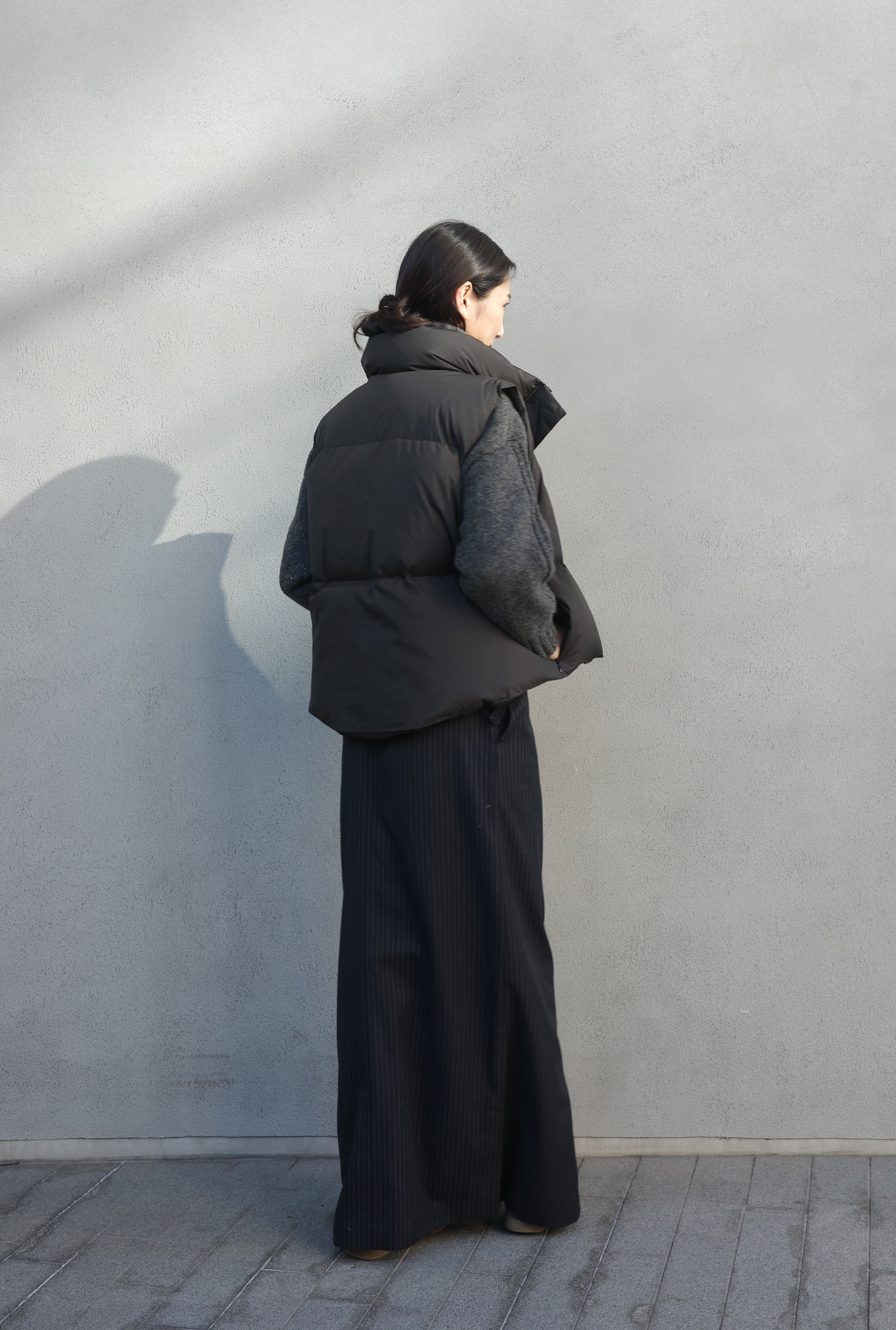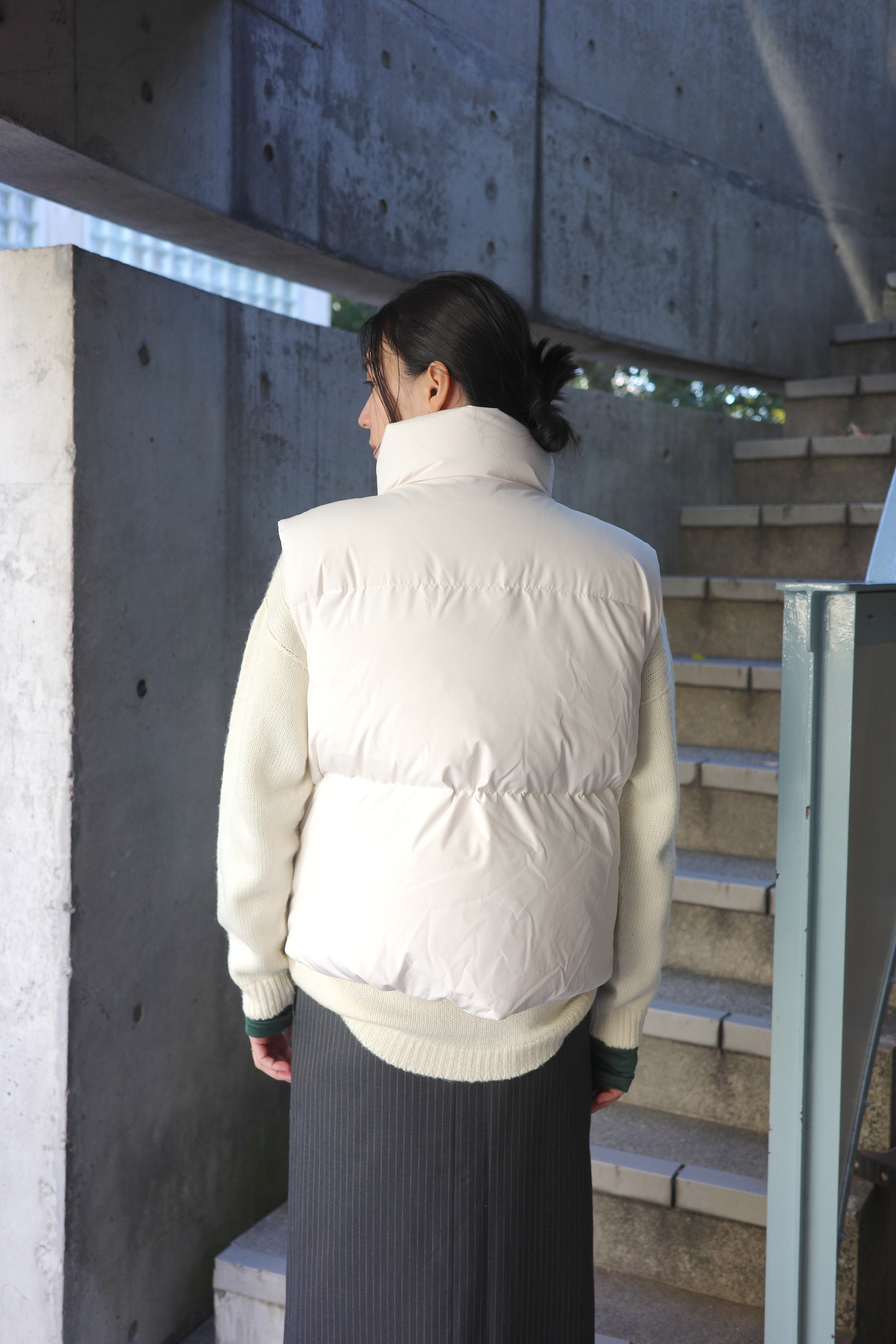 ダウンの中に合わせるトップスには、首元がすっきりとしたバランスを作るVネックのカーディガンが万能です。Moffy cardiganは、シンプルなデザインながら深めのVカットがデコルテを美しく見せ、大きめのフロントボタンが程よいアクセントに。ボトムスにはゆったり感がありながらも、細めのストライプが効いたパンツを選び、上品さを保ちつつリラックス感のあるコーディネートに仕上げました。