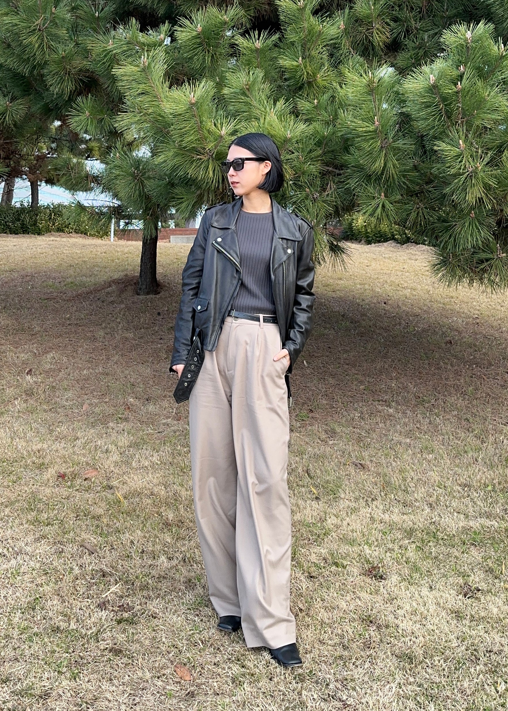 ライダースを着る時はいつもモノトーンなスタイリングにしてしまいがちですが、今回はベージュを差し色に入れてみました。印象が柔らかくなって、女性らしい雰囲気を作れるので、今後はカラーも合わせてみようと思いました。