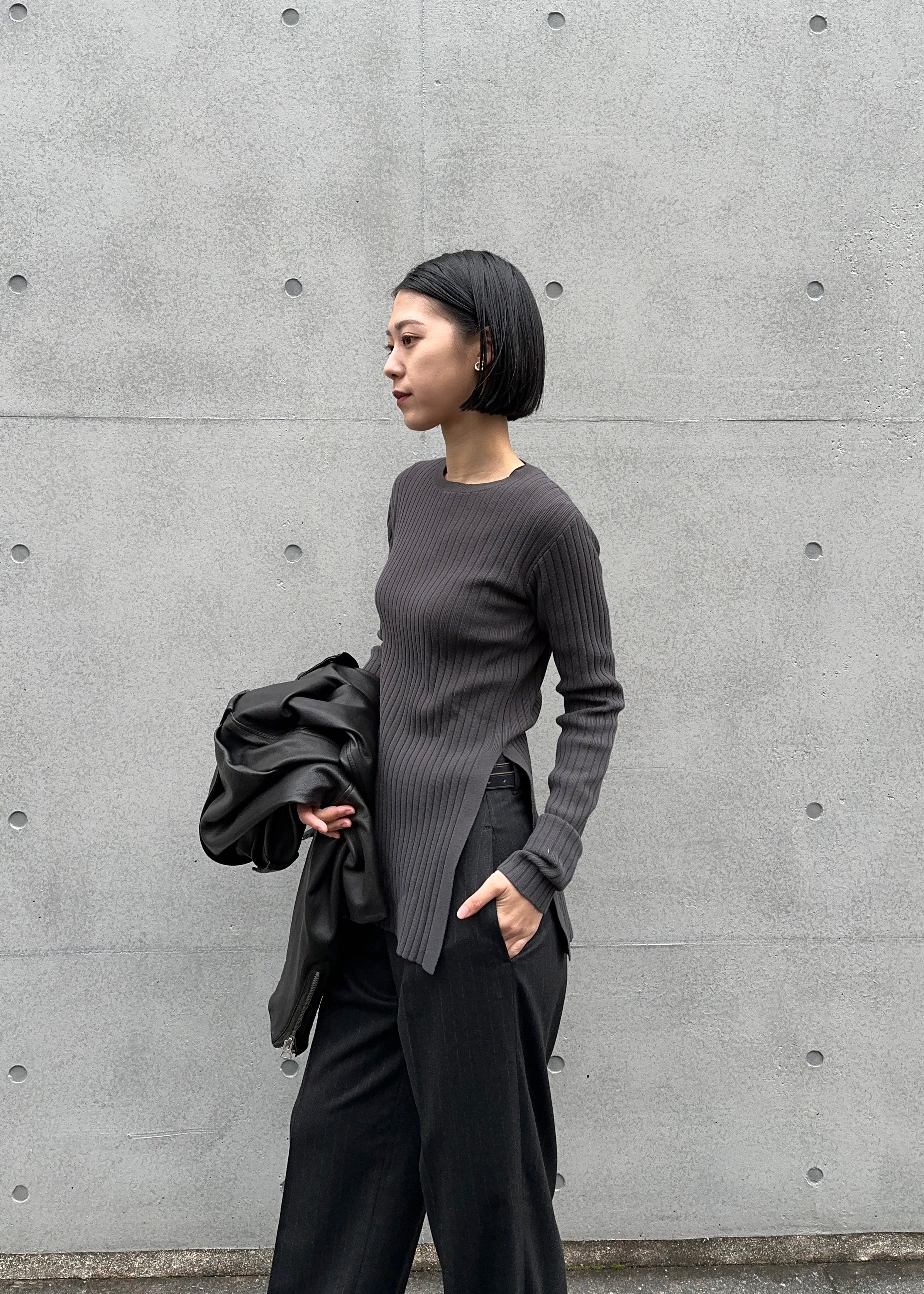 リブニットにスリットが入っているので、ワイドパンツと相性が良いです。細身のニットがきちんと感を出してくれるので、スタイリッシュに着こなせます。