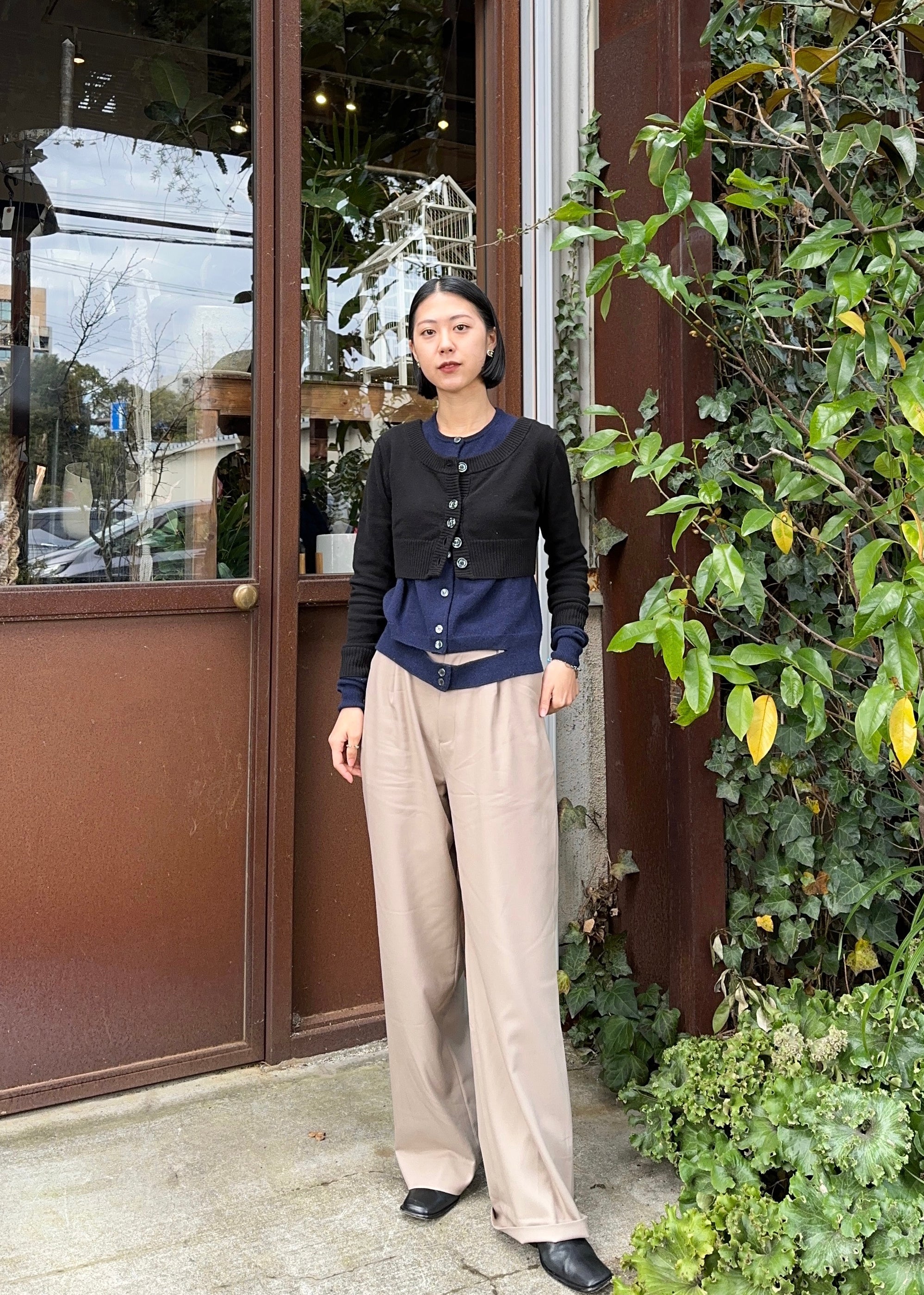 トップスが暗い色のニットなので、パンツに明るいベージュを入れて軽く仕上がるようにしました。 アクセサリーはパンツの明るいトーンに合わせてシルバーで揃えています。