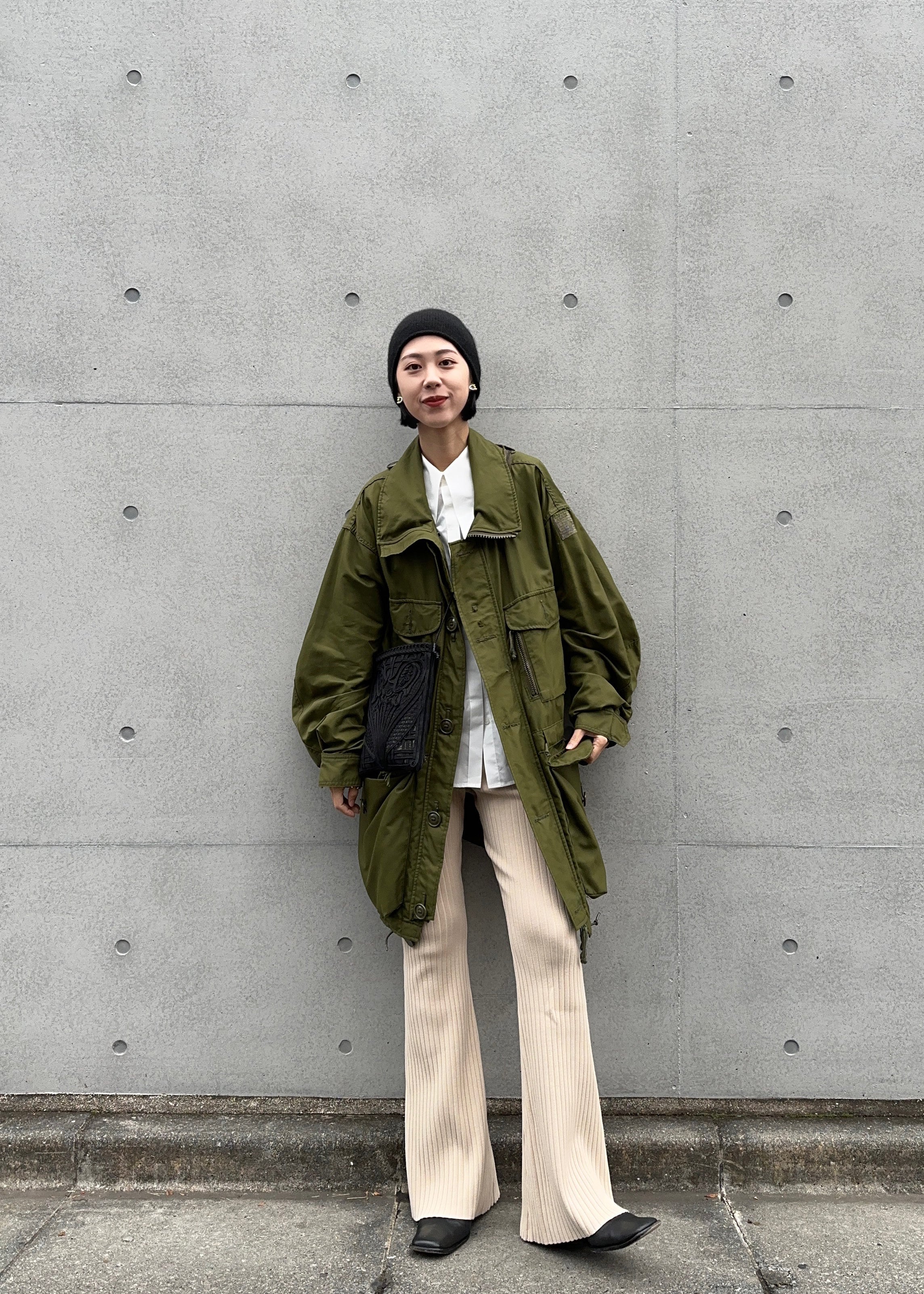 カジュアルになり過ぎないようにトップスにはシャツを合わせました。アウター以外を同系色でまとめて、メリハリをつけています。