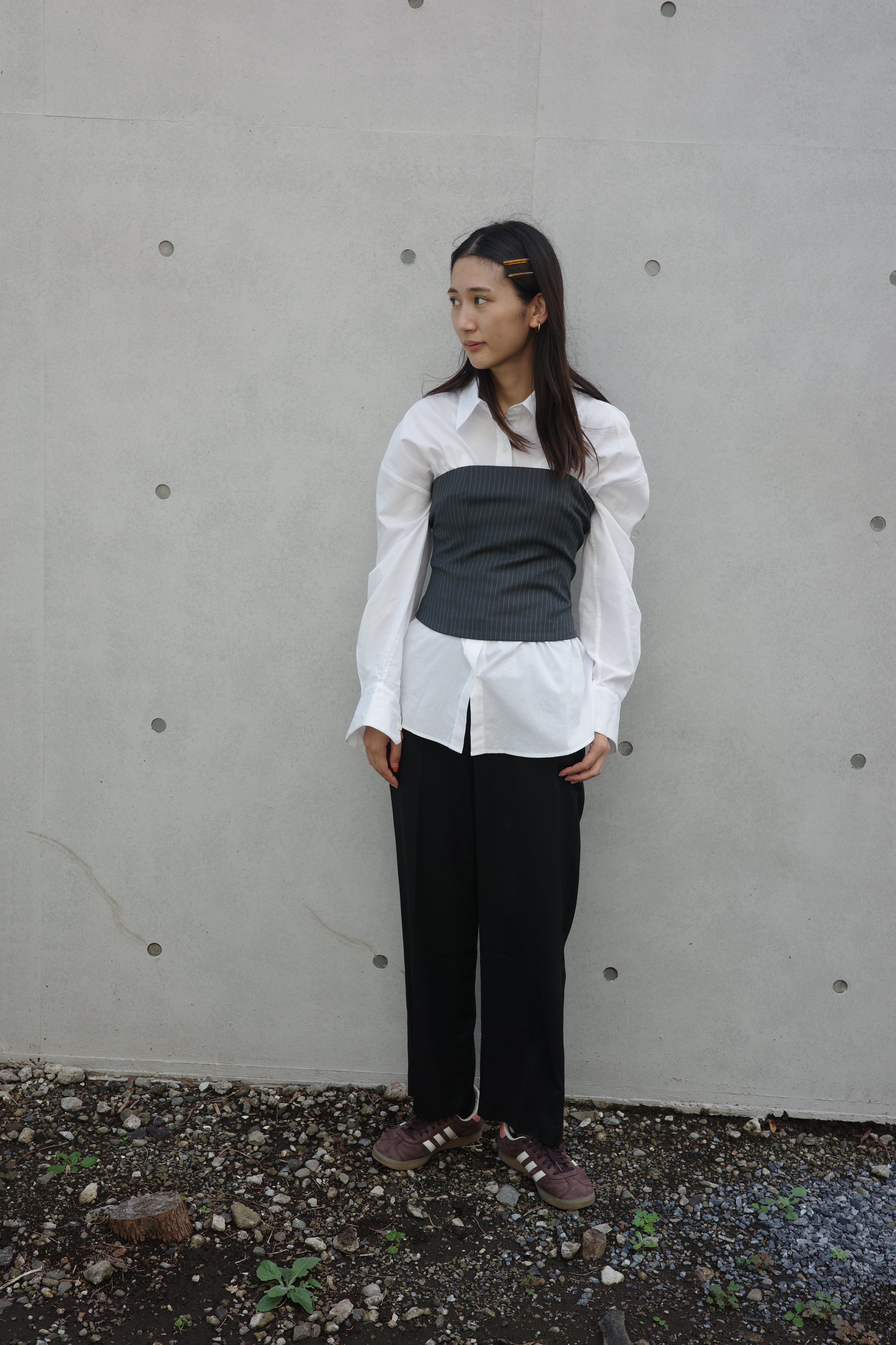 コンパクトなビスチェですが、〈Go to shirt〉をインナーに着ていただいてもバランスが良く着膨れの心配もございません。雰囲気に変化が欲しい時におすすめです。