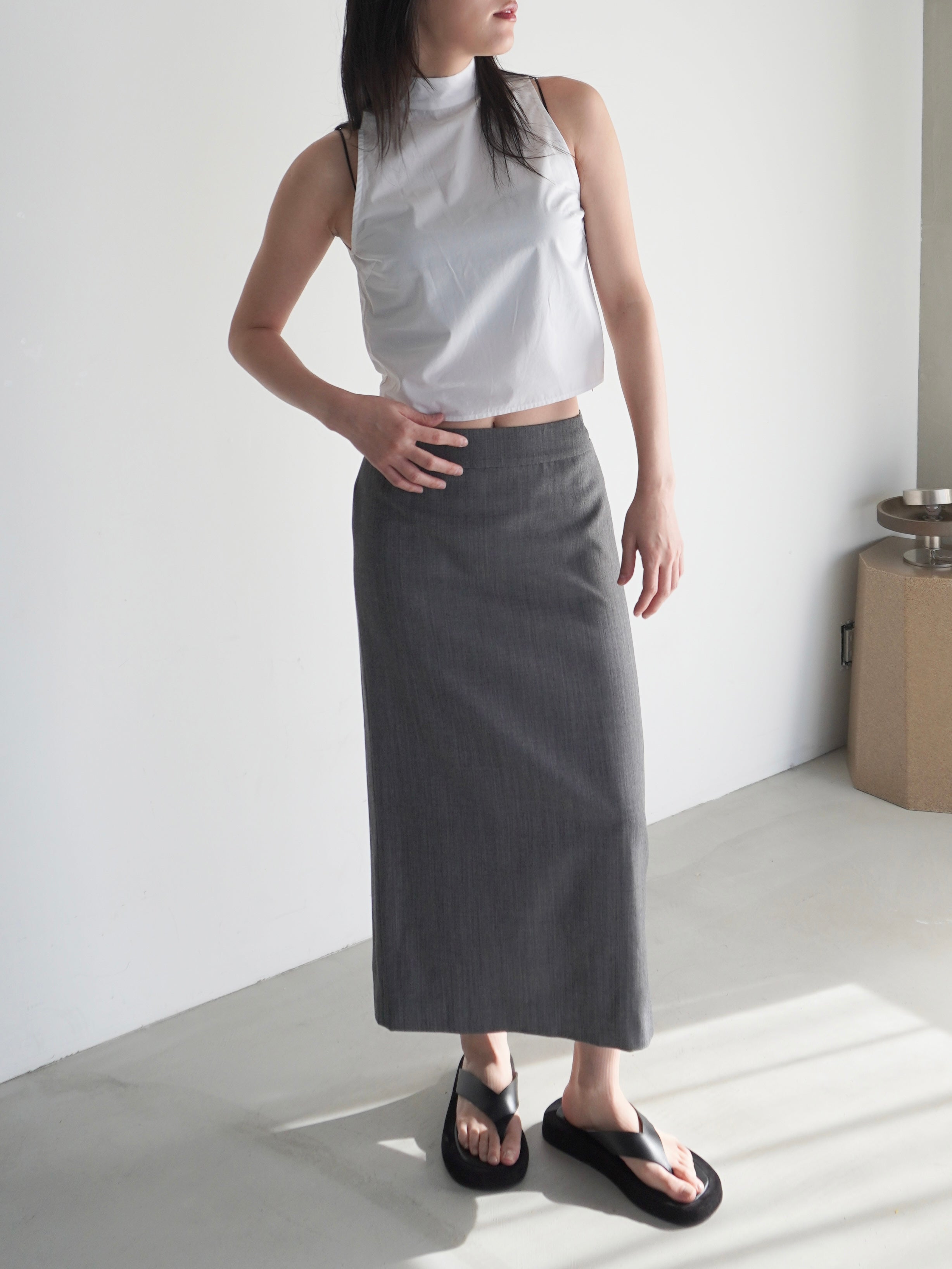 グレーのスカートと合わせて、大人の上品なスタイルに。1枚で着用してもきちんと感が出るのでさまざまなシーンで着ていただけます。