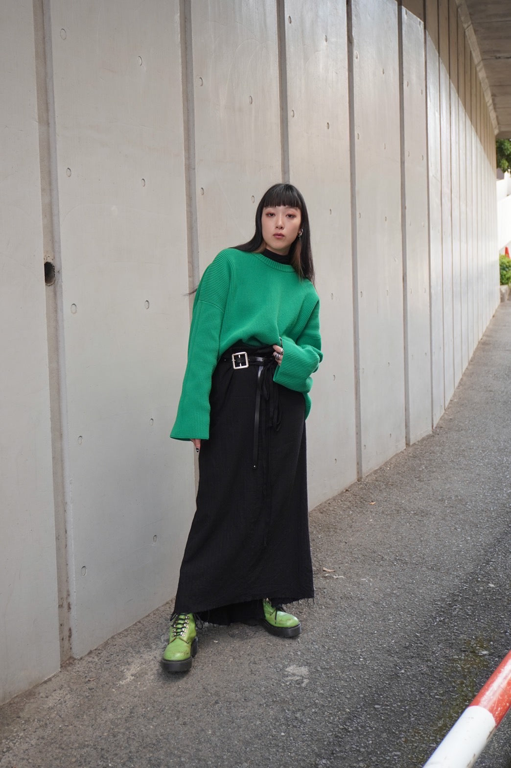 トップスのカラーが際立つよう、黒のシンプルなスカートをチョイス。リンクカラーのブーツの差し色がポイント。