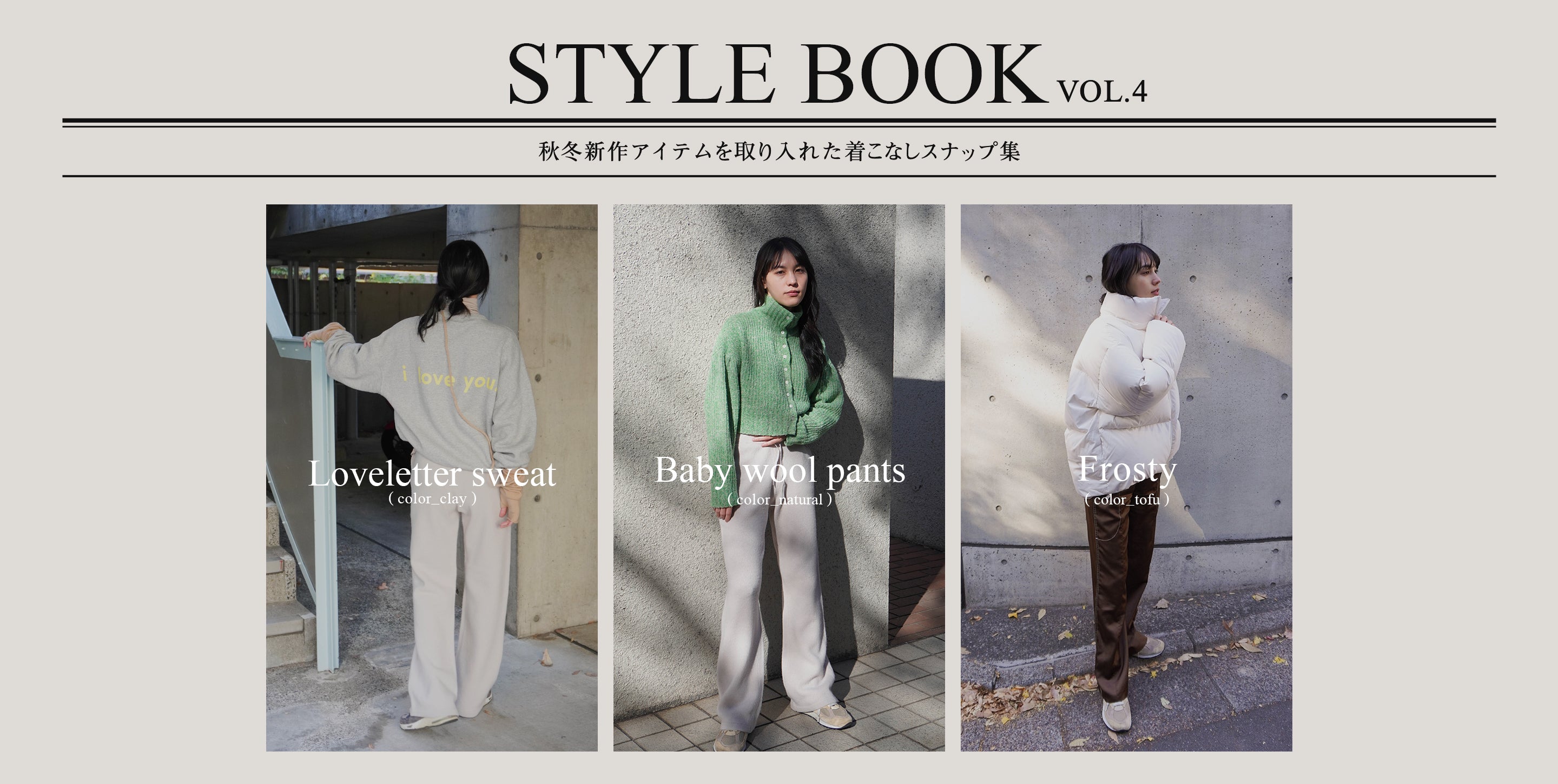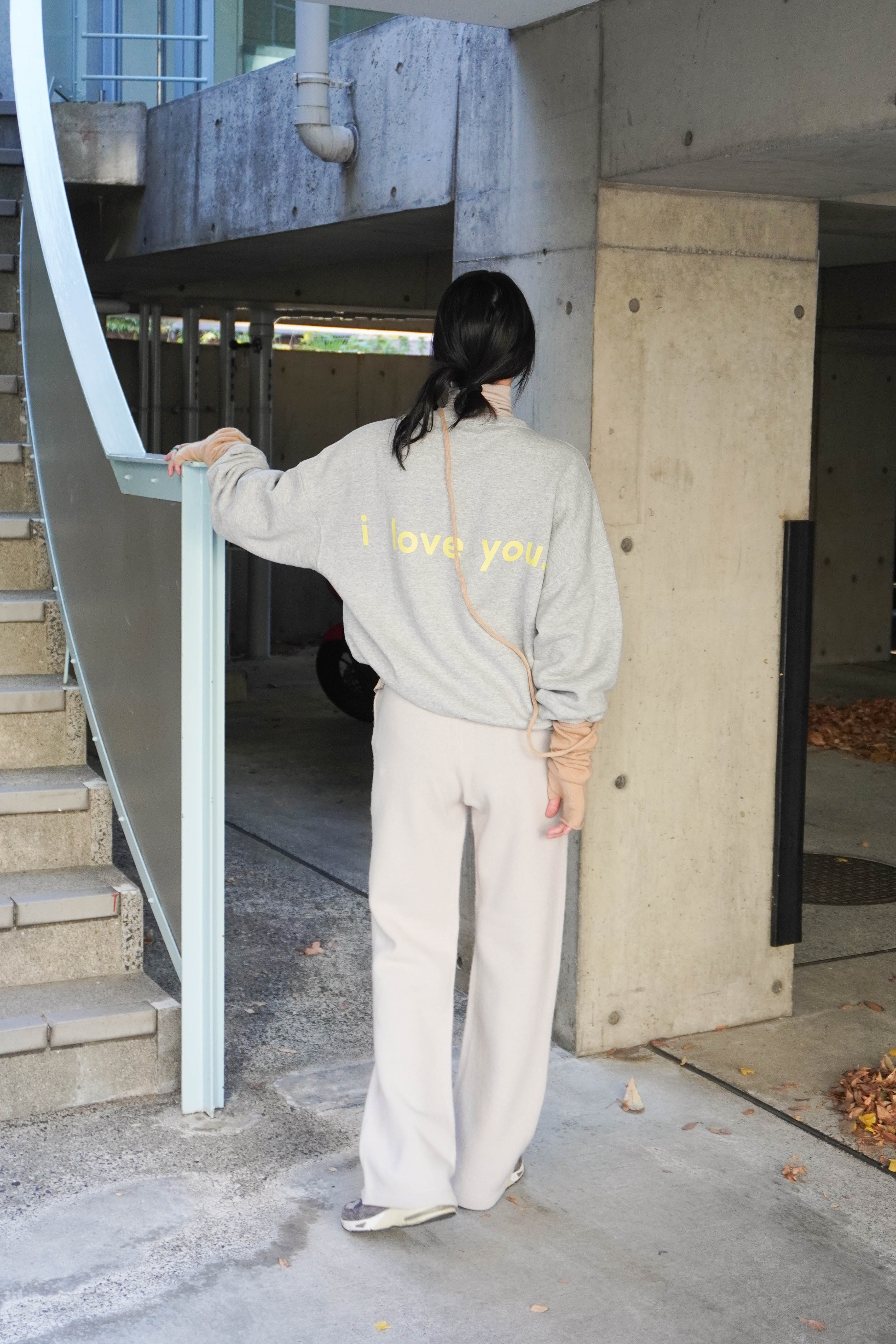 全体的に淡い色味でリラックスムードを演出。デザイン性のあるインナーを忍ばせて遊び心もプラス。I love you.のテキストカラーがワンポイントに。