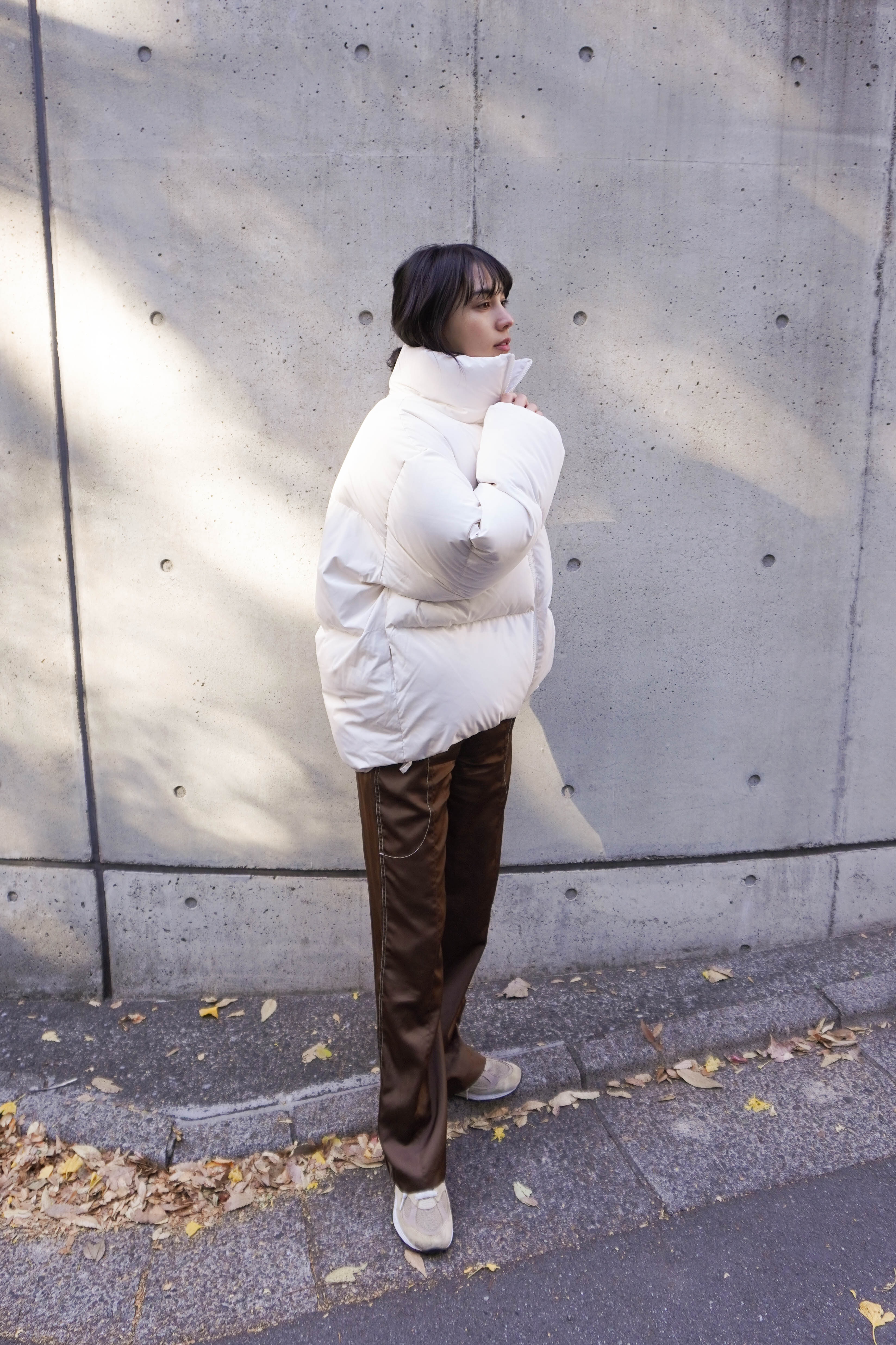 たっぷりとしたダウンにはストレートなパンツ合わせ。ダウンのややくすみぎみのホワイトに相性の良い2トーンのブラウンでバランス良くまとめて。