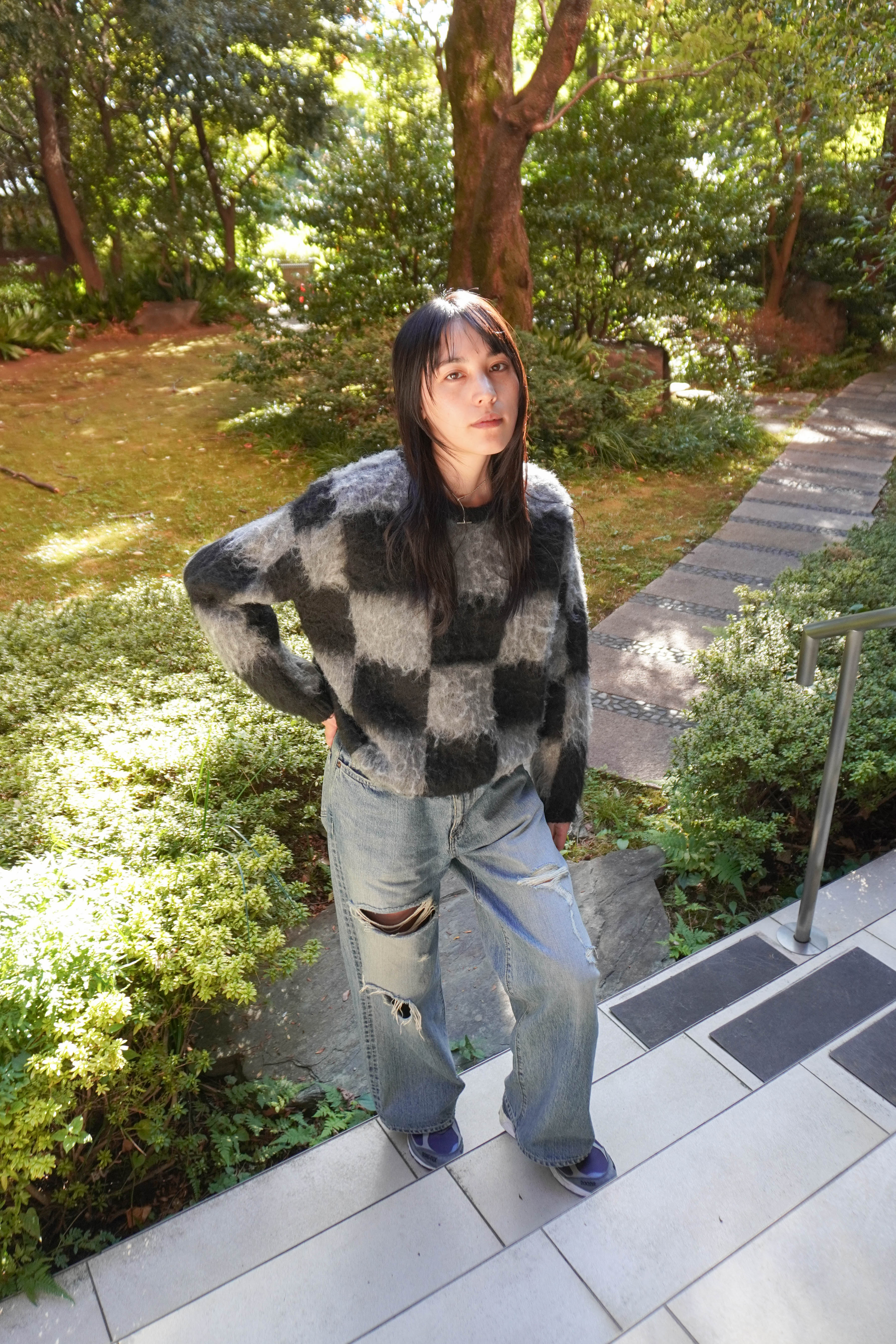 肉厚なシャギーニットにはダメージデニムを合わせて遊びのあるコーディネートに。