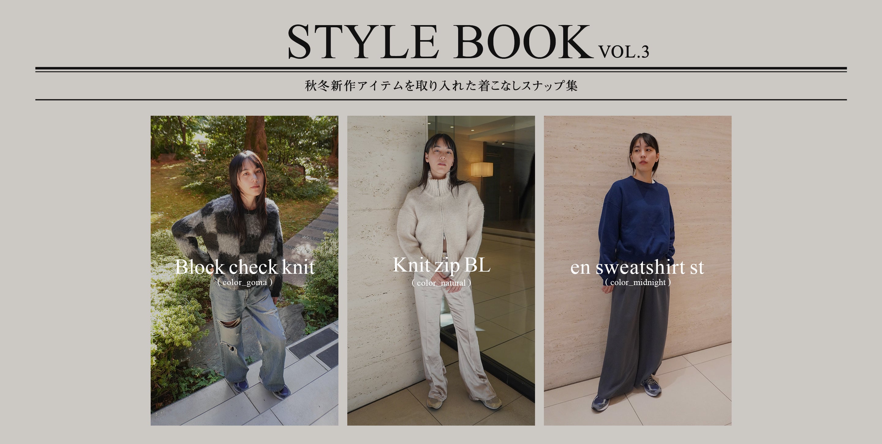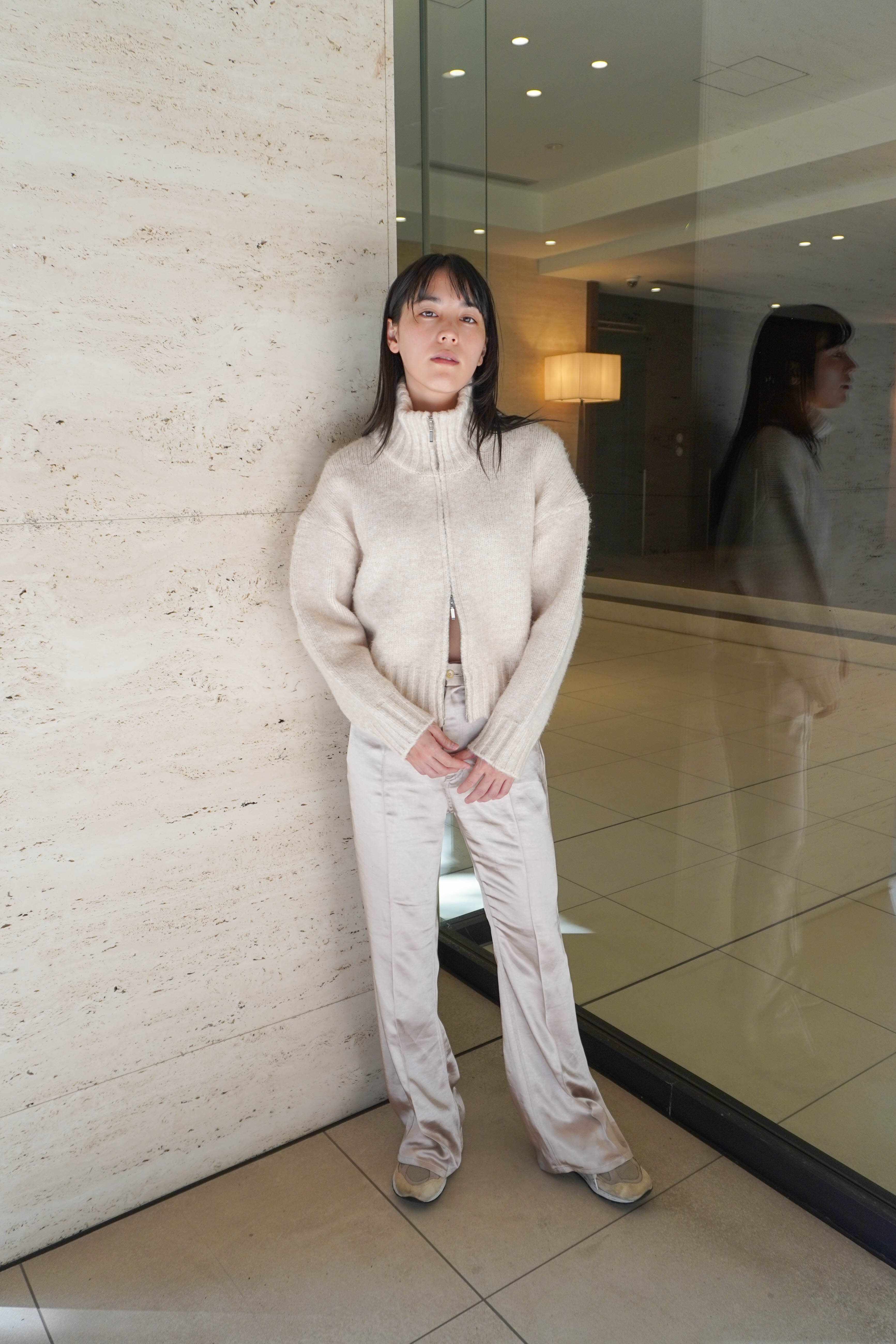 オフホワイトのワントーンコーデは異素材をミックス。マットな質感のニットと光沢感のあるサテン合わせでこなれた雰囲気に。ジップを開けたほんのり肌見せで抜け感をプラス。