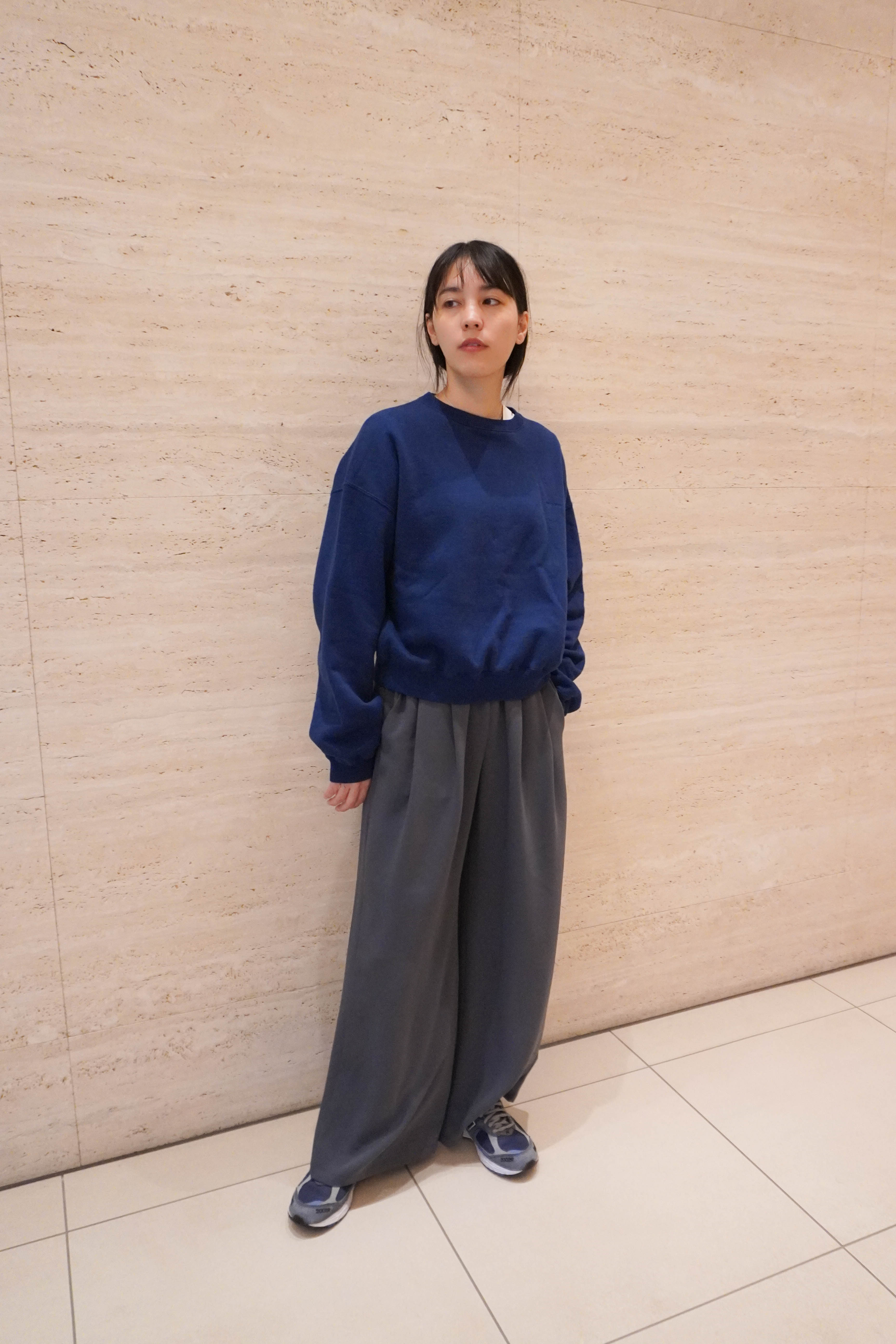 コンパクトなショート丈のスウェットに合わせるのは膨らみのあるスラックス。ネイビー×深めのグレーで大人カジュアルな着こなしに。