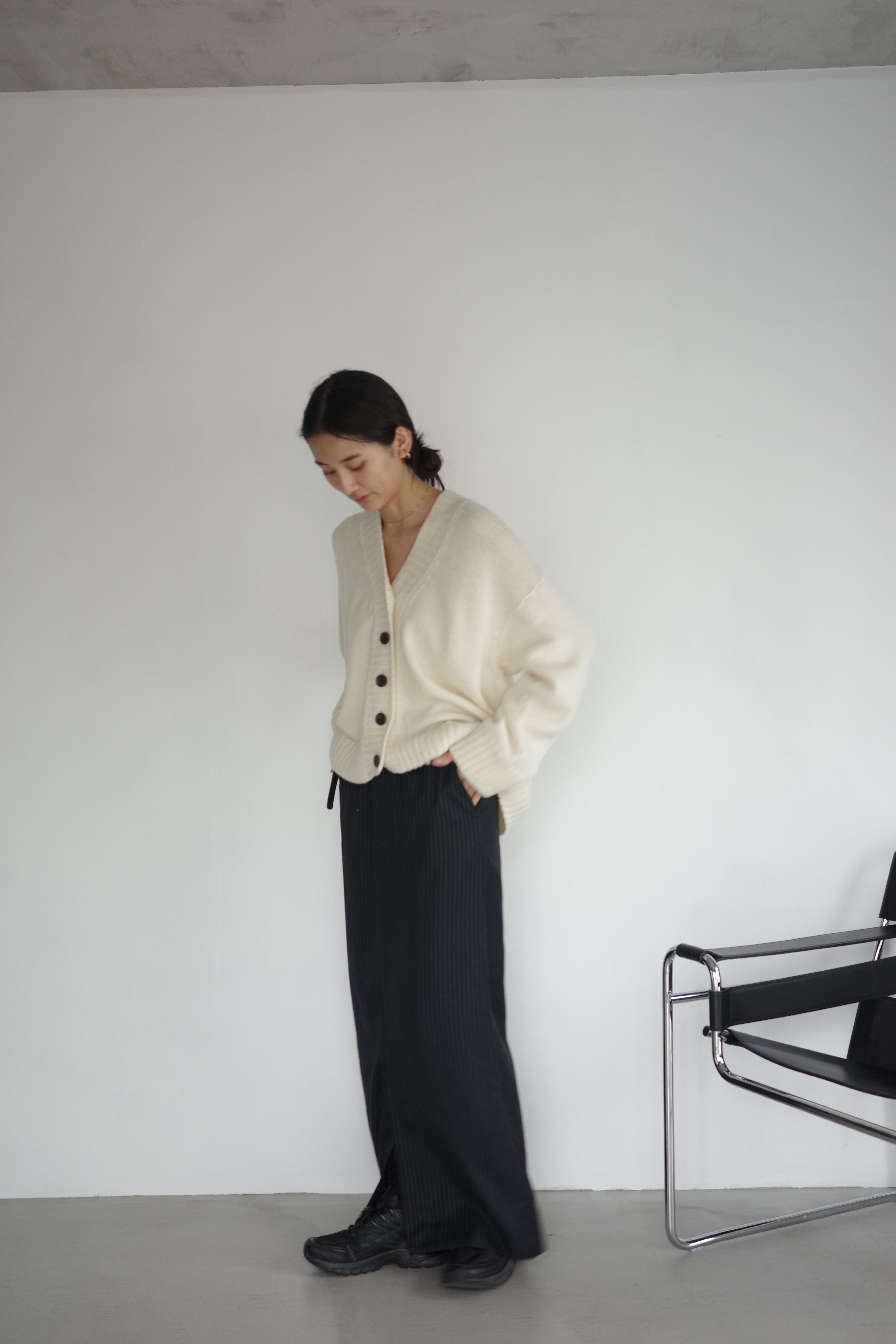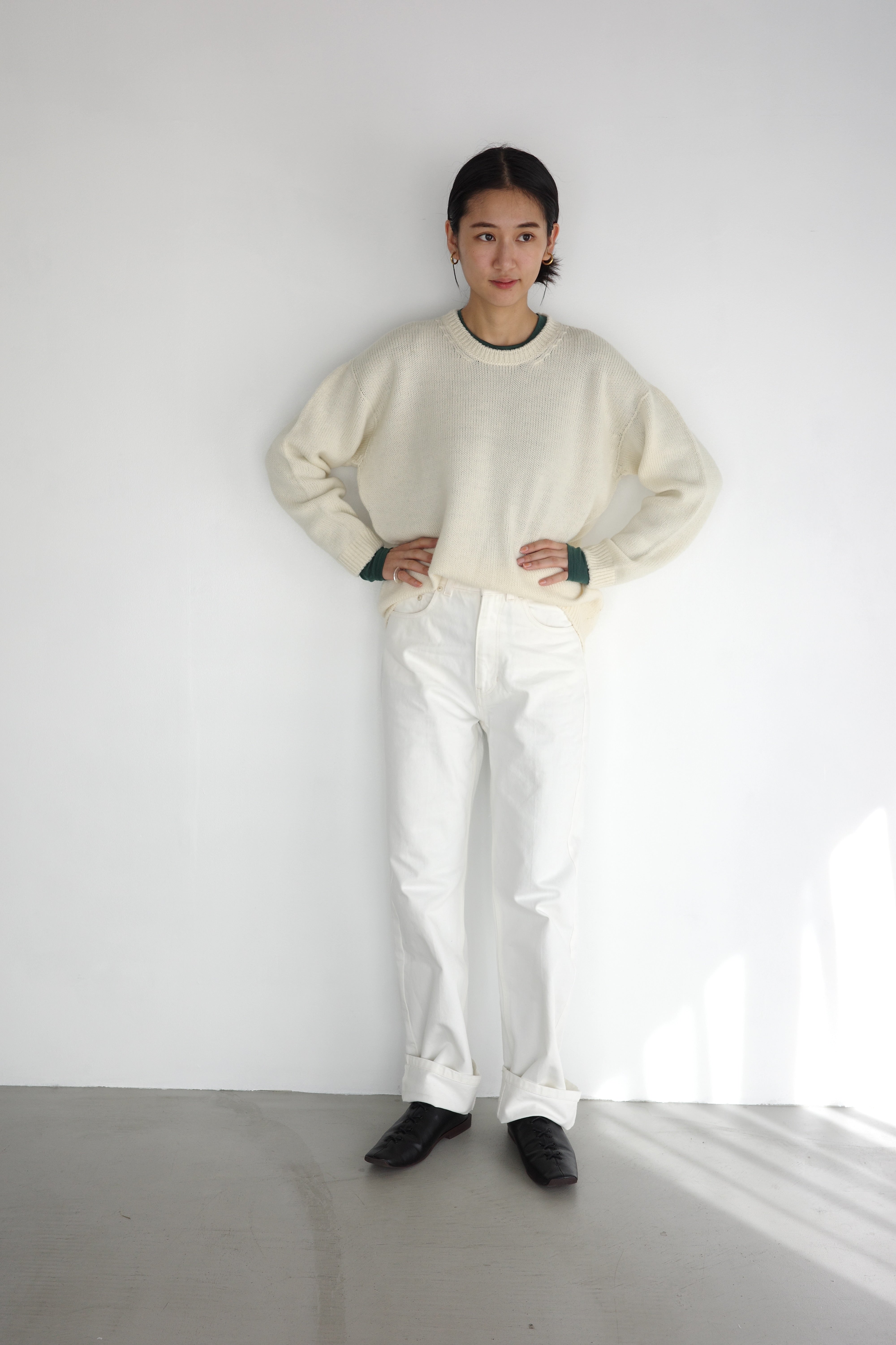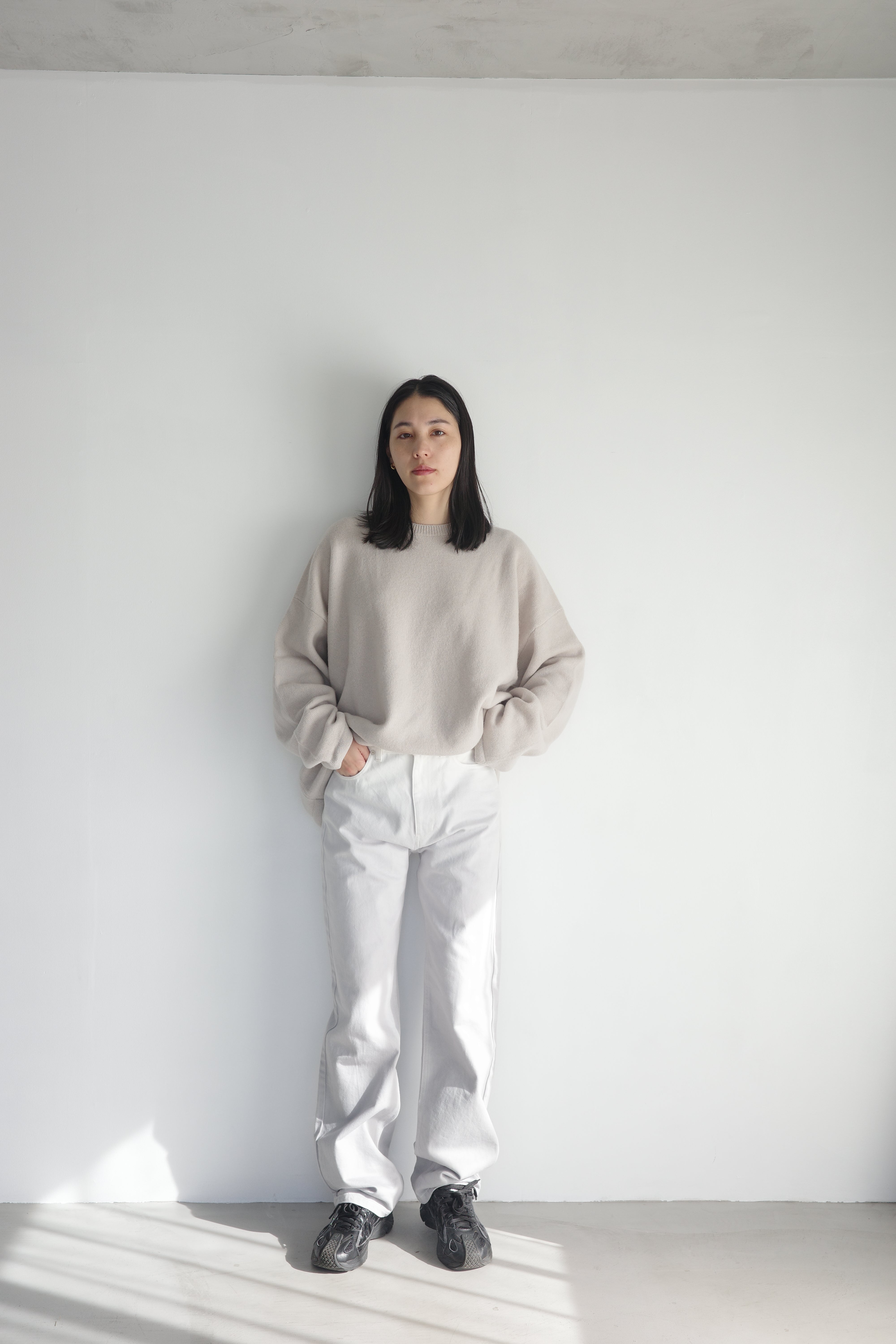 ウール100%のニットで大人のリラックスコーデ。肌への刺激が少なく、なめらかでソフトな風合いが魅力。ふわっと軽い仕上がりで、着心地の良さを追求したオーバーサイズのニット。 リラックス感がありながら、ラフになりすぎない絶妙なバランス。ホワイトデニムを合わせることで、色のコントラストが映え、洗練されたおしゃれ上級者なスタイリングに。