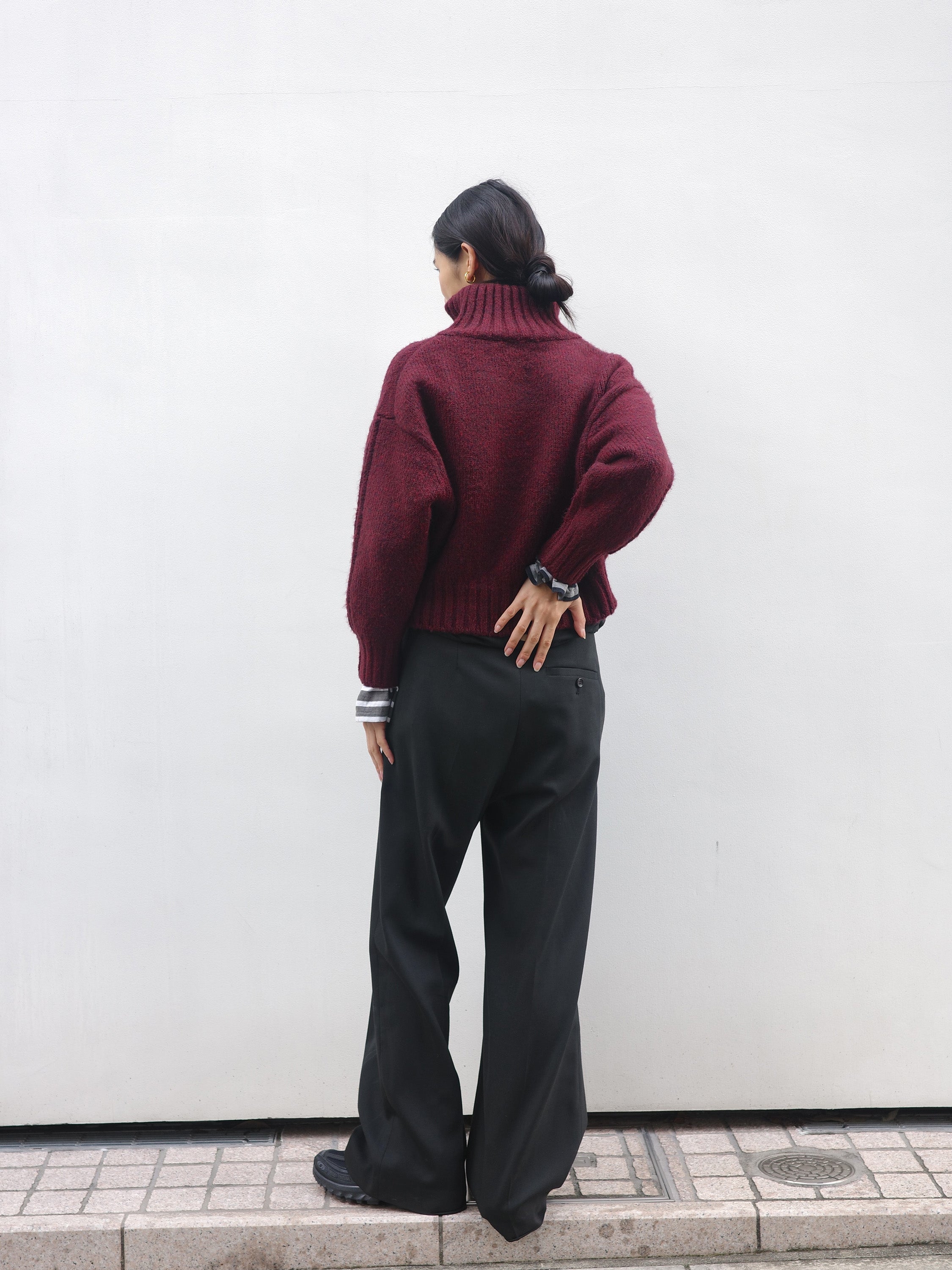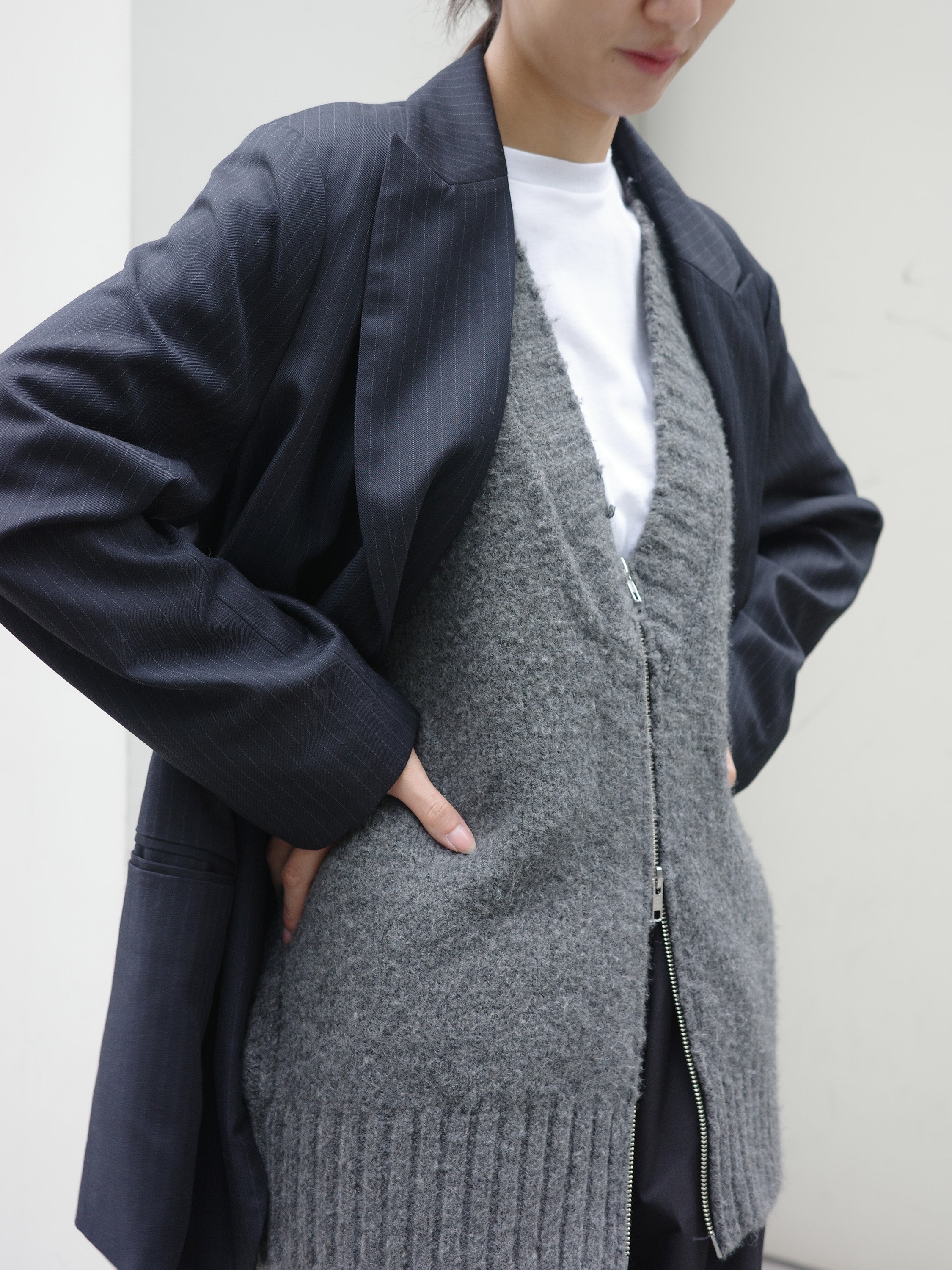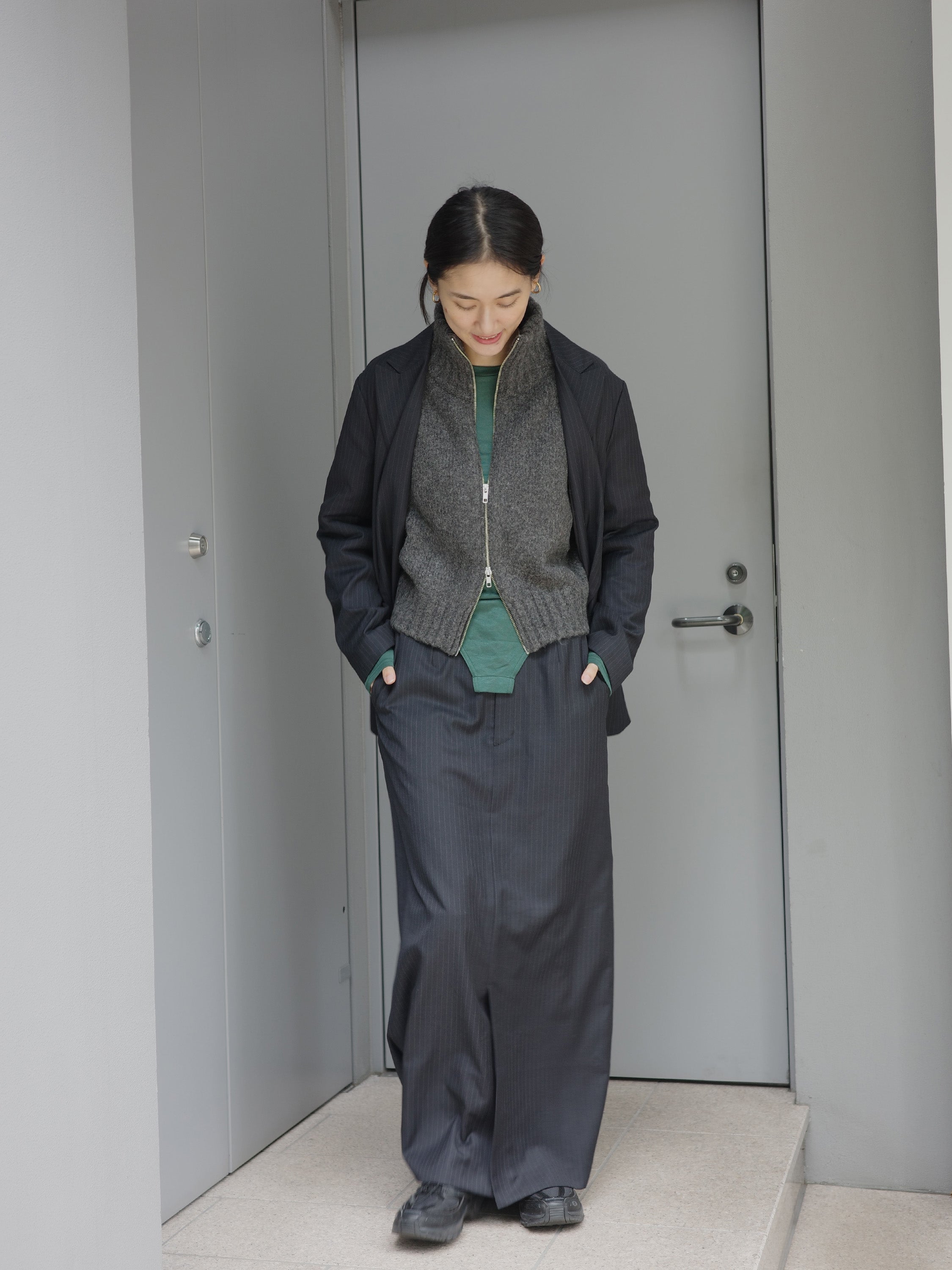 スラックスと合わせてシンプルにENCIRCLEらしいスタイリングに。ニットは保湿性に優れた高品質な素材を使用しているため、ハイネック部分を立たせれば、暖かさが一層感じられます。シンプルながらも快適さと実用性を兼ね備えたニットジップベストは、寒い季節に一枚で主役にしても、レイヤードスタイルとしても、様々なコーディネートを楽しんでいただけます。