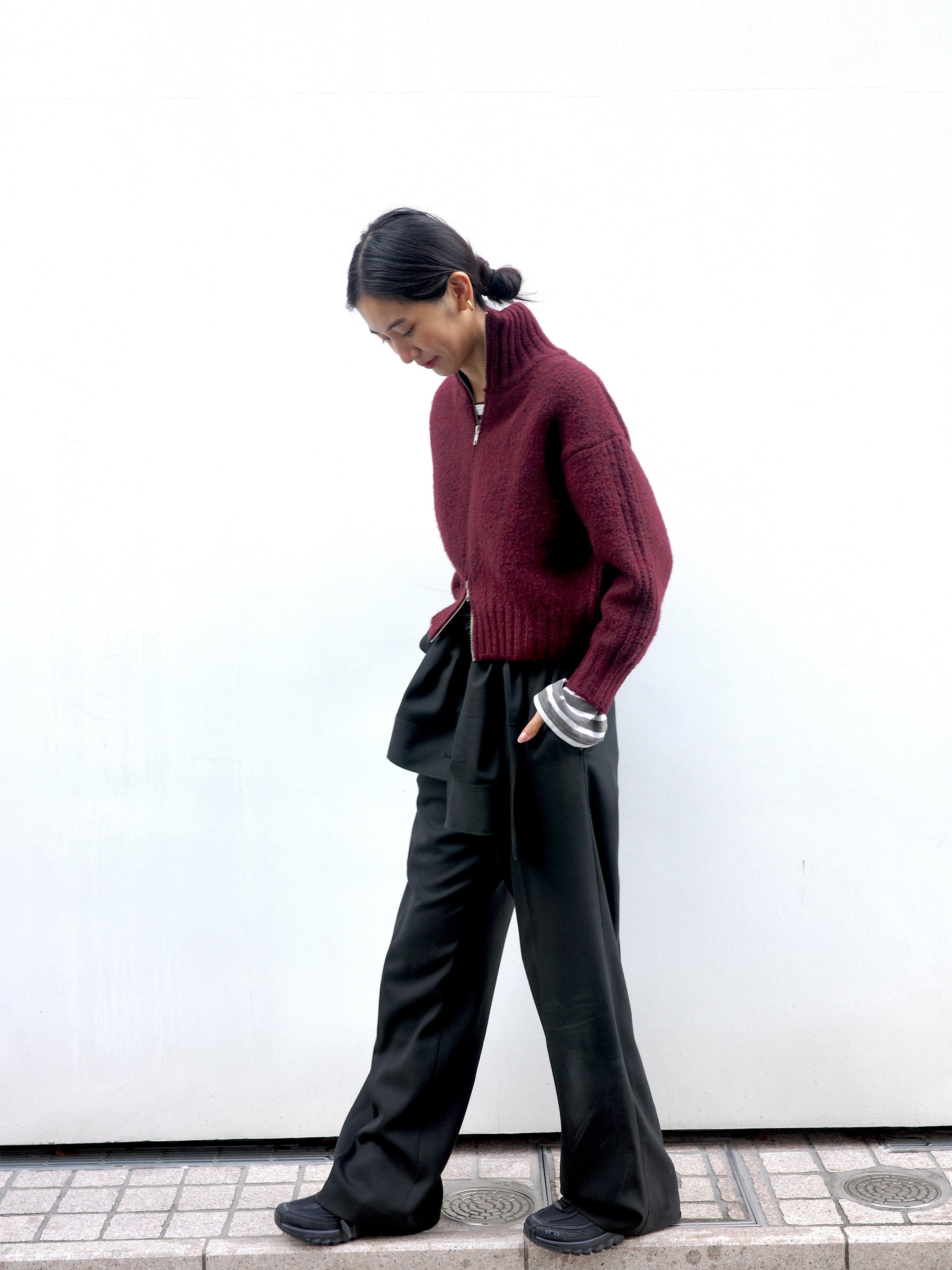 ボルドーのニットジップベストを主役にした秋コーデ。スカート×パンツと異素材のアイテムをミックスすることで、トレンドを意識しながら個性的なスタイリングに。