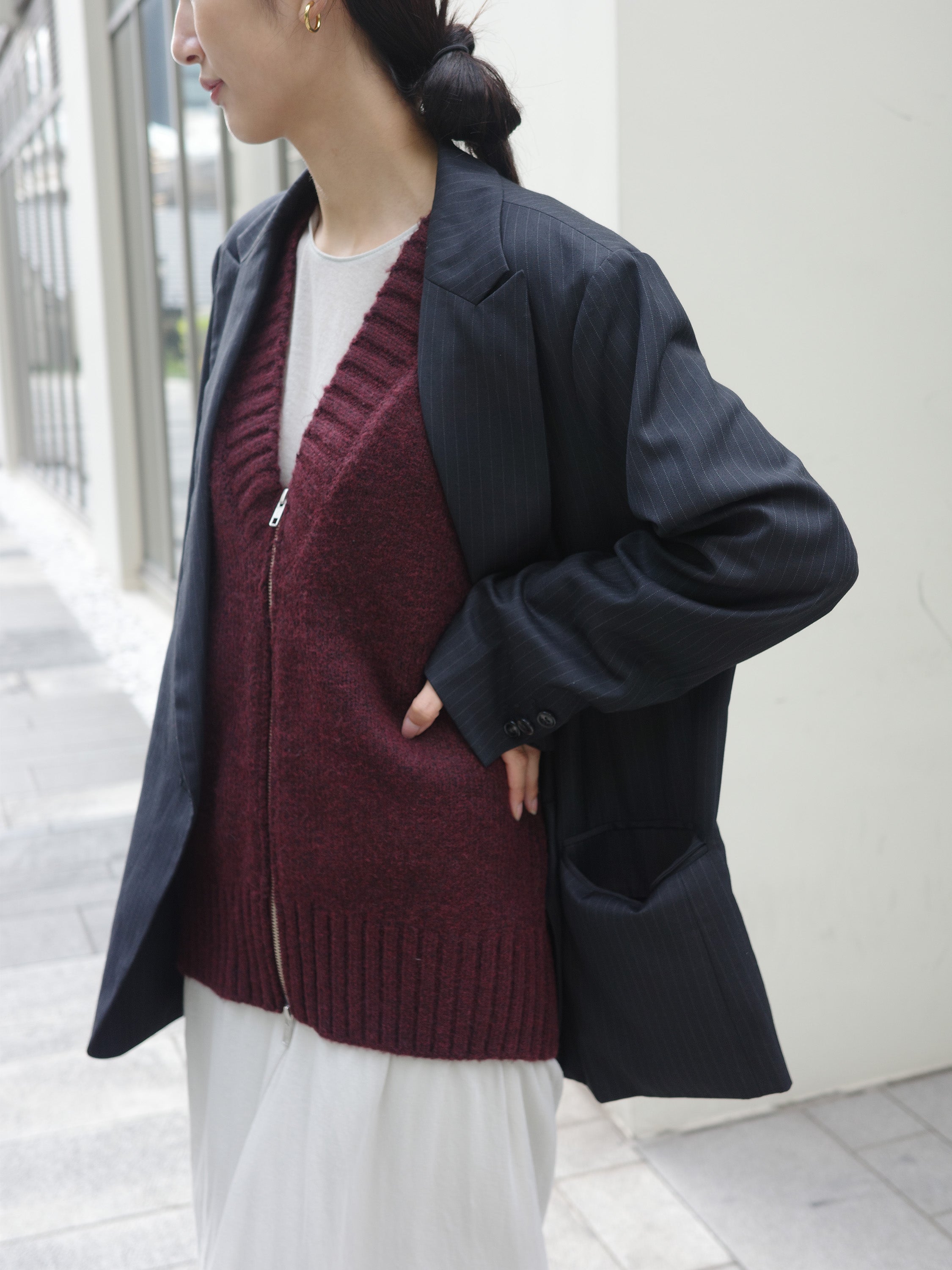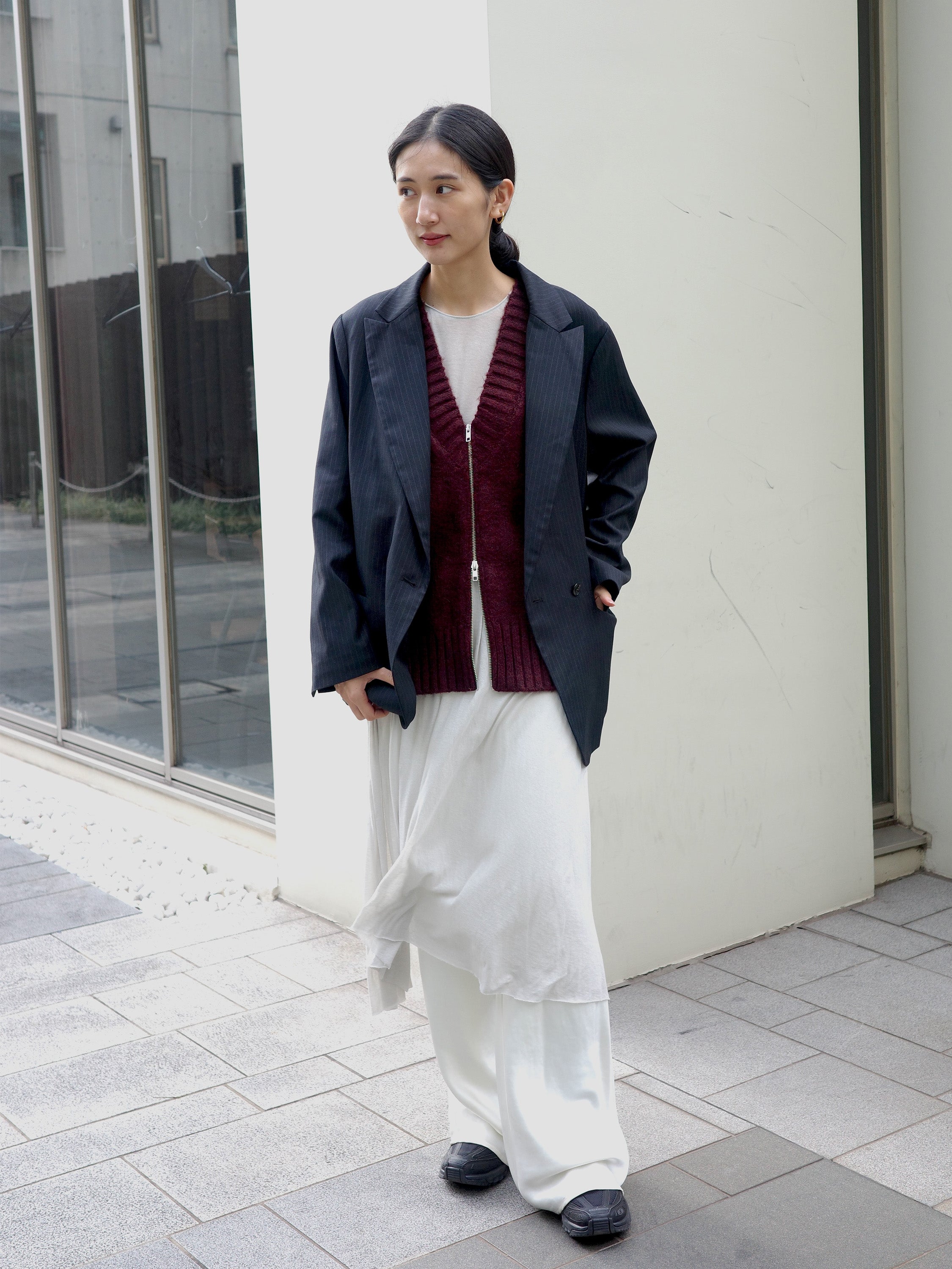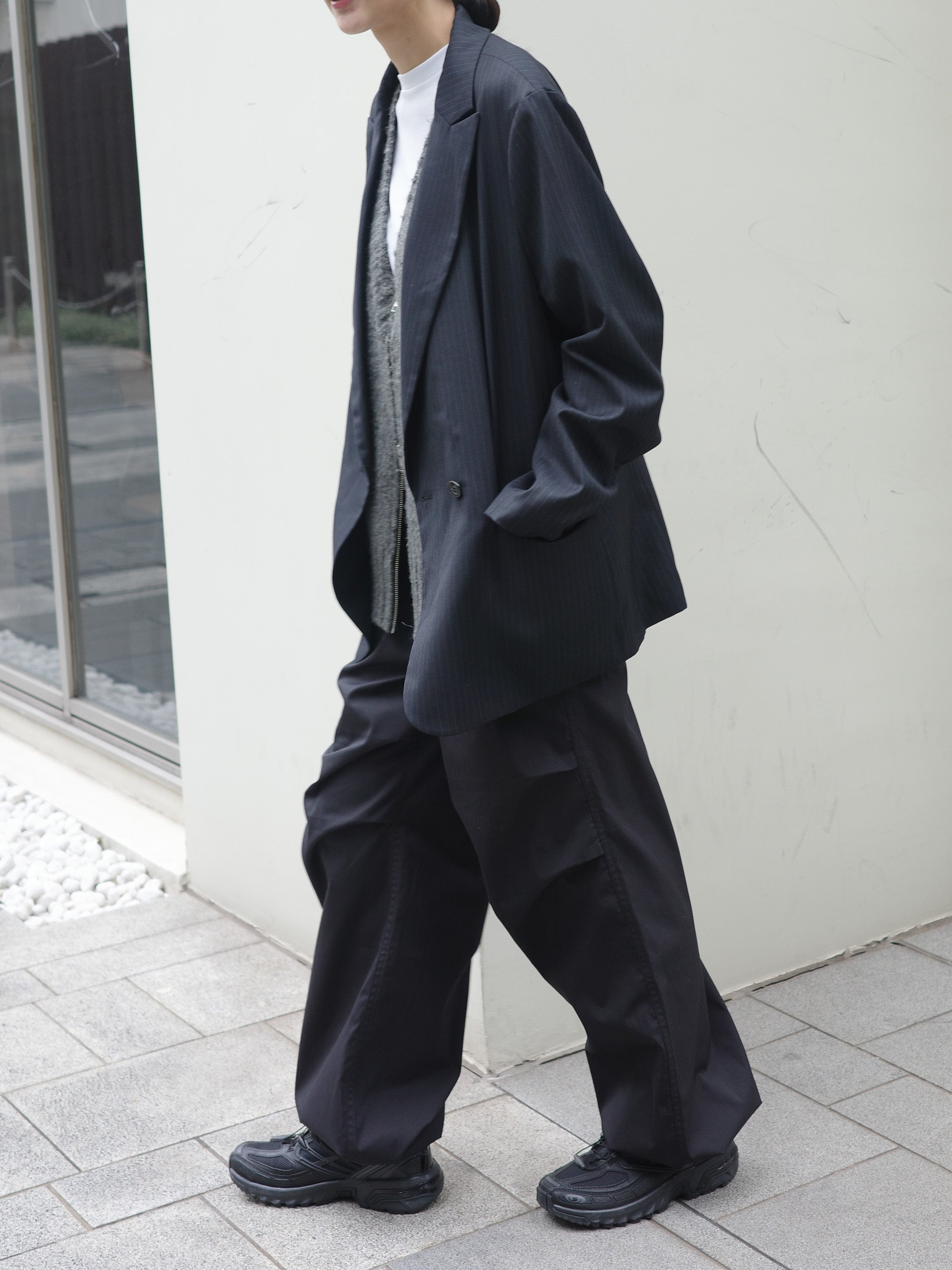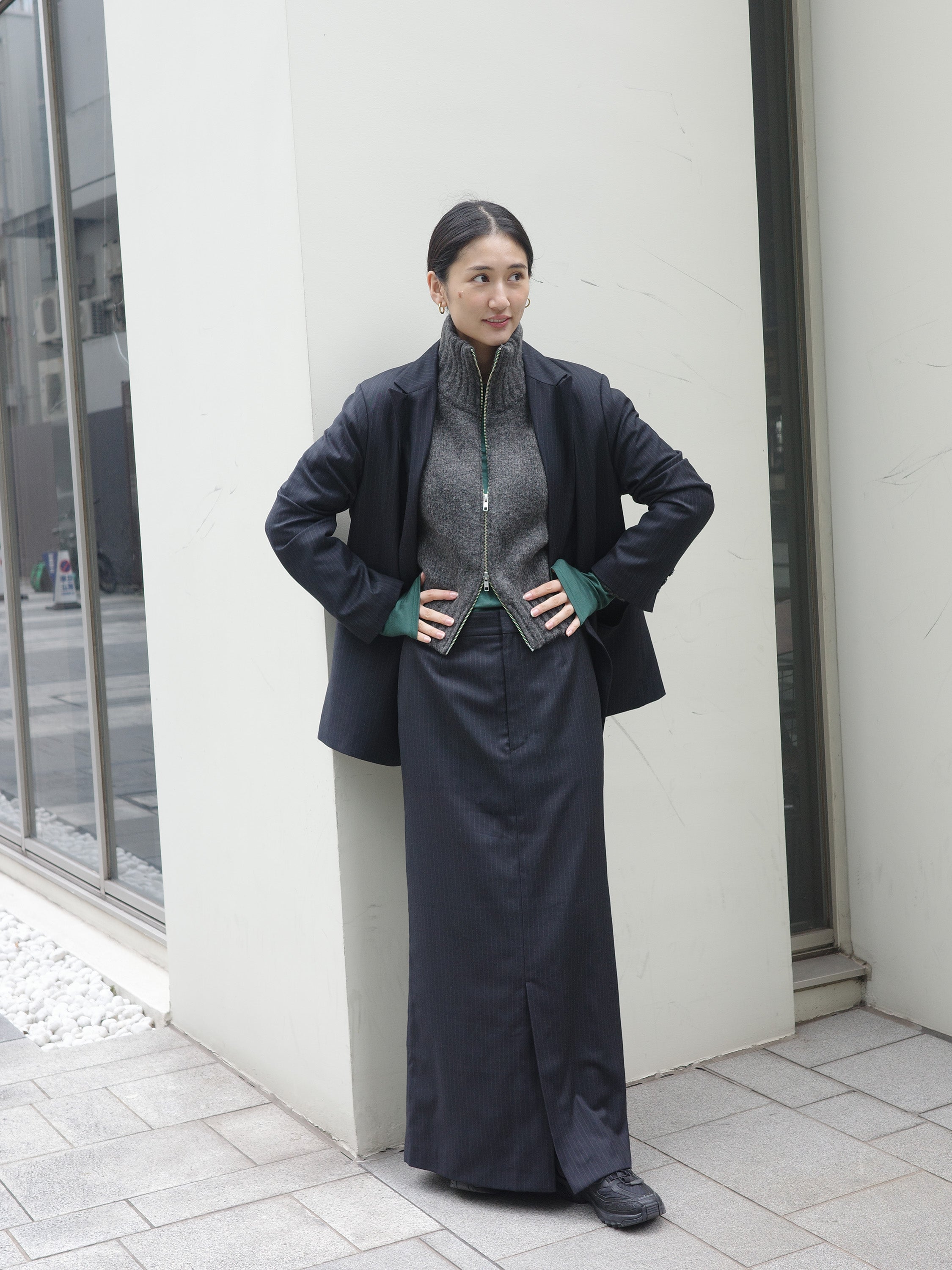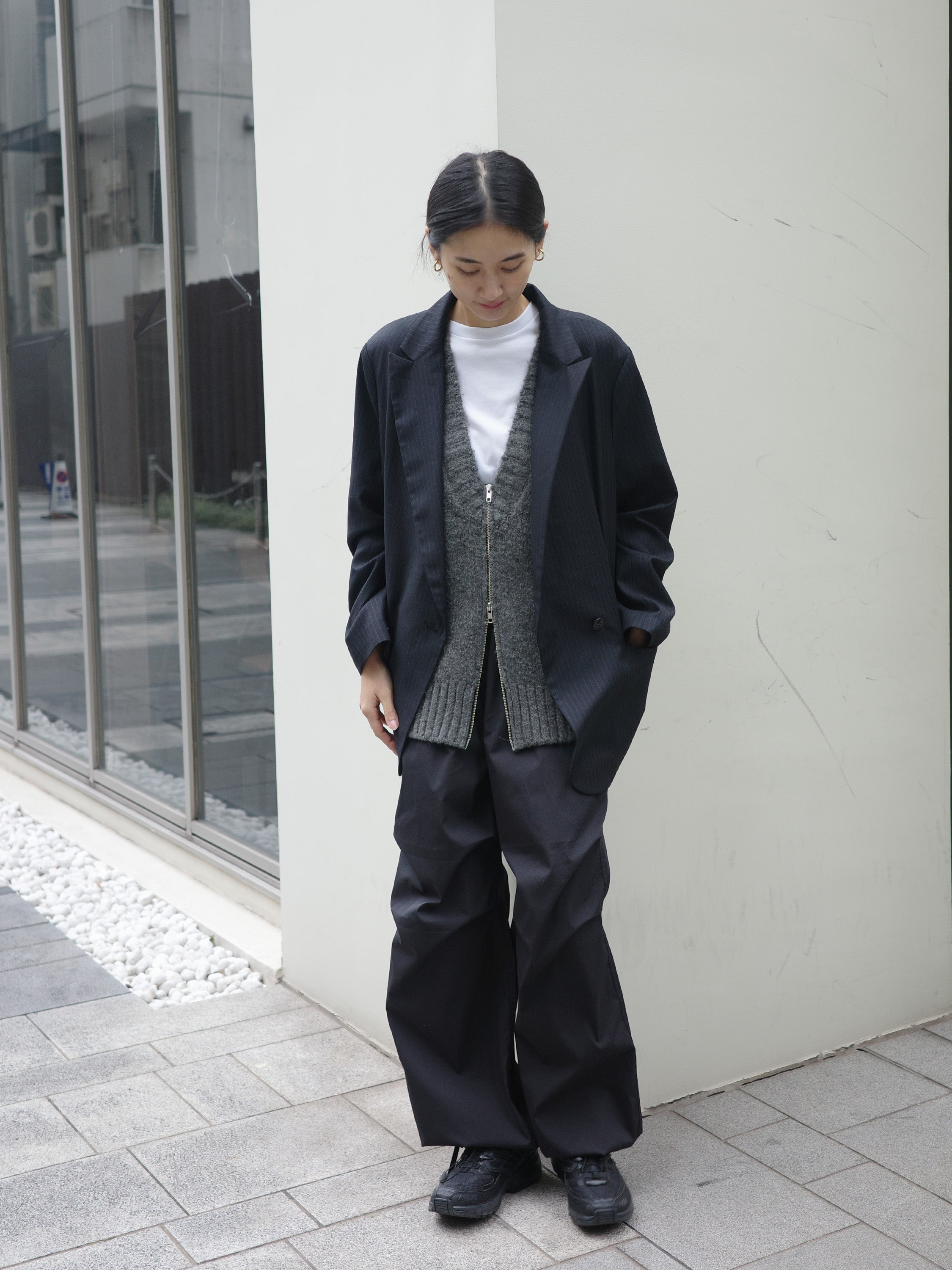 ネイビーのジャケットにボリュームのあるパンツとスニーカーを組み合わせた、メンズライクなコーディネート。首元が空いているグレーのニットジップベストで抜け感を作り重くなりすぎないよう、全体をバランスをまとめました。リラックスしながらも洗練されたスタイルでこなれ感を演出するコーディネートです。