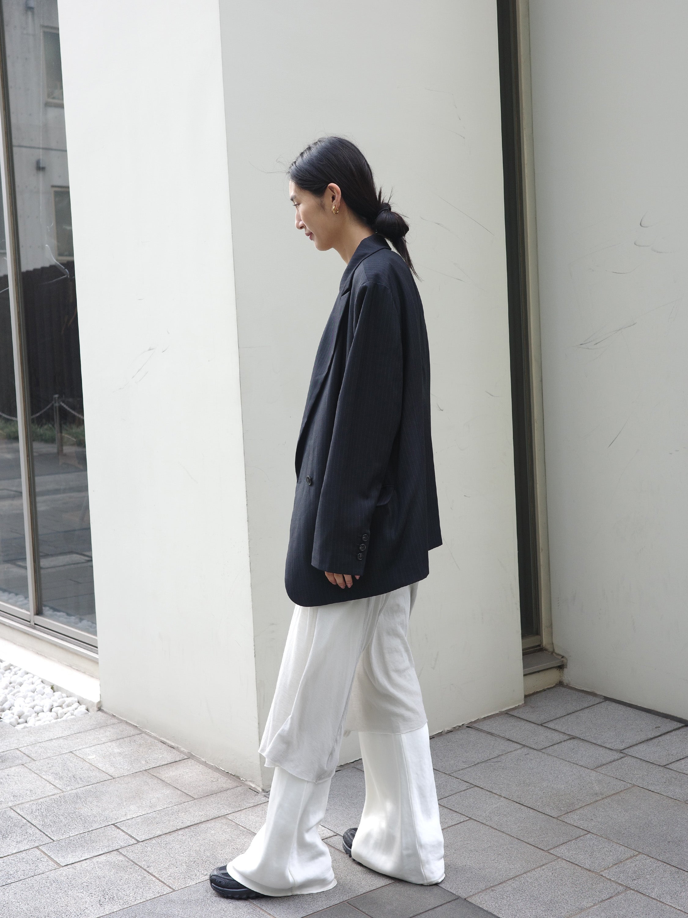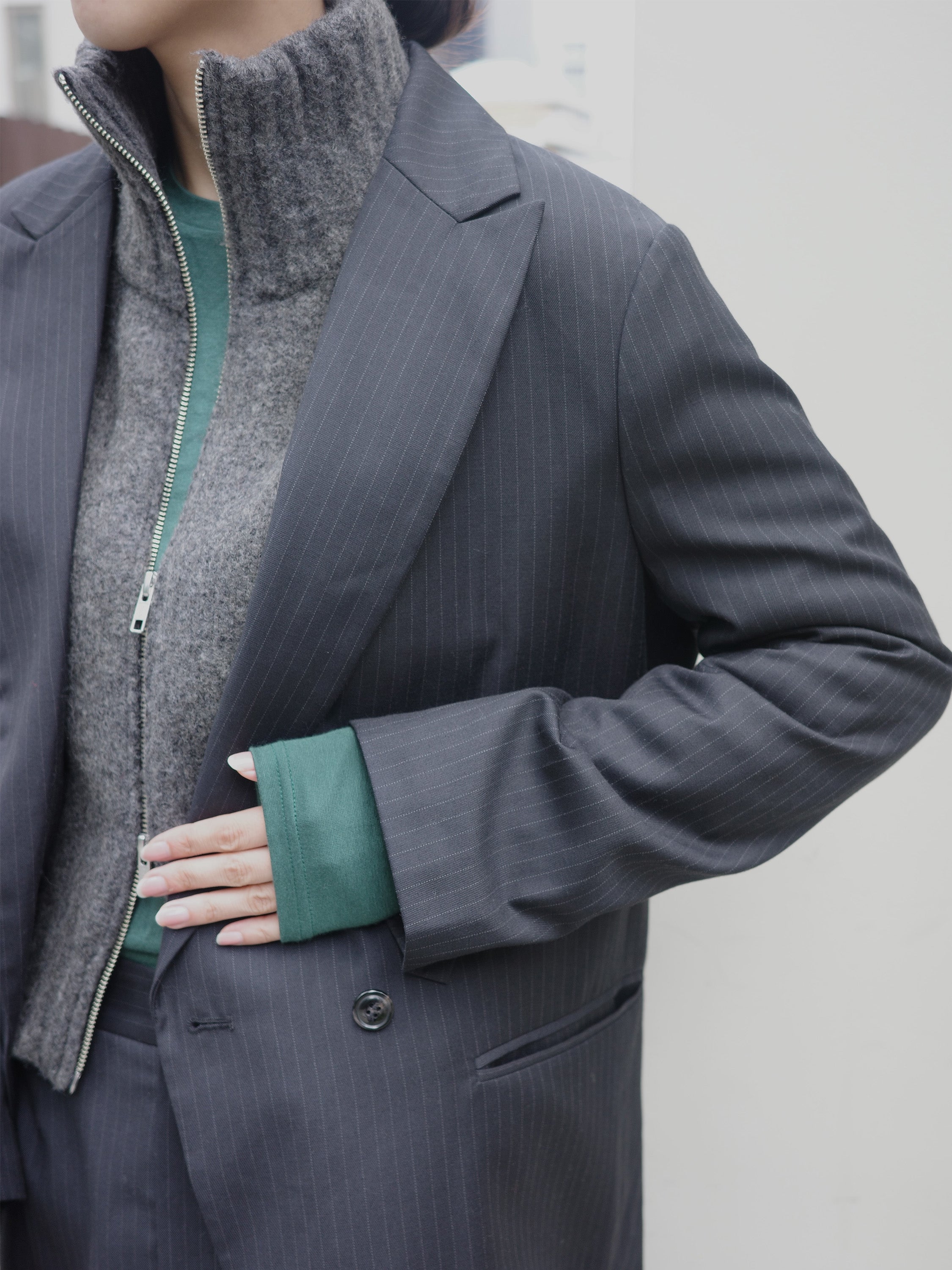 ルーズ ピンストライプのセットアップに、ほどよいショート丈のニットジップブルゾンを合わせたコーディネート。落ち着いたセットアップに動きを加えるブルゾンで、程よいカジュアルさを演出します。インナーにパキッとしたカラーを取り入れることで、全体のスタイルが引き締まり、メリハリのある印象に仕上がります。シンプルながらも個性を感じさせる、大人のリラックスモードが楽しめるコーディネートです。